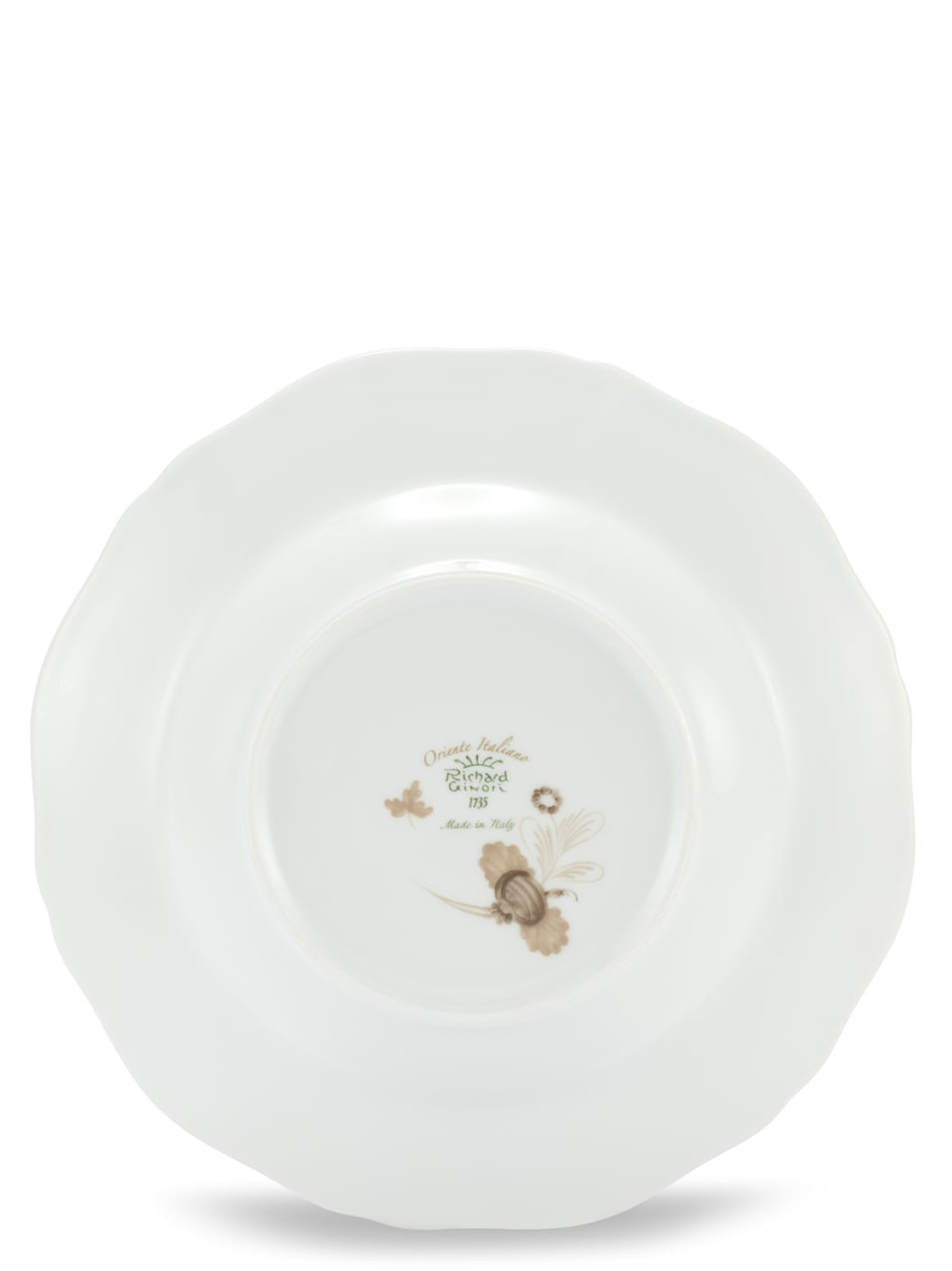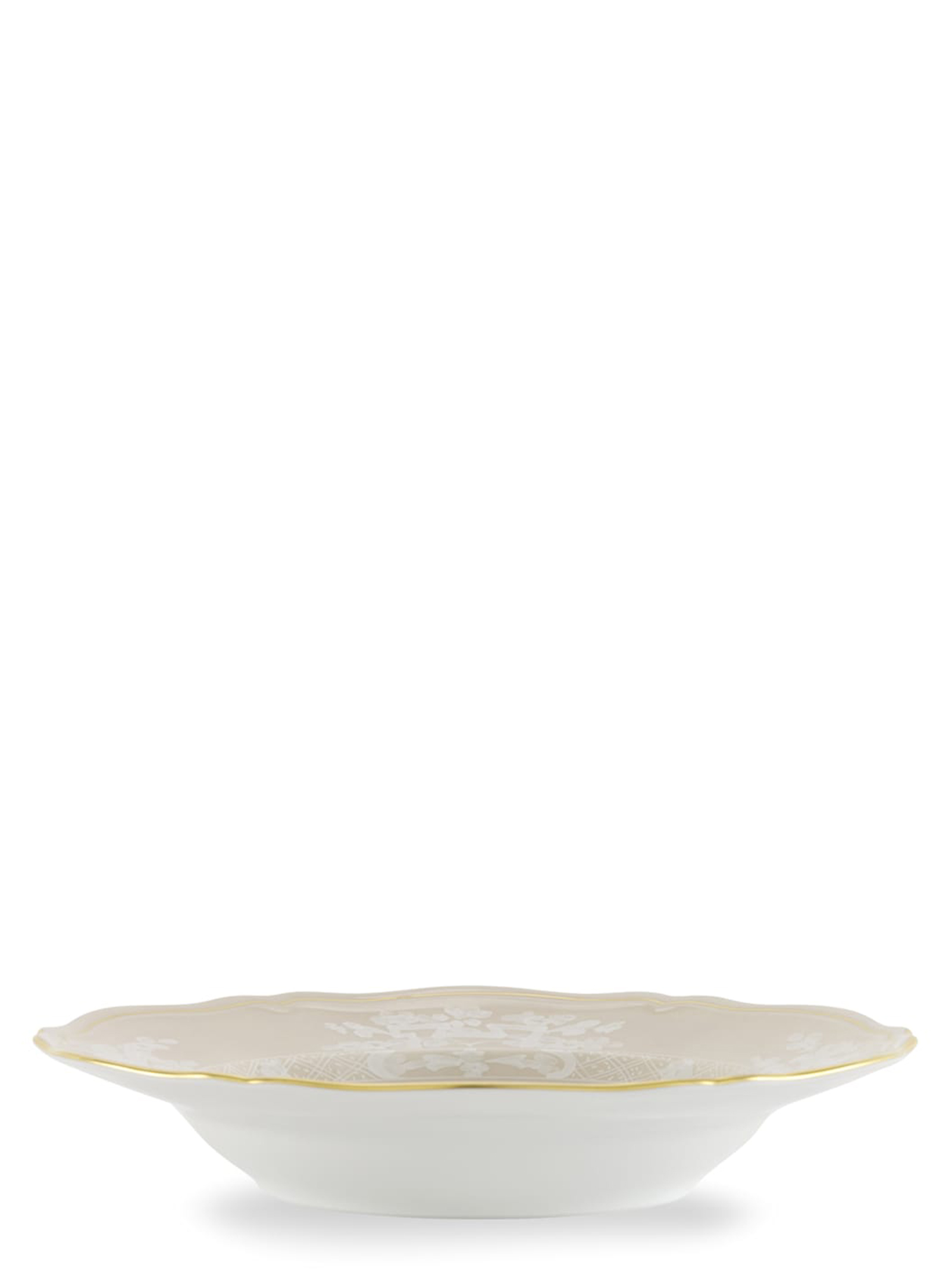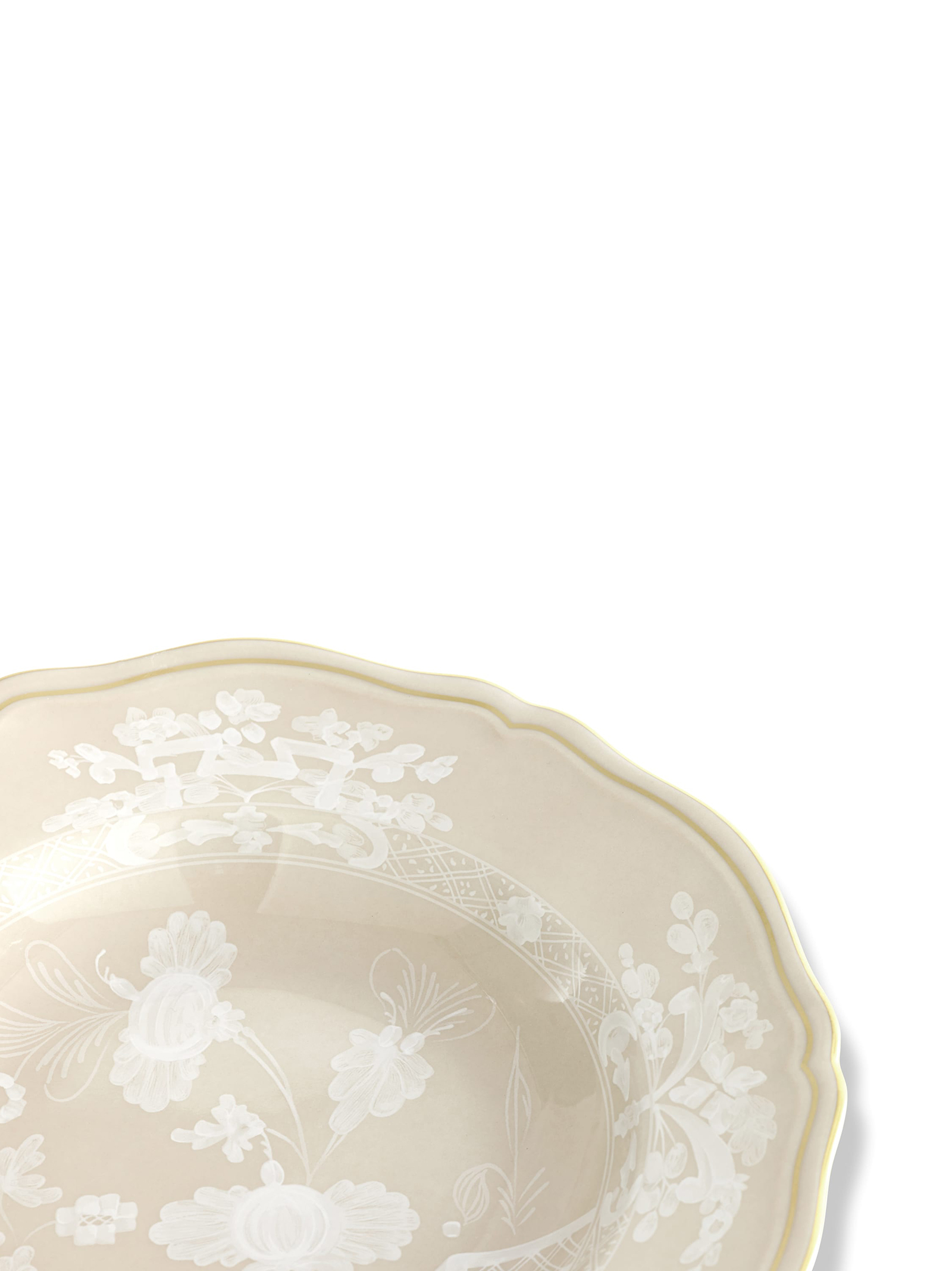 Porcelain soup plate with meringue decoration and gold thread. 'Oriente Italiano' collection. Not suitable for microwave. Dishwasher safe with gentle cycle.