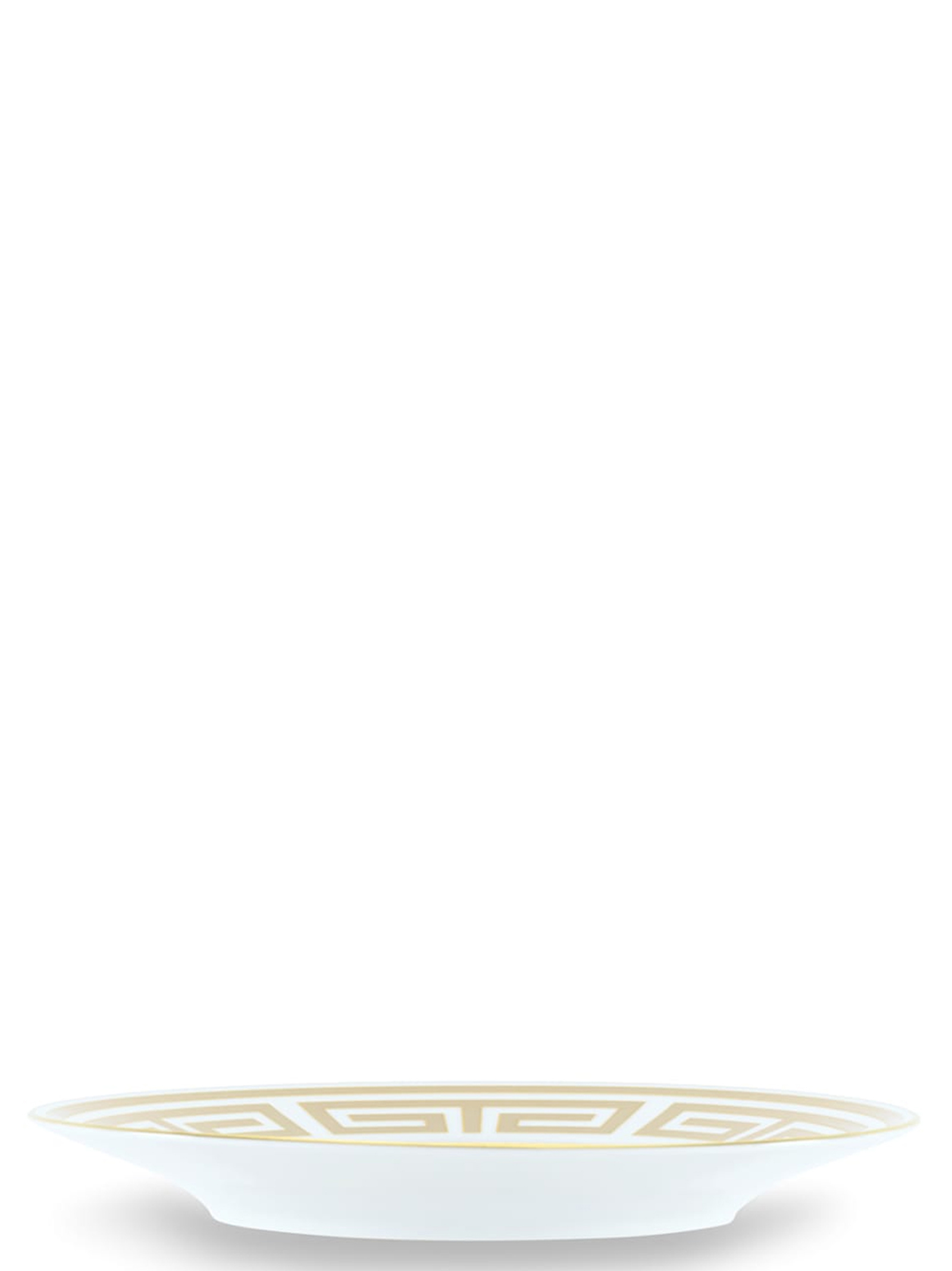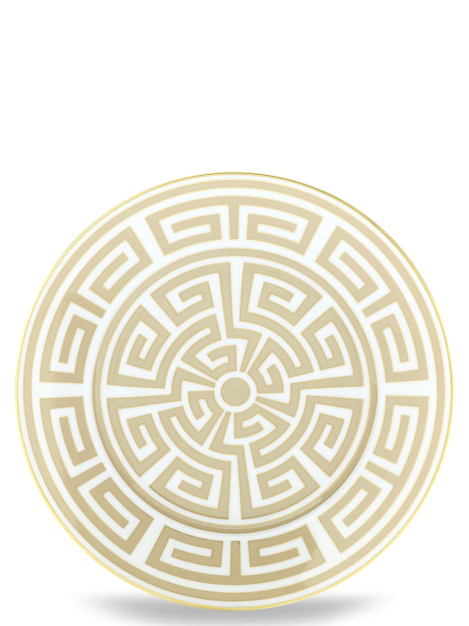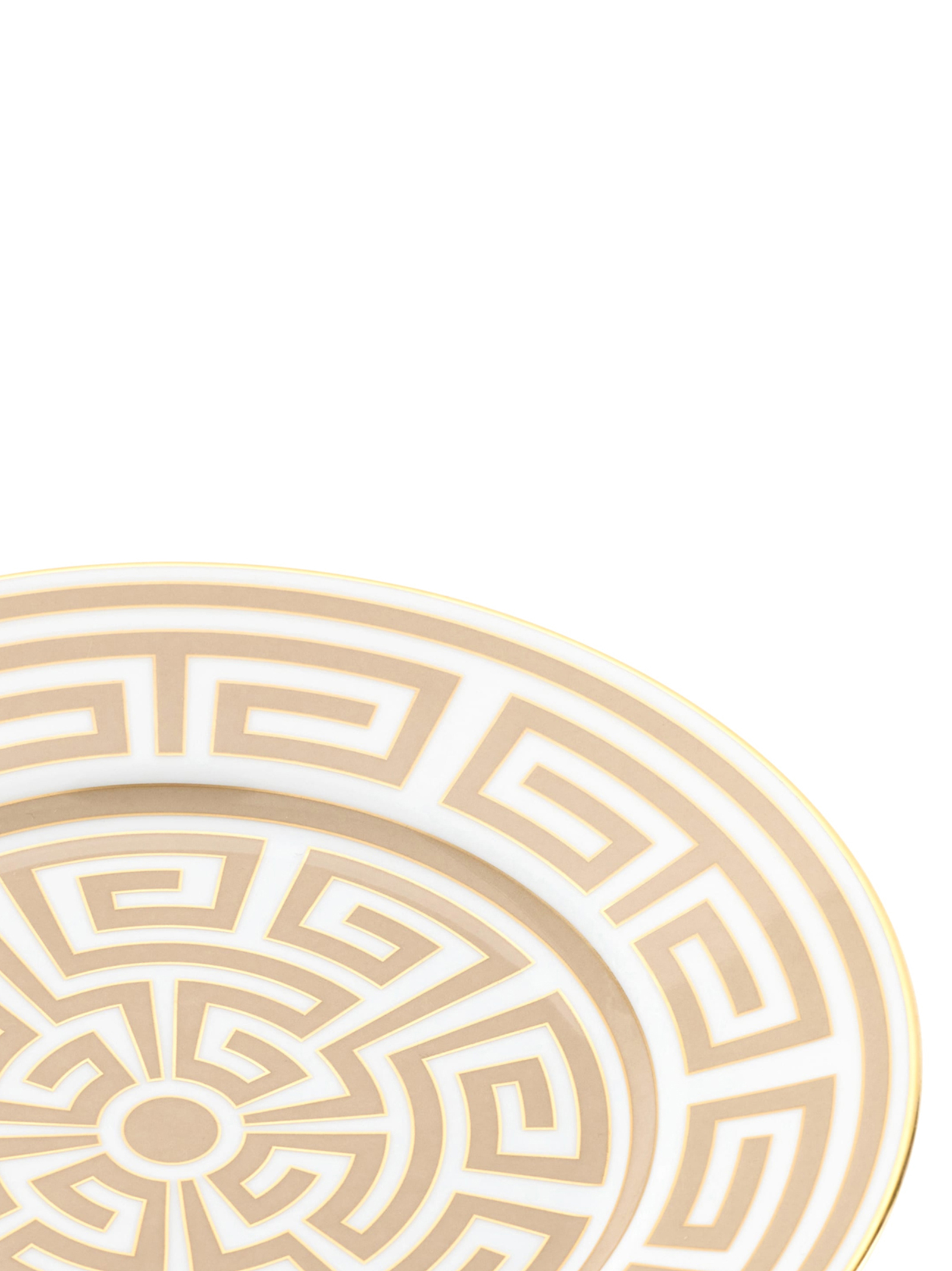 Porcelain dessert plate with beige Cachemire decoration and gold thread. 'Labirinto' collection by Gio Ponti. Not suitable for microwave. Dishwasher safe with gentle cycle.