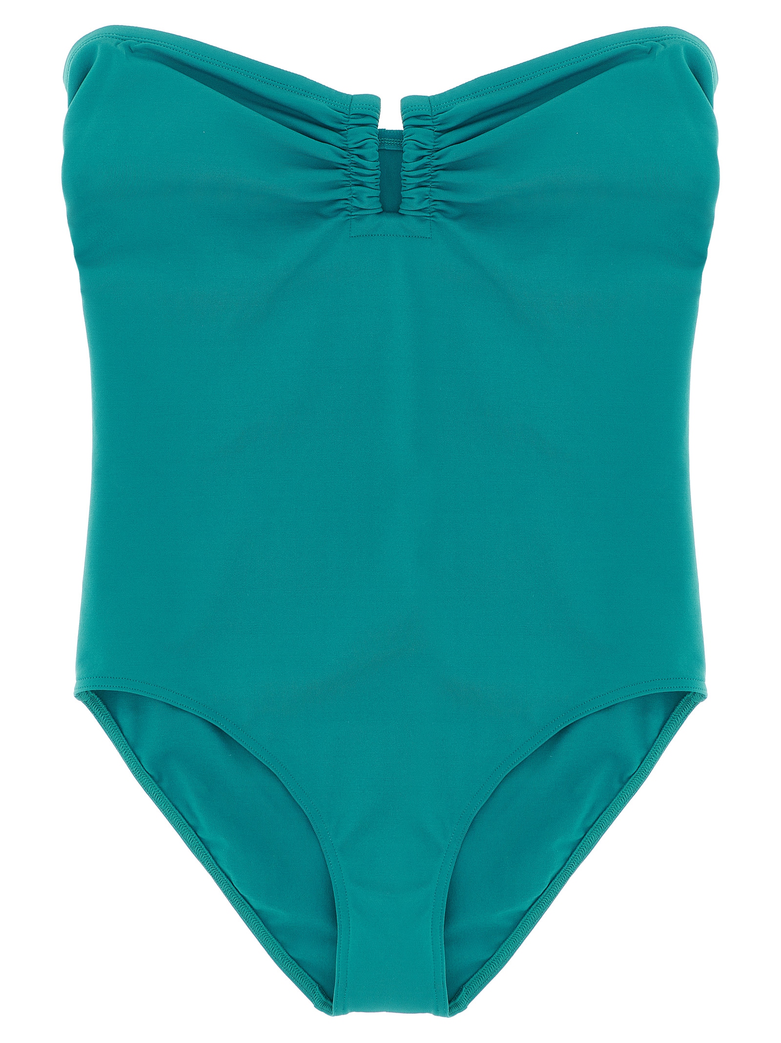 'Cassiopée' one-piece swimsuit in Peau Douce* fabric, off-the-shoulder style with cups separated by a U-shaped underwire.
