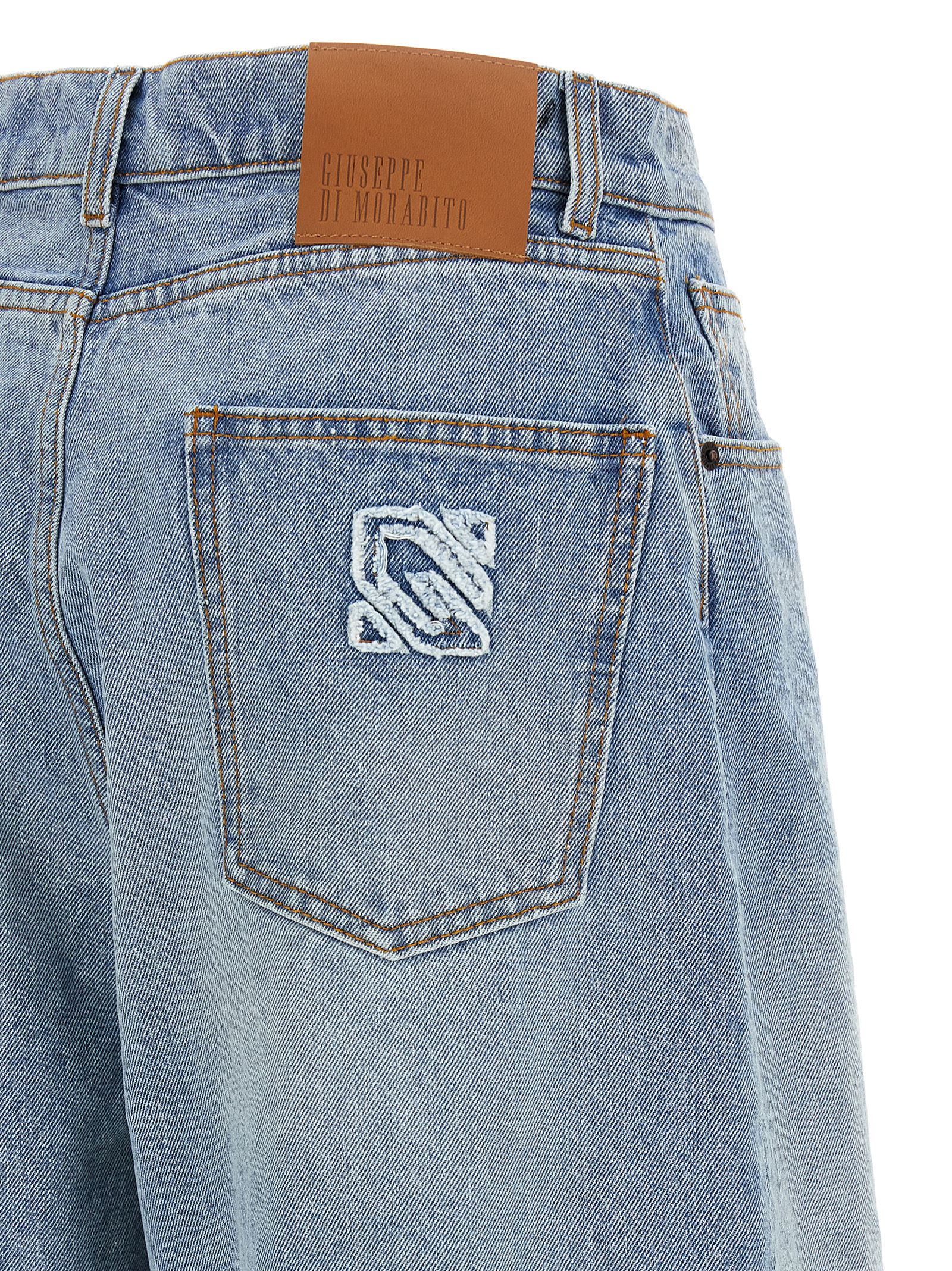 Ensemble consisting of cotton denim jeans bermudas, contrast stitching, wide leg, front zip and button closure, five pockets, logo intarsia and back leather logo tag and stretch fabric leggings with all-over crystal application, elastic waistband, flared leg, lining.