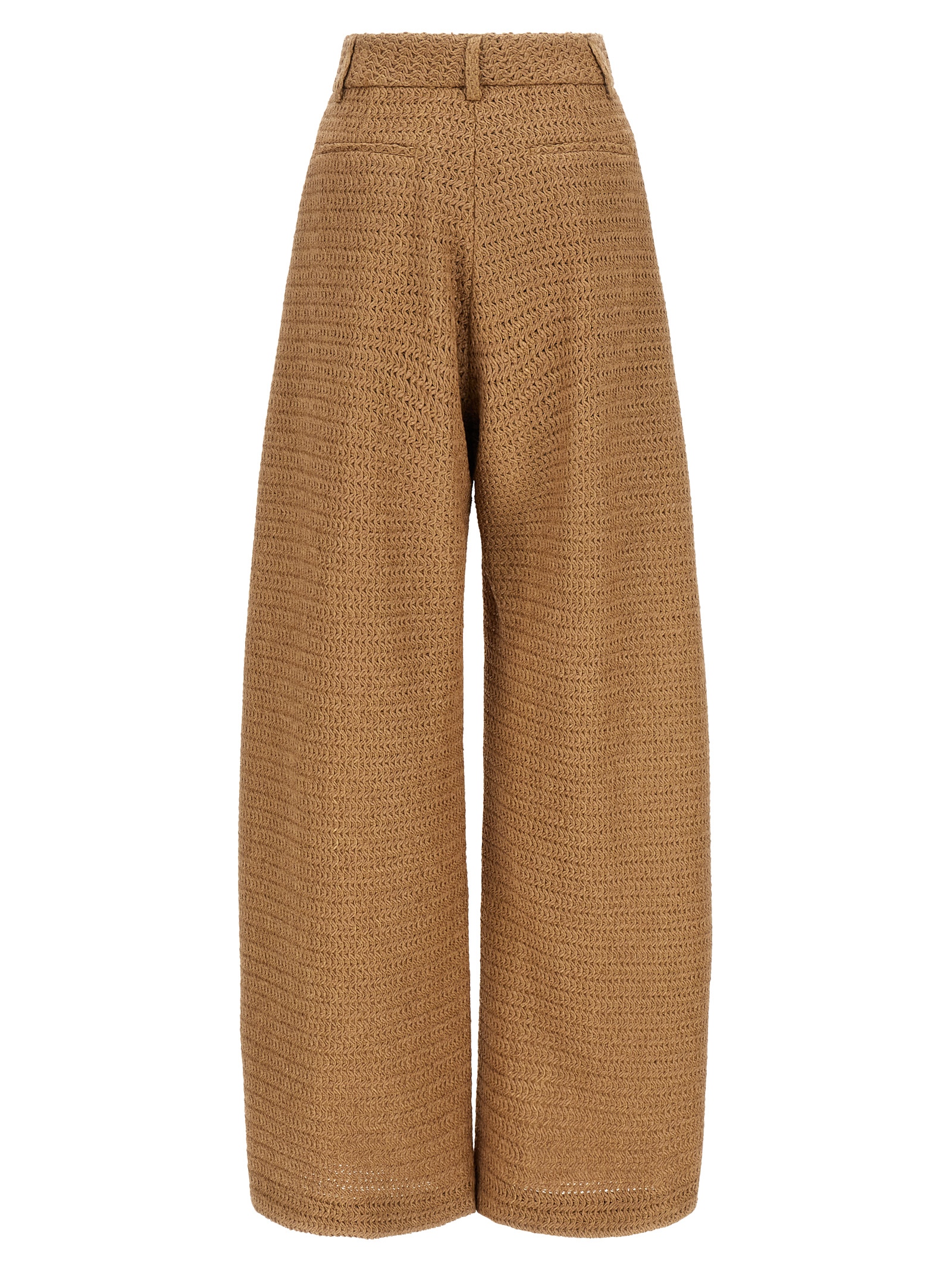 Braided raffia-effect fabric trousers, tailored model, wide leg, hook and front button zip closure, pockets, tone-on-tone semi-transparent organza lining. Handcrafted product, any imperfections are to be considered characteristics of uniqueness.