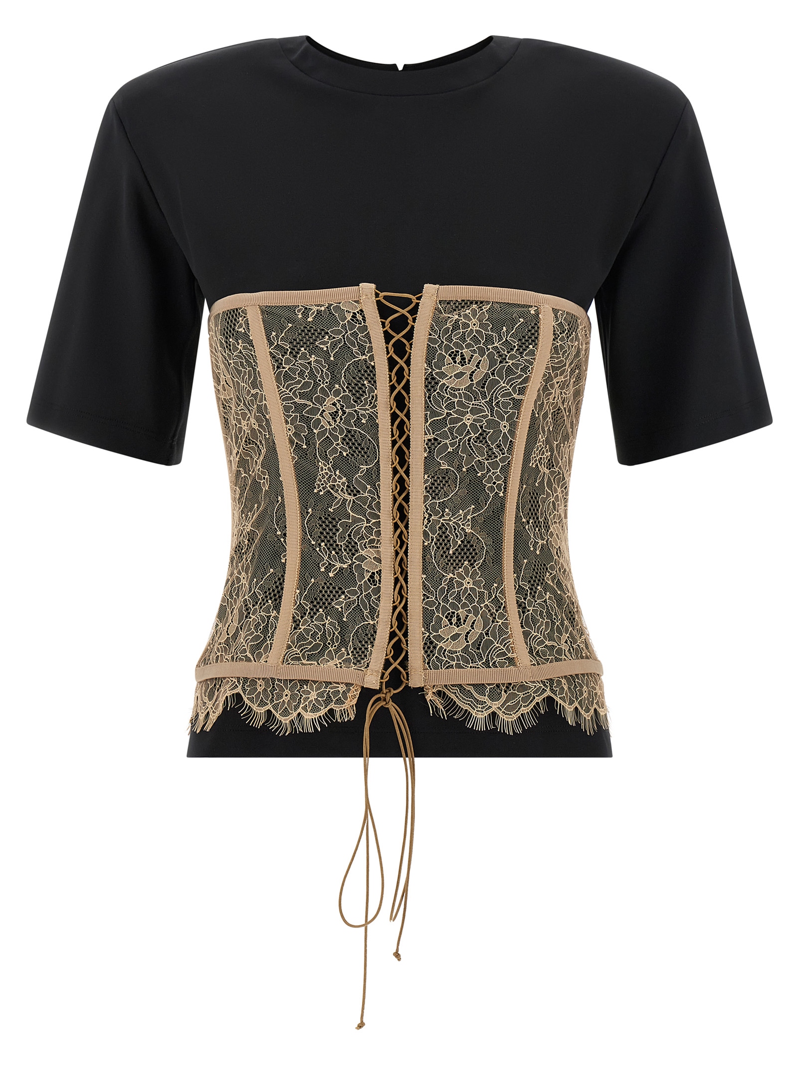 Viscose blend crewneck T-shirt with back button closure with cut-out detail, short sleeves, contrasting lace bustier appliqué with front laces, semi-rigid splints, and back zip closure.