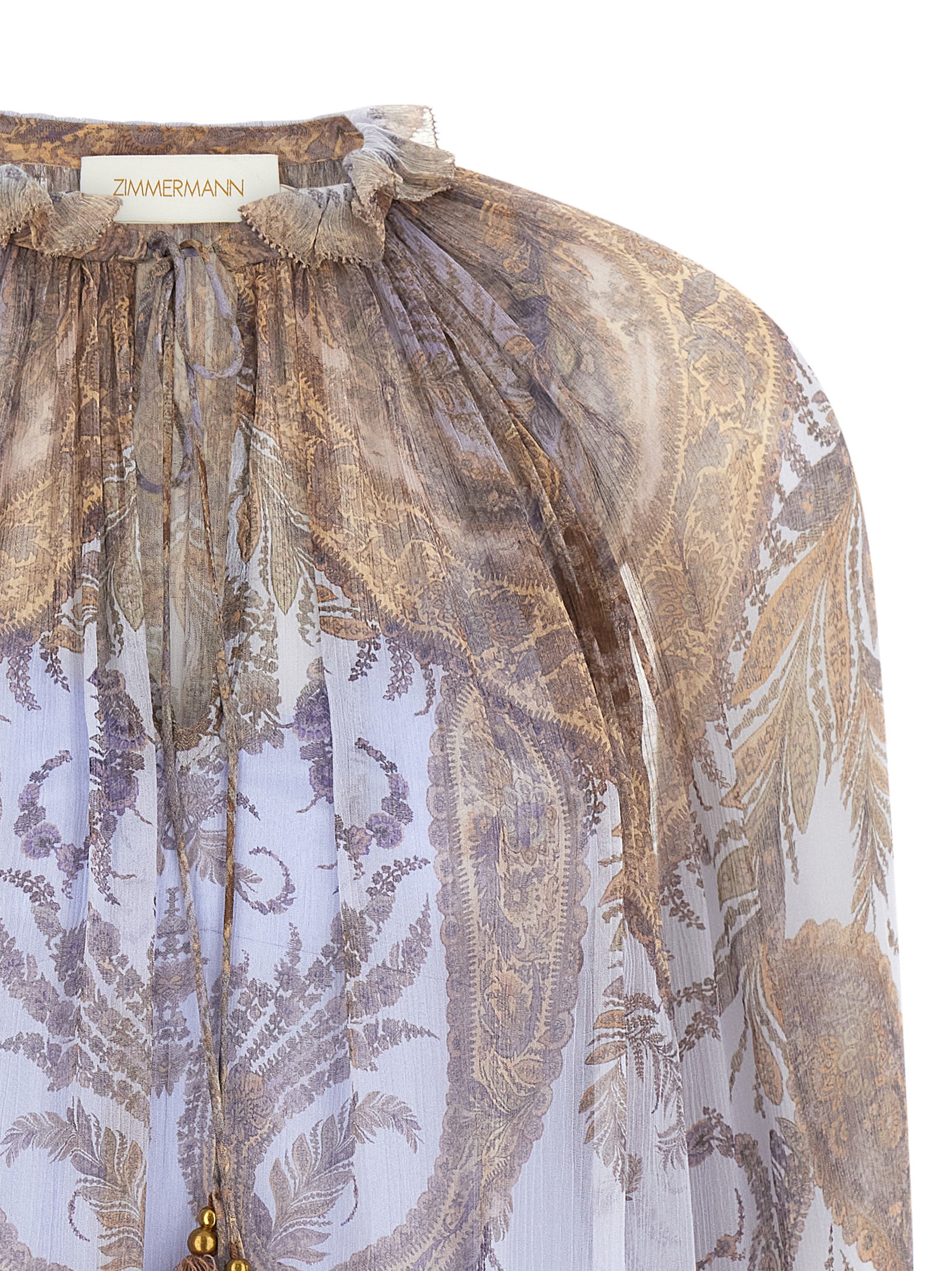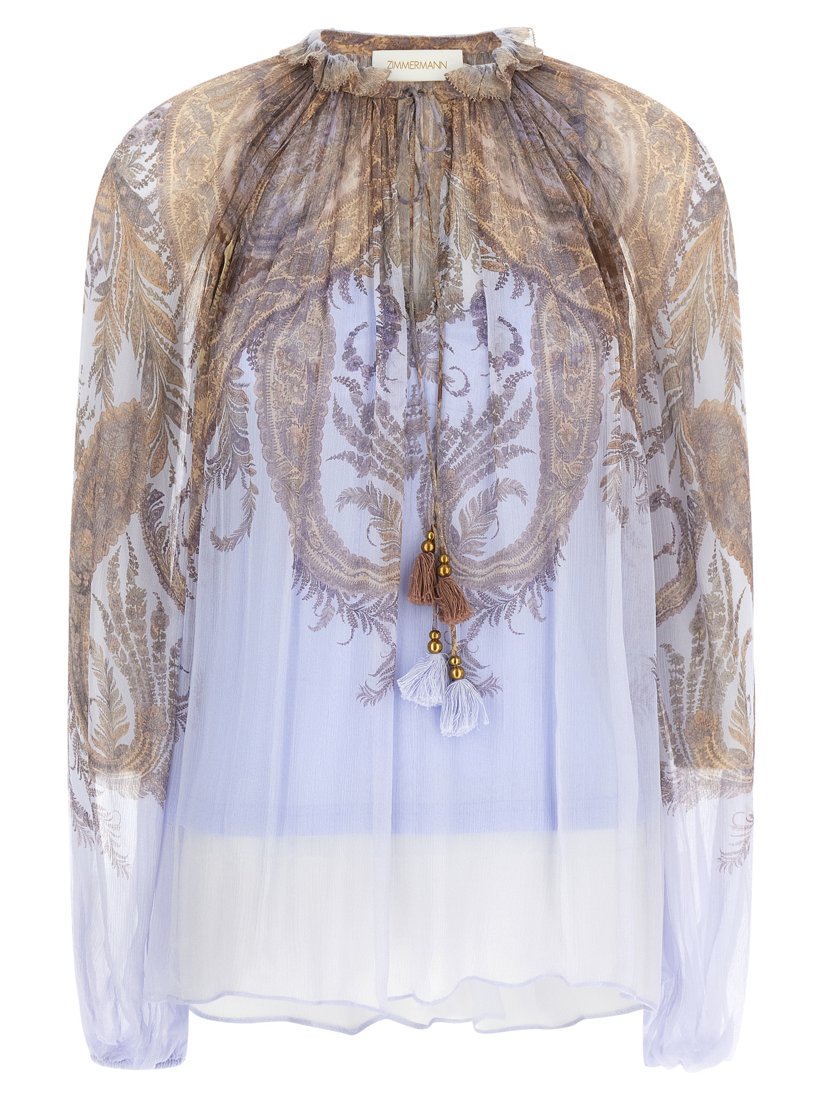 'Hypnotic Billow' blouse in light viscose 'Lilac Paisley' print, standing collar with curl, V-neck with drawstring, long puff sleeves with elasticated cuffs, removable top with adjustable straps.