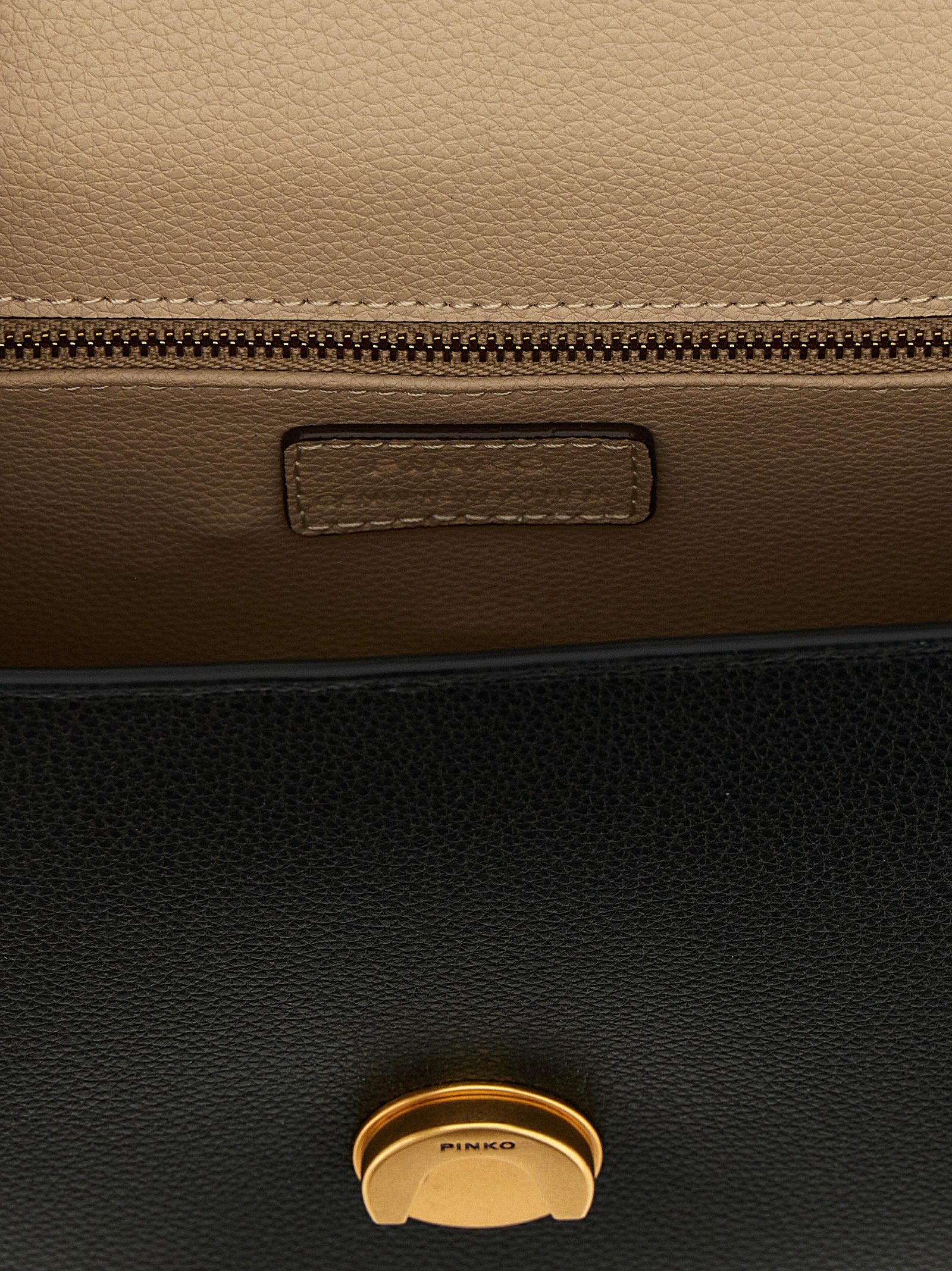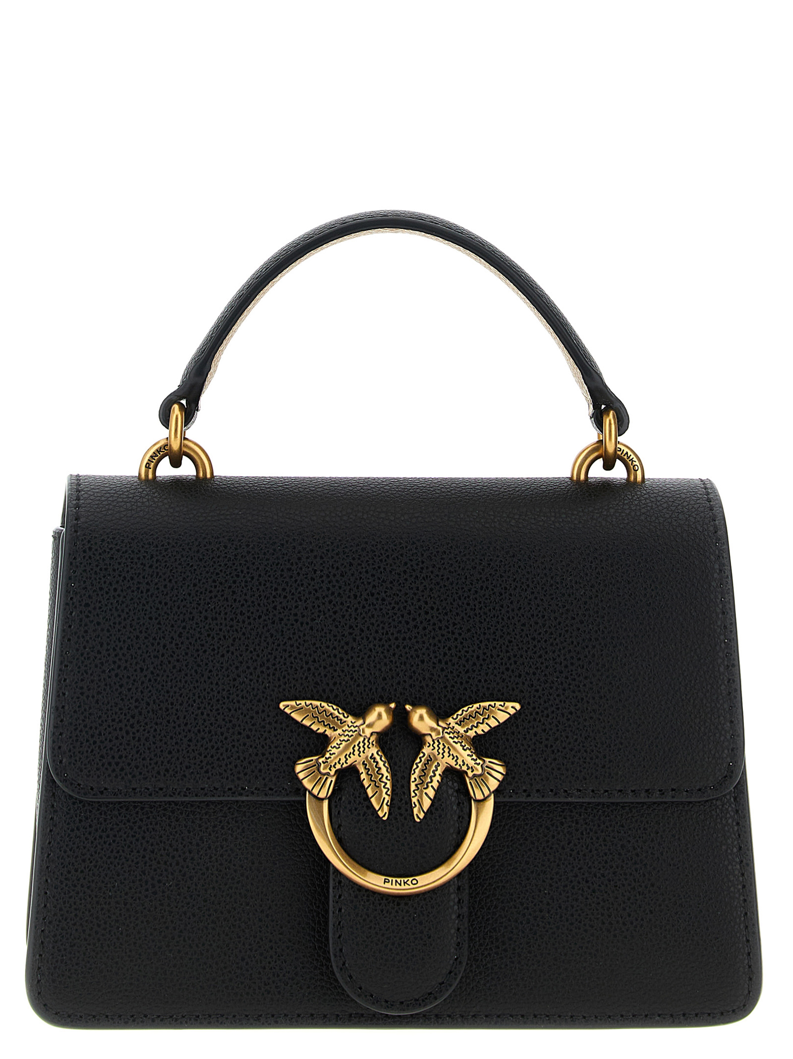 Small 'Mini Love' full-grained leather handbag with two-tone details, trapezoid structure, fixed handle, interlocking flap closure with front metal 'Love Birds Diamond Cut' detail, back embossed logo, chain shoulder strap with removable leather protection, cotton lining.