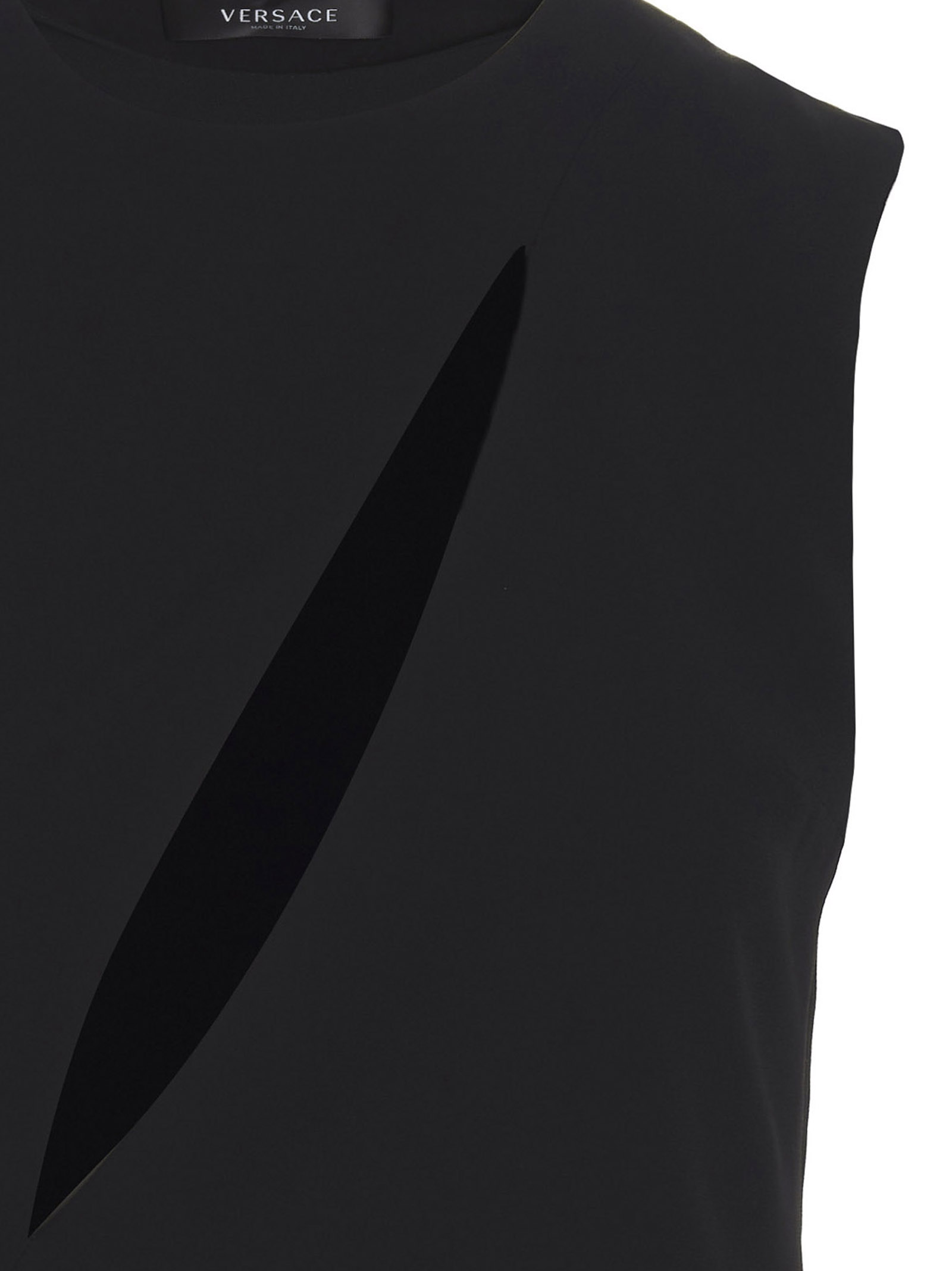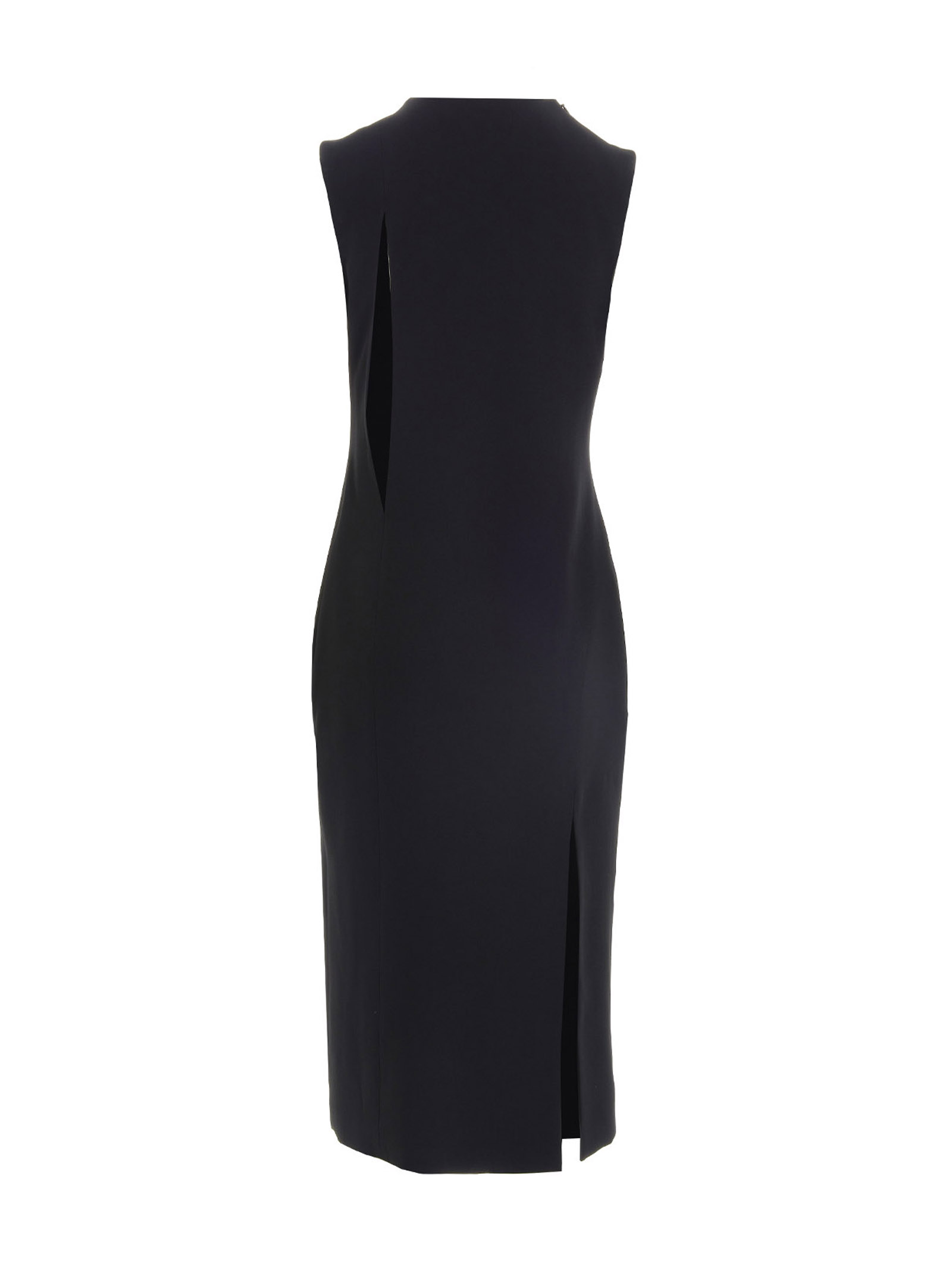 Sleeveless midi dress with cut out details at the front and back, wide side split, round neckline and a side zip closure.