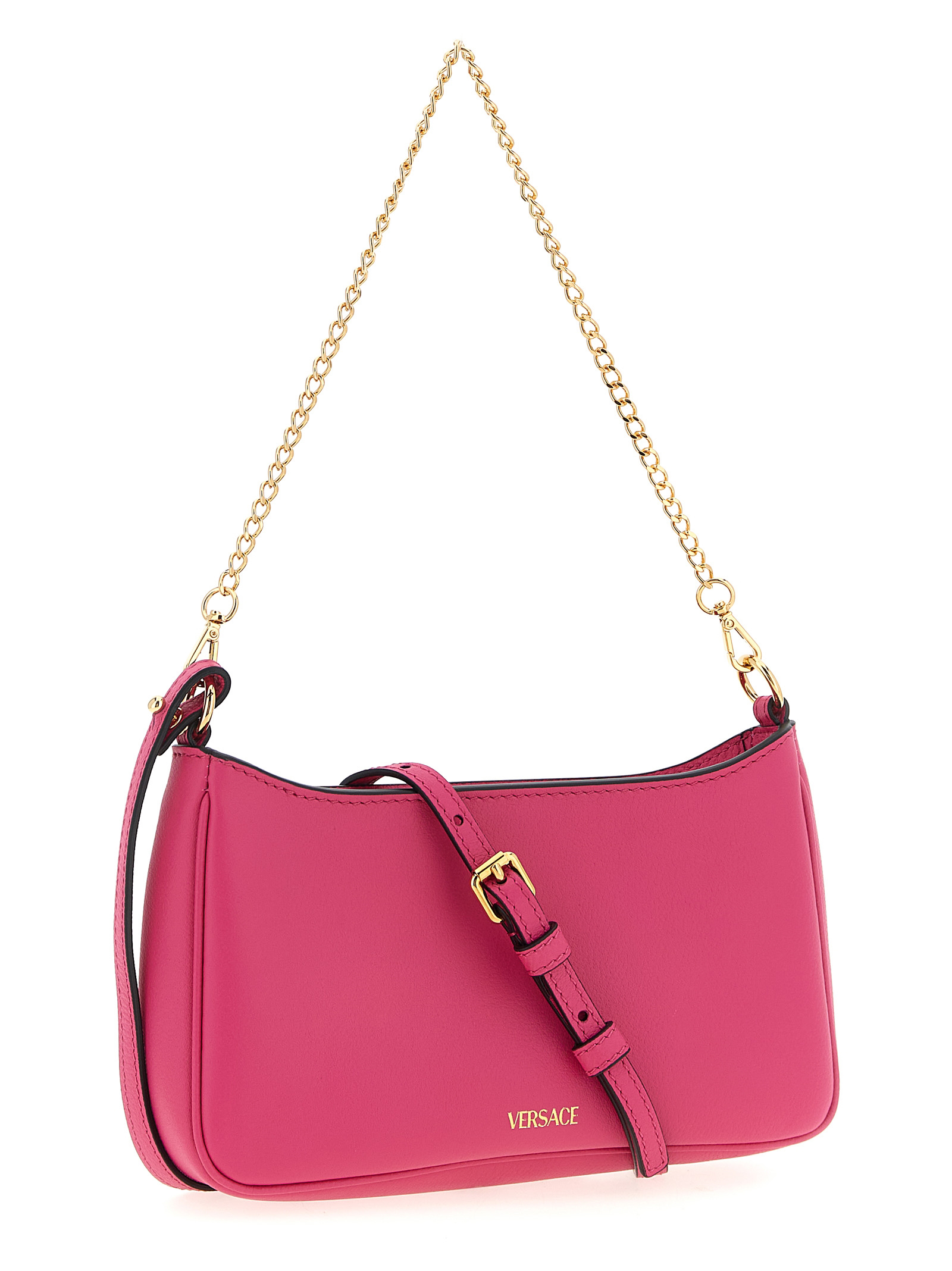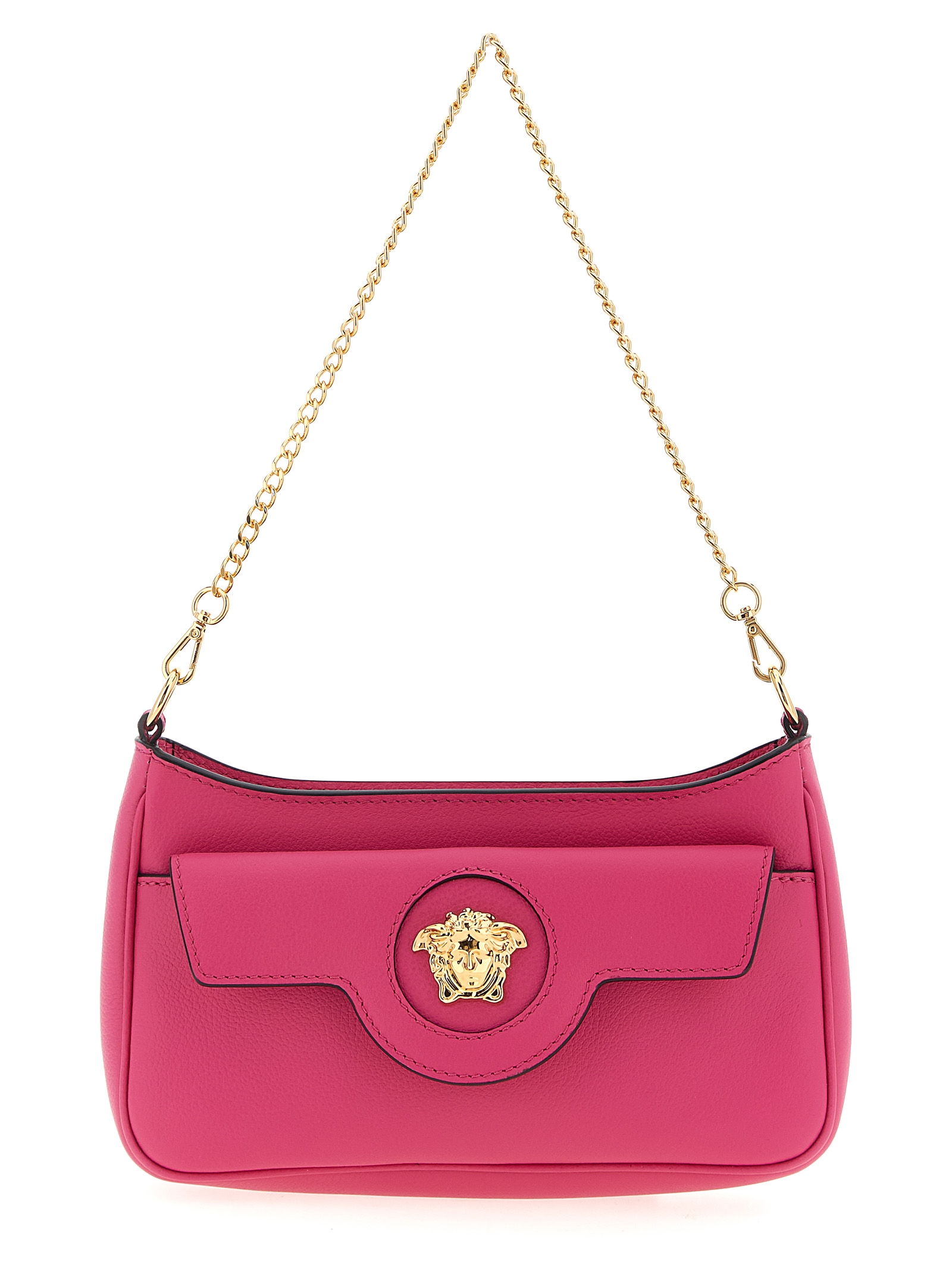 Mini crossbody bag in hammered calfskin, top zip closure, front pocket with magnetic flap closure and three-dimensional 'La Medusa' metal hardware, back embossed logo, removable chain handle, adjustable and removable leather shoulder strap.