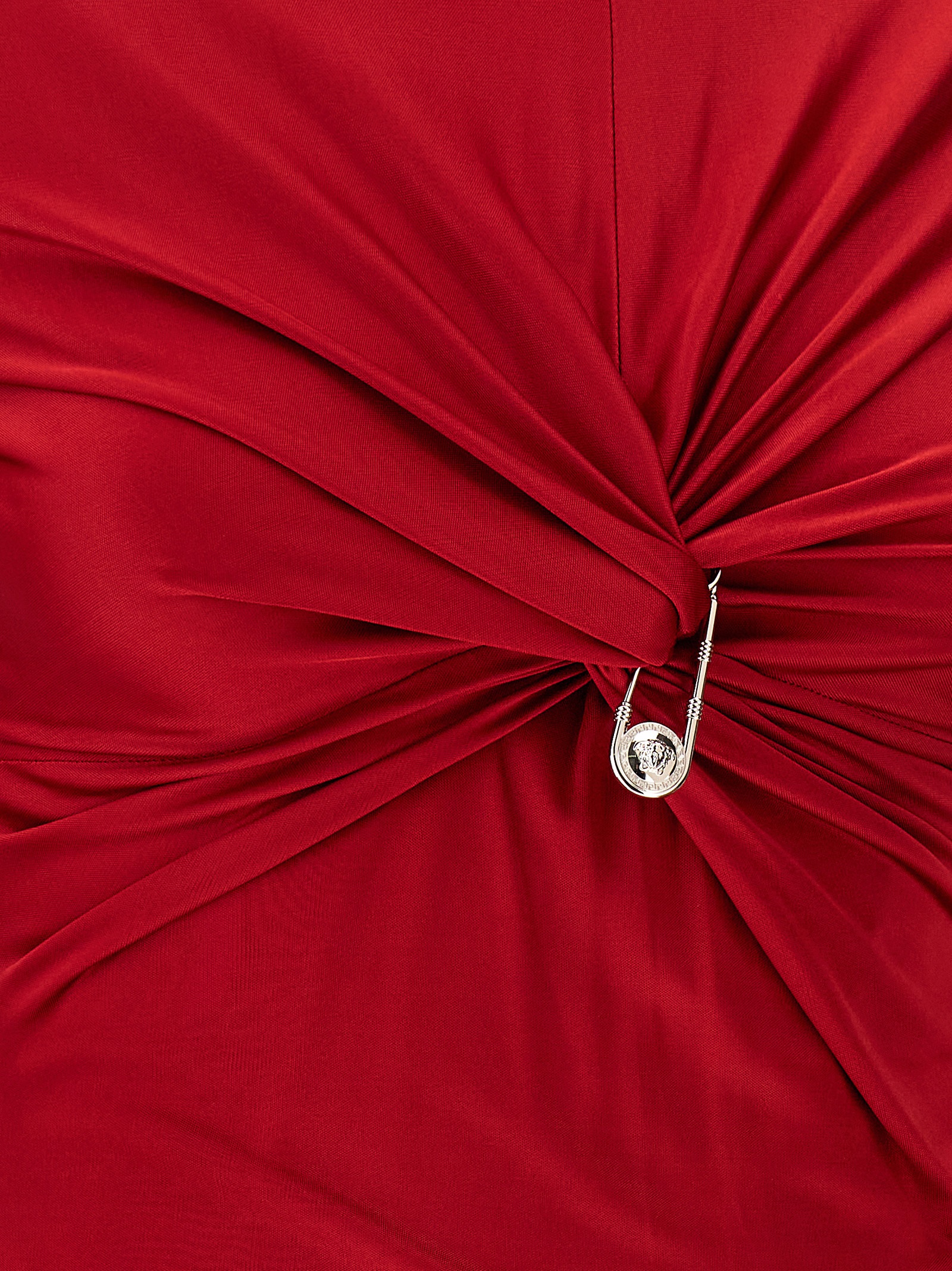 Stretch viscose jersey midi dress with front 'Safety Pin' metallic '', crew neck, back zip closure, long sleeves.