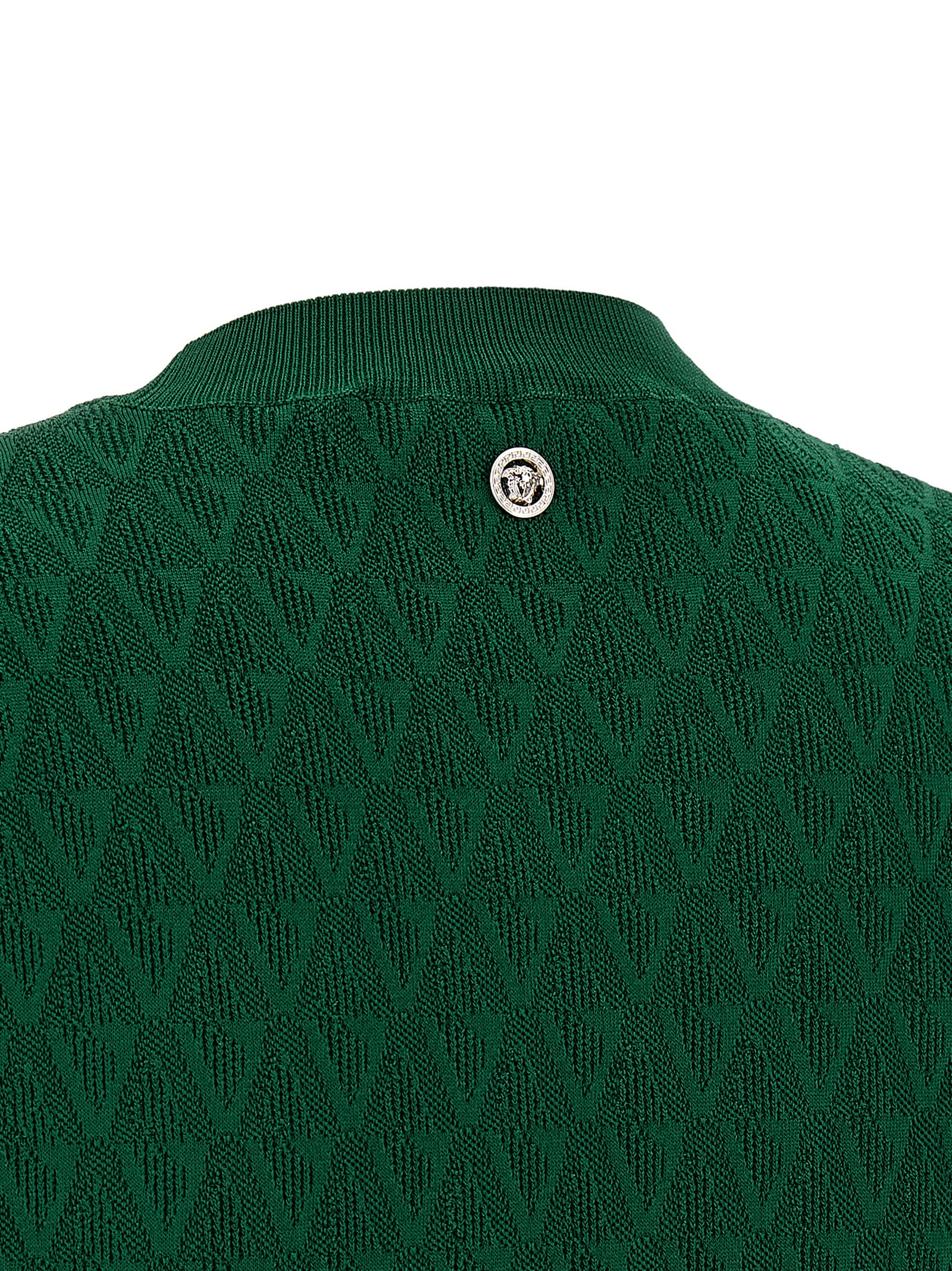 Stretch viscose knit T-shirt with all-over jacquard V pattern, metallic ‘Medusa’ logo on the back, crew neck, short sleeves.