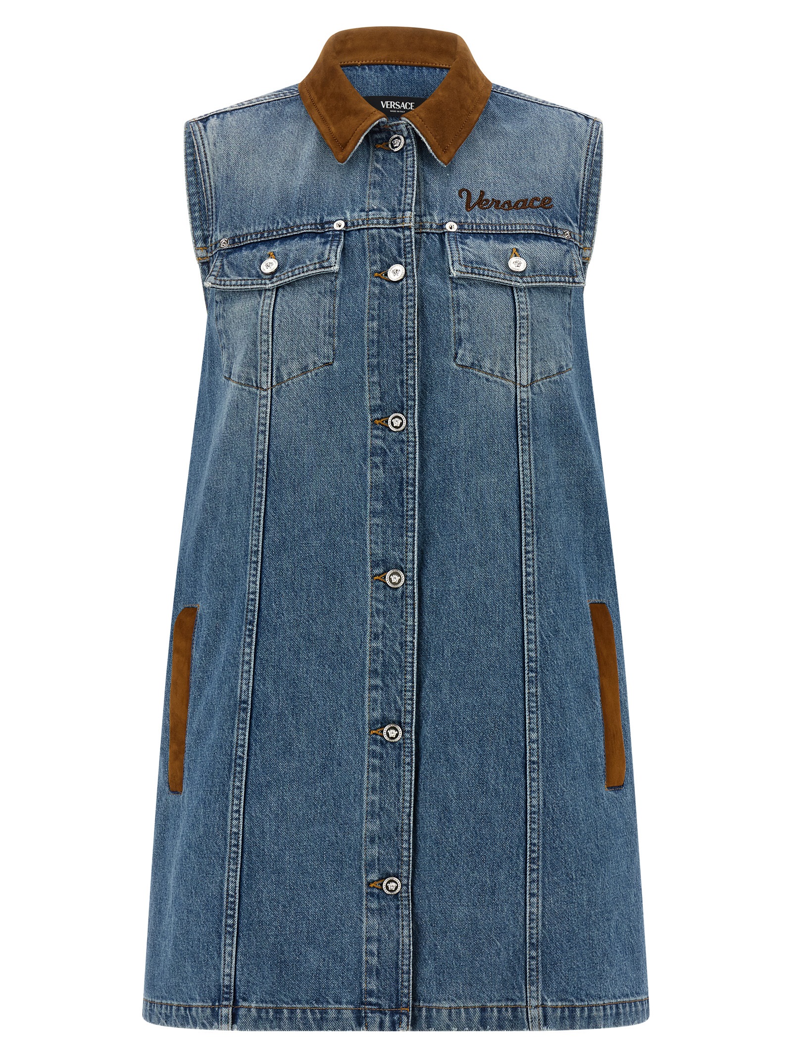 Cotton denim mini dress with medium stone washed finish, contrast stitching, collar, front logo embroidery and contrast suede pockets, A-line silhouette, pointed collar, sleeveless and unlined metal 'Medusa' button closure on the front.