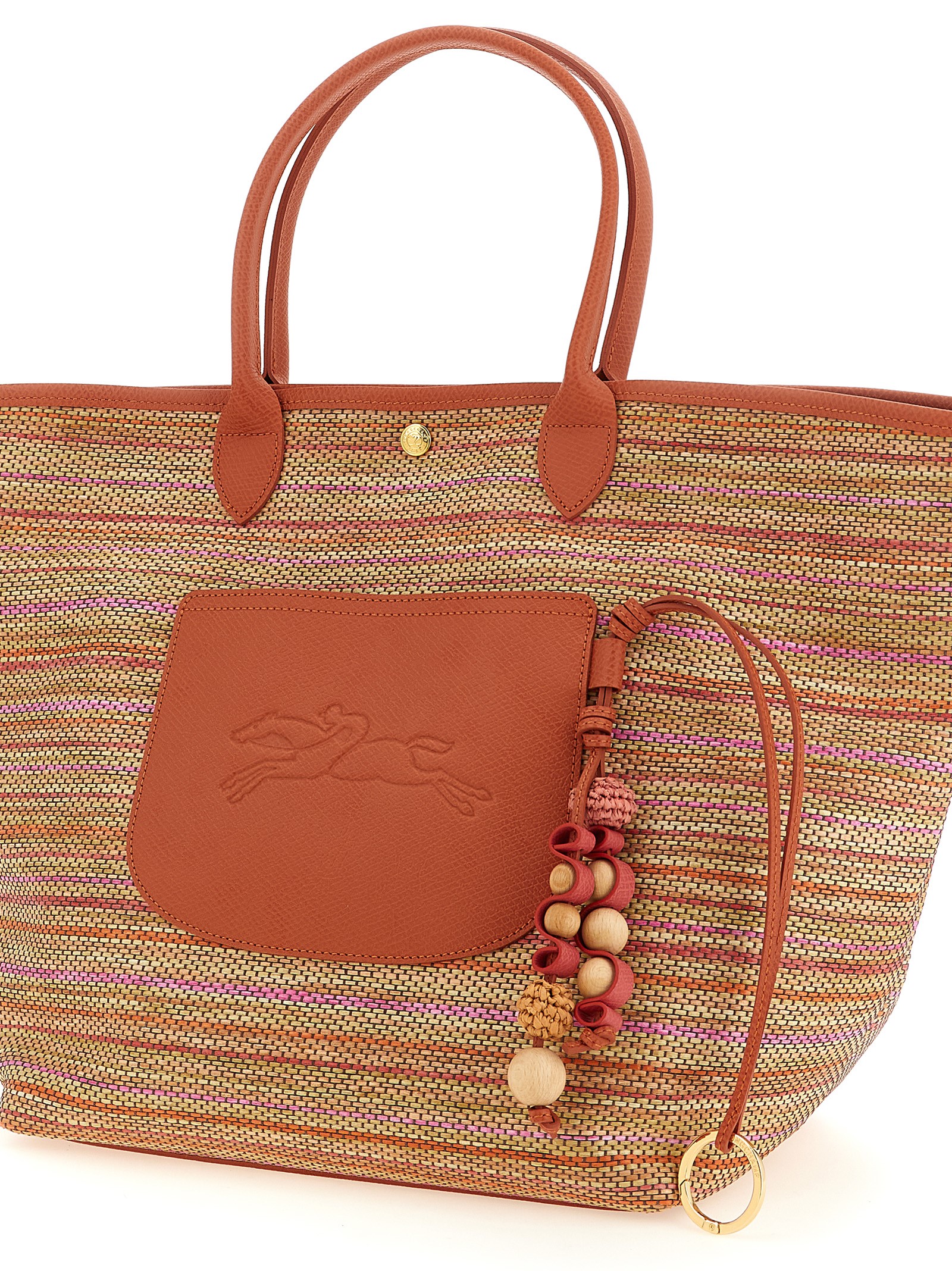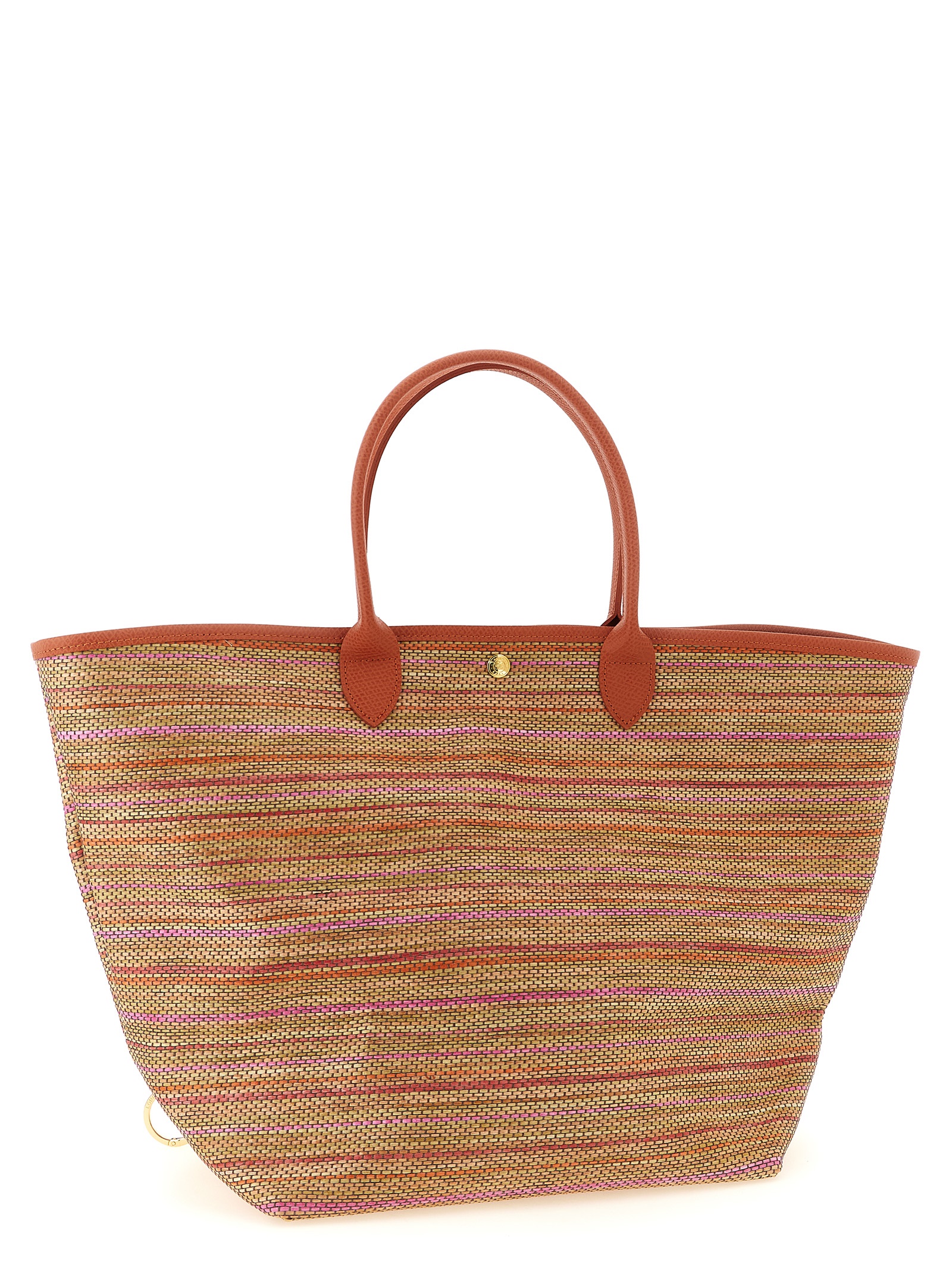 'Le Panier Pliage' shopping bag in raffia effect canvas and Russian leather basket style, embossed logo pocket and front key ring, double fixed handle, snap button closure, cotton lining.