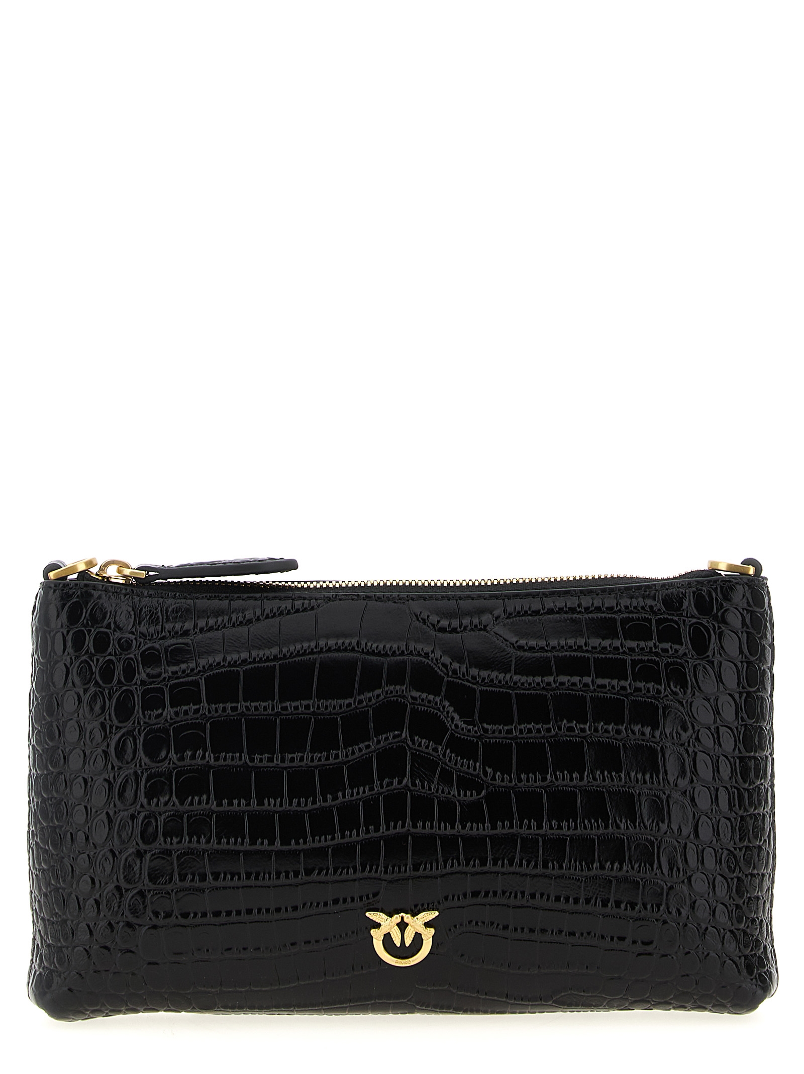'Flat Horizontal' mini crossbody bag in crocodile print leather, front metal 'Love Birds' logo, top zip closure, adjustable and removable shoulder strap, cotton lining.