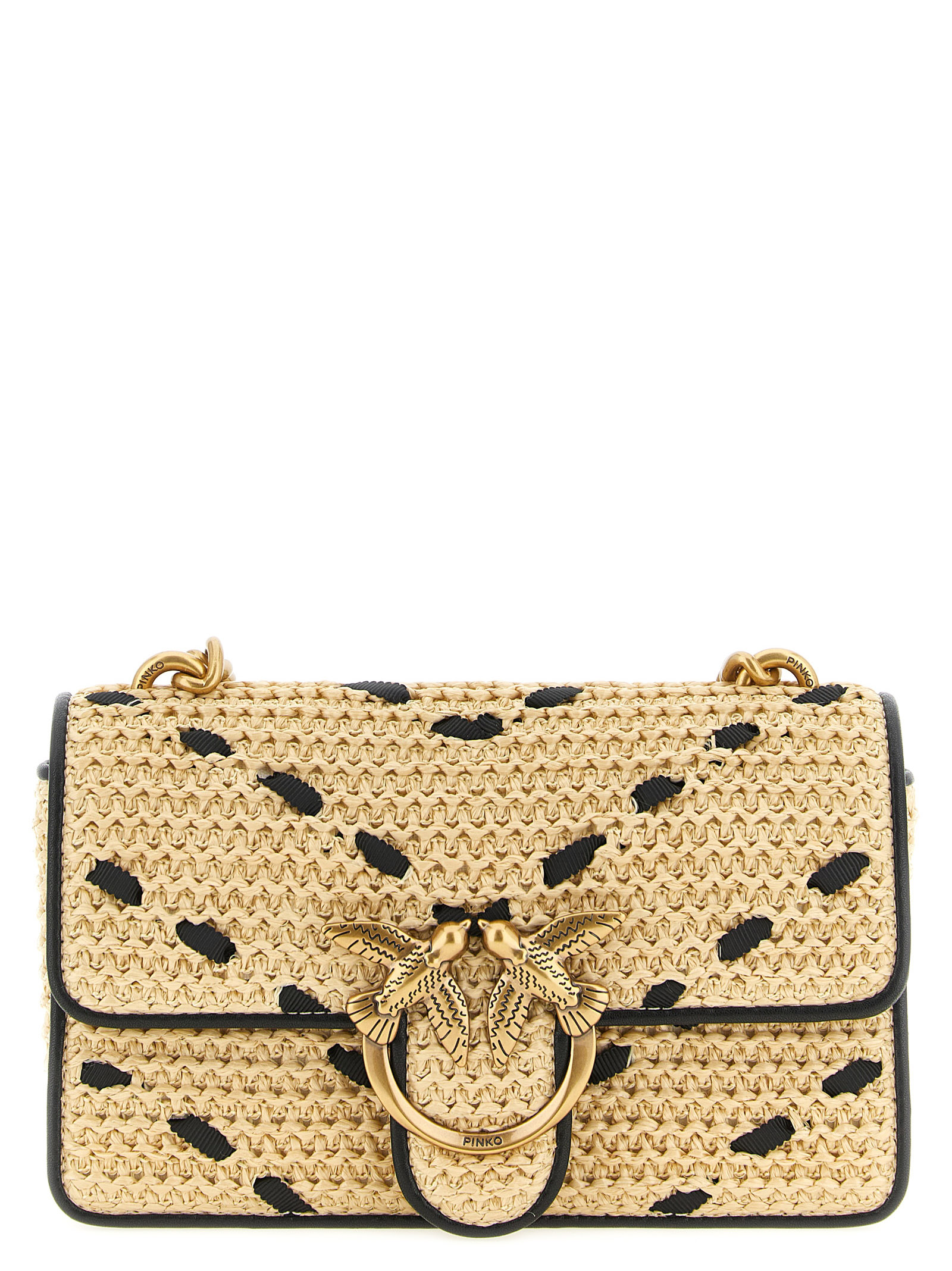 'Mini Love One Light' woven raffia crossbody bag with contrast tape chevron pattern and silk hand-held leather details, magnetic flap closure with front metal 'Love Birds Diamond Cut' buckle, chain shoulder strap with leather protection.