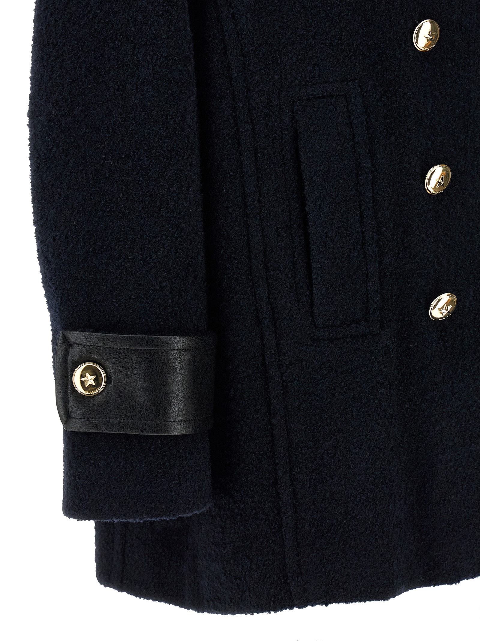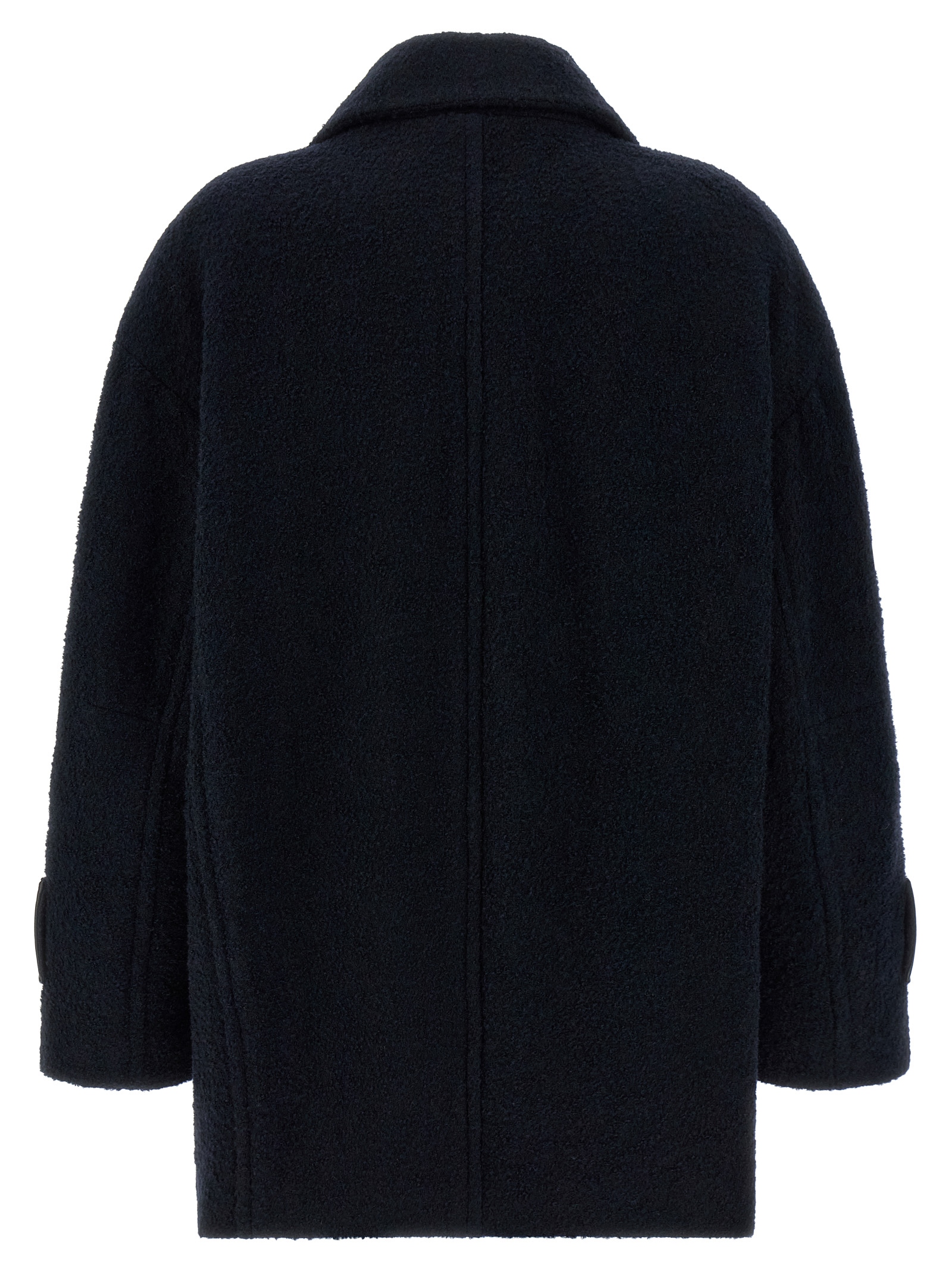Двубортное пальто-кабан от Canederli' из диагональной букле-ткани из шерстяной смеси с застежкой на металлические пуговицы спереди, воротником с лацканами, карманами, длинными рукавами с манжетами из ткани с покрытием, имитирующей кожу, и подкладкой из вискозной смеси.