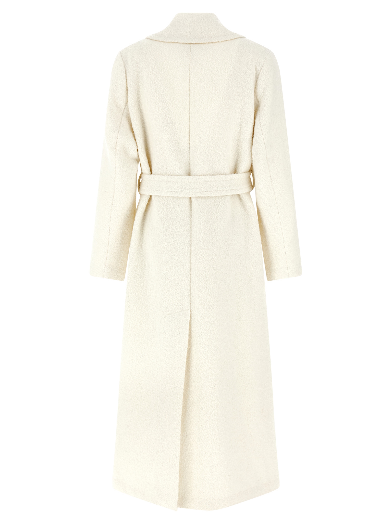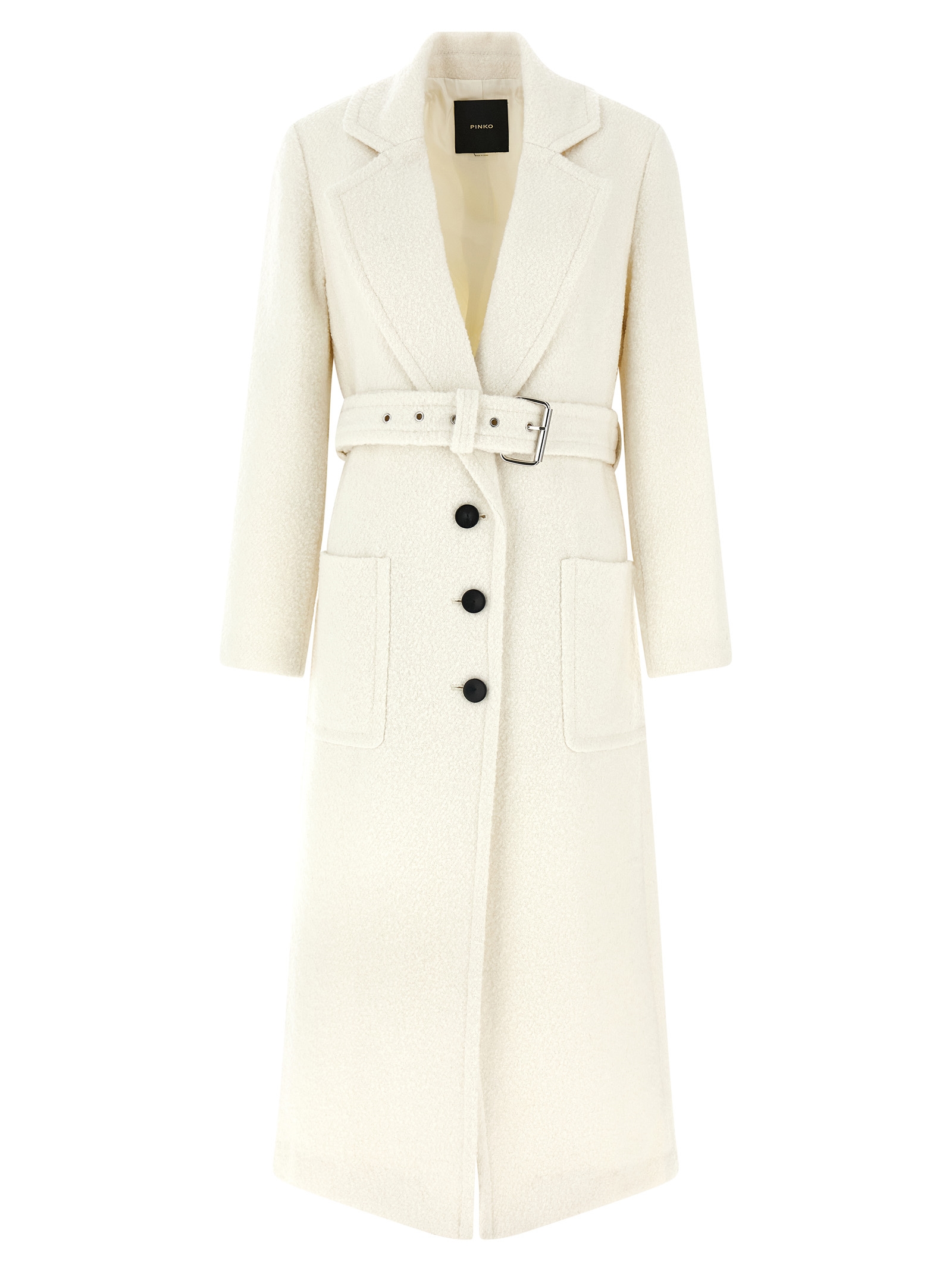 Long 'Cerfoglio' single-breasted coat in diagonal bouclé wool blend fabric with front button closure, lapel collar, patch pockets, long sleeves, back split, removable belt, viscose blend lining. belt