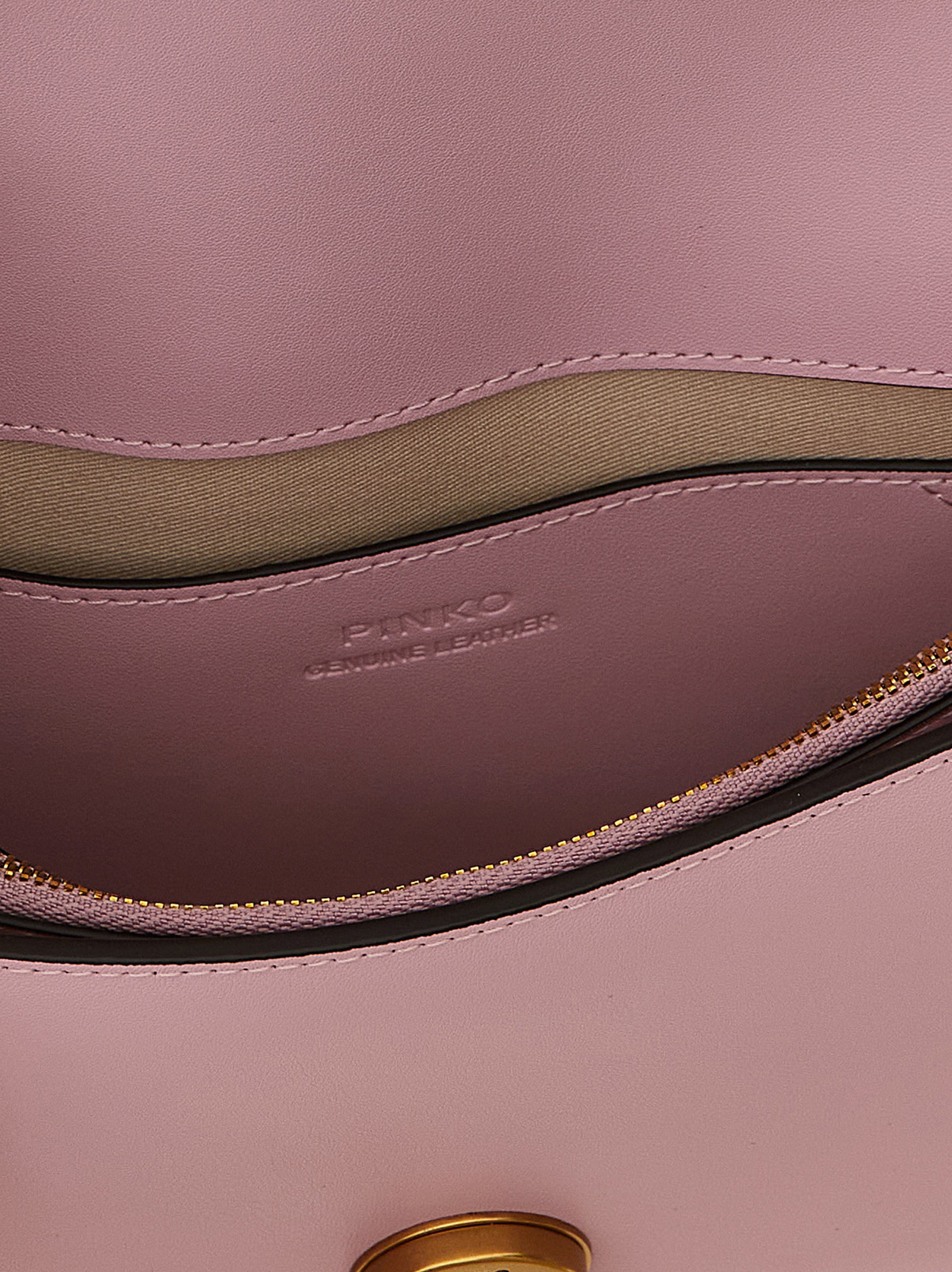 'Love One Mini' leather crossbody bag, interlocking flap closure with front metal logo appliqué, chain shoulder strap with removable leather protection.