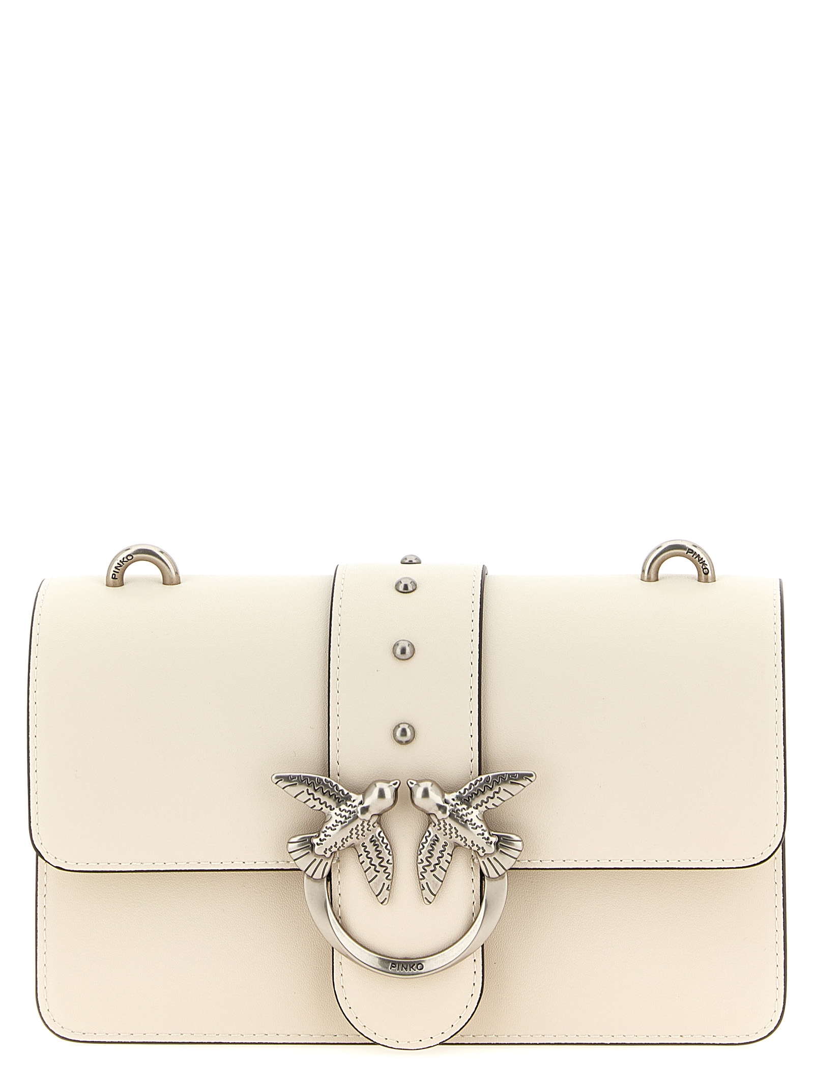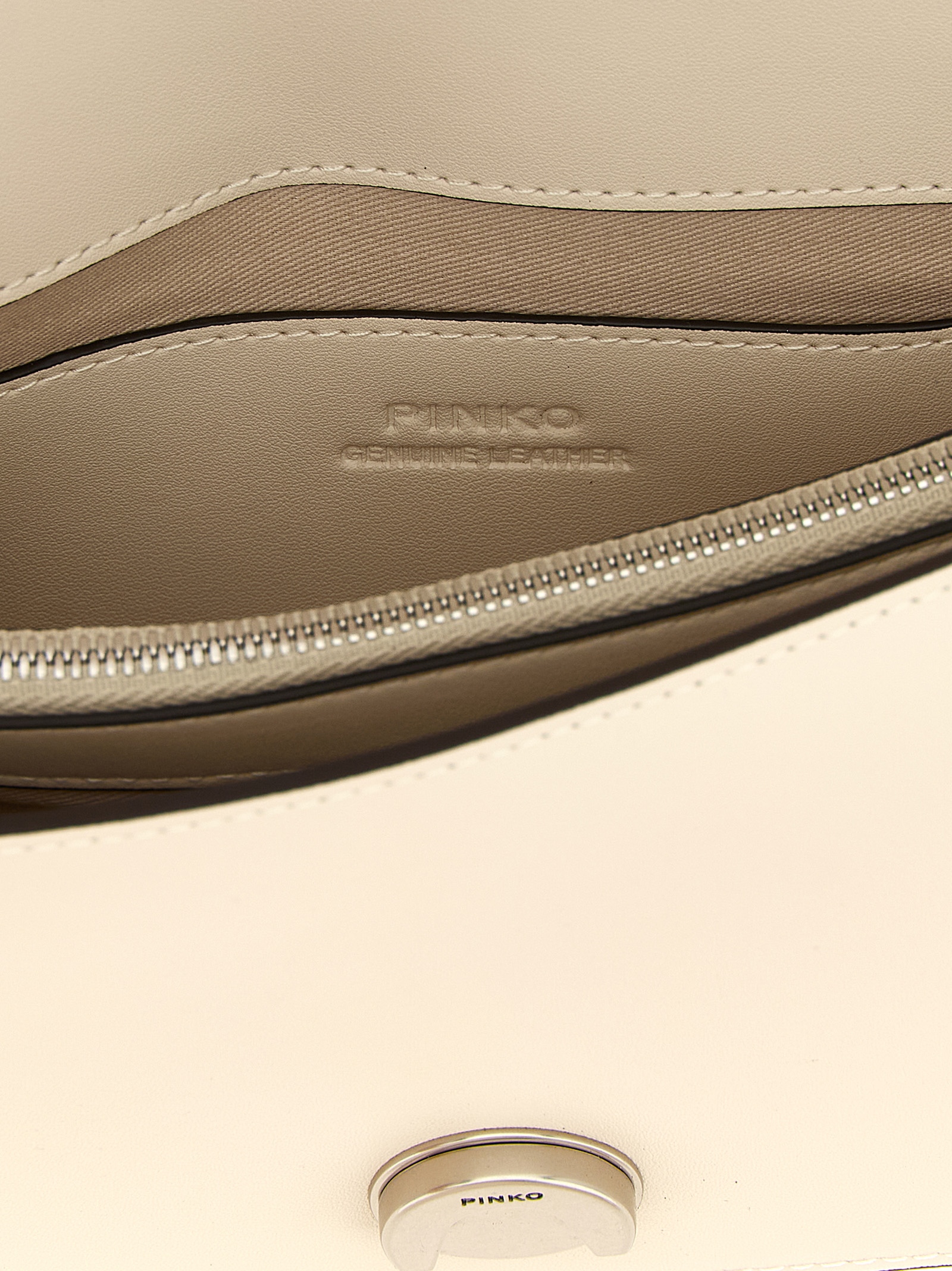 'Love One Mini' leather crossbody bag, interlocking flap closure with front metal logo appliqué, chain shoulder strap with removable leather protection.