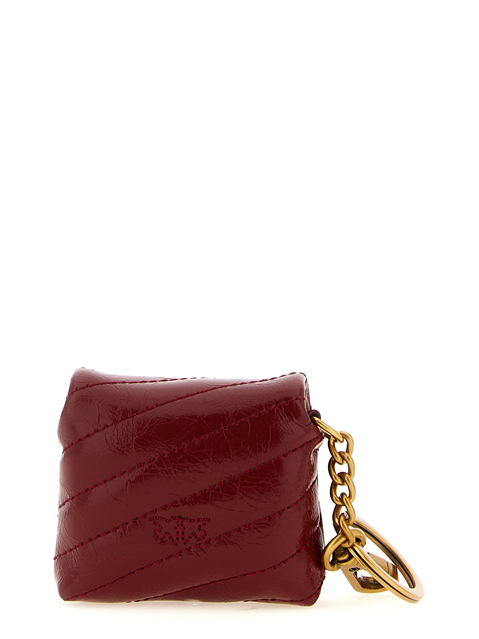 'Love Puff' shiny leather AirPods case with oblique quilting, magnetic flap closure with front metal 'Love Birds Diamond Cut', metal chain with snap hook.