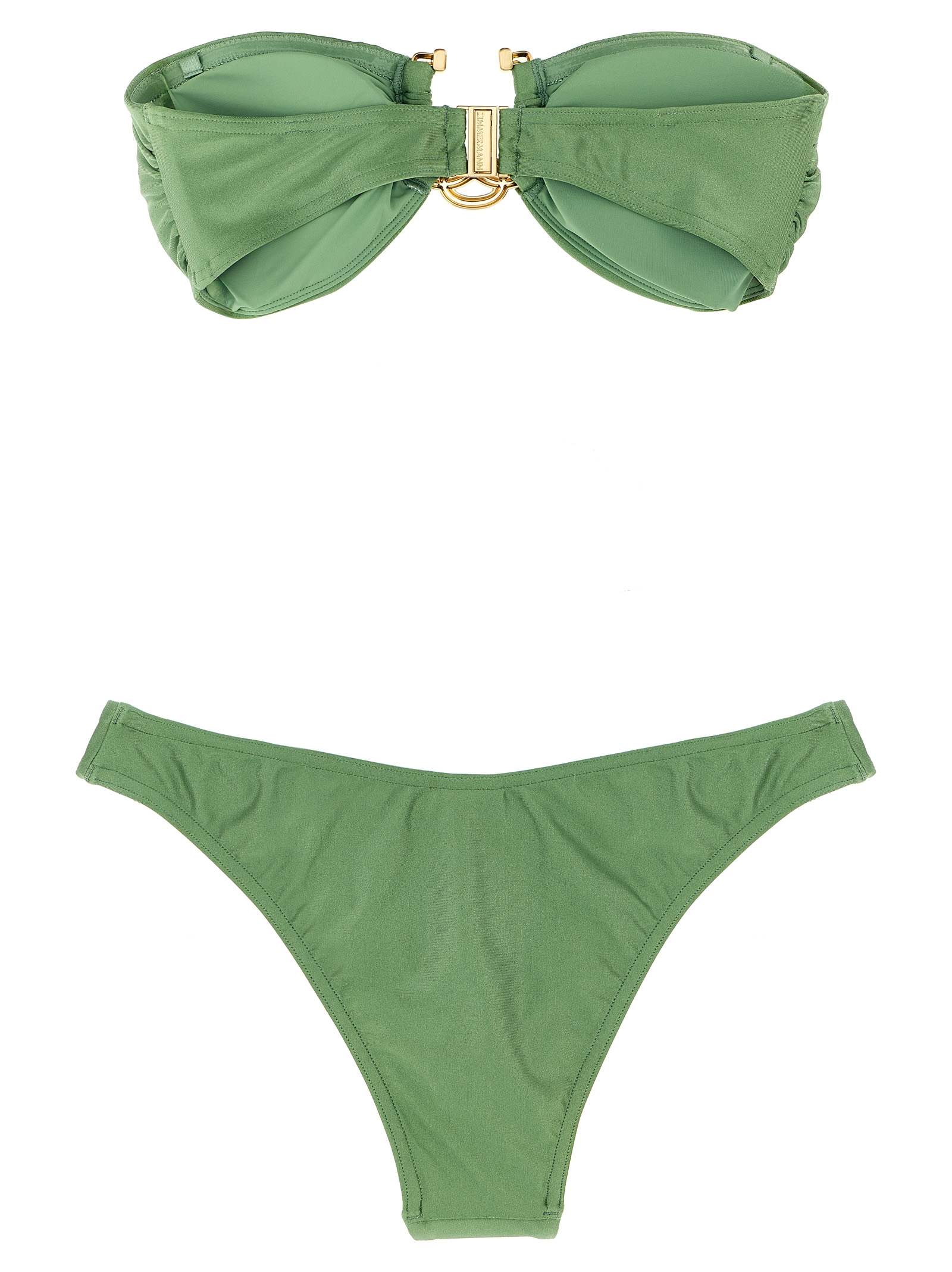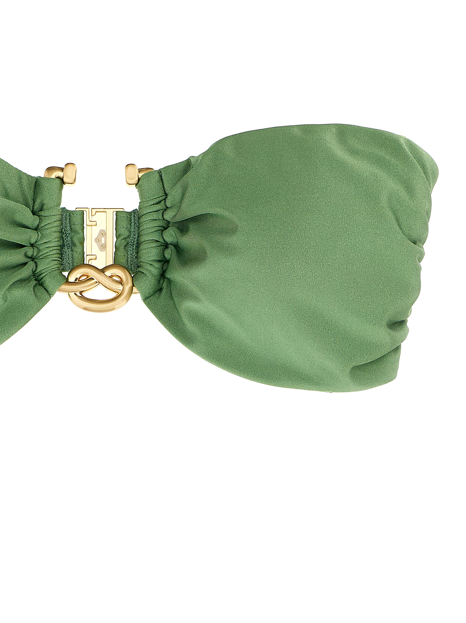 'Rhiannon Knot' bikini, bandeau top with adjustable and removable straps, slightly padded with metal detail on the front, low waist bottoms.