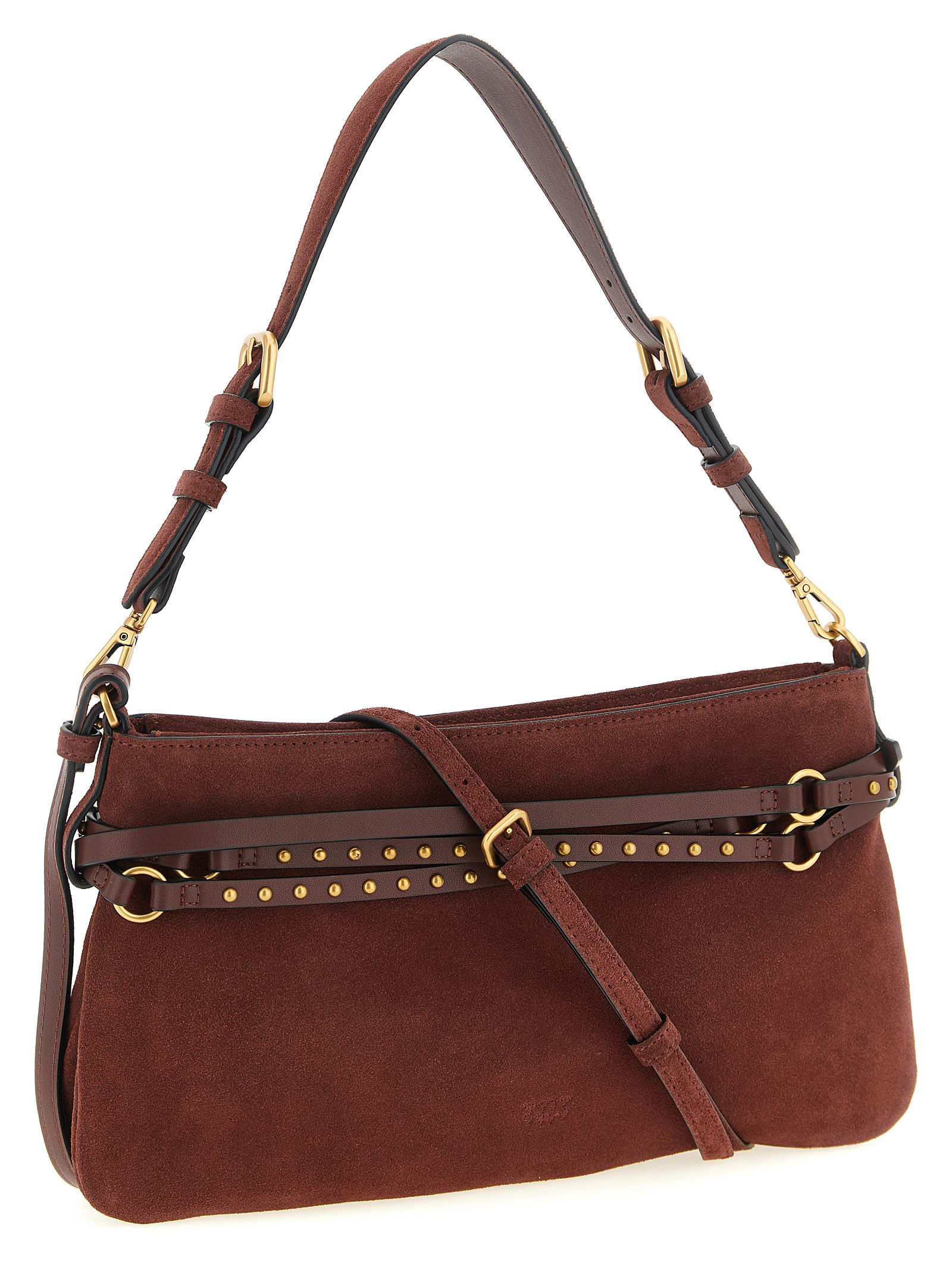 'Belt' medium shoulder bag in suede fabric, flat design, slightly trapezoid silhouette, adjustable multi-turn matching belt with metal studs and 'Love Birds' buckle, top zip closure, adjustable and removable handle, cotton drill lining, adjustable and removable shoulder strap.