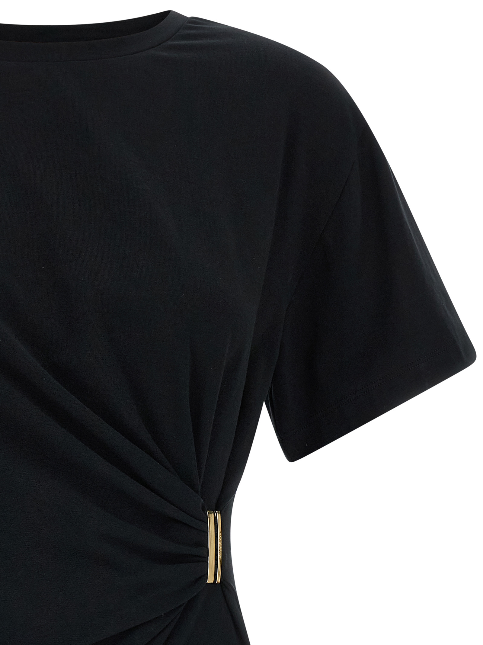 'Mary' cotton jersey crew neck t-shirt, dropped shoulder, front side curling detail with metal logo appliqué, short sleeves.