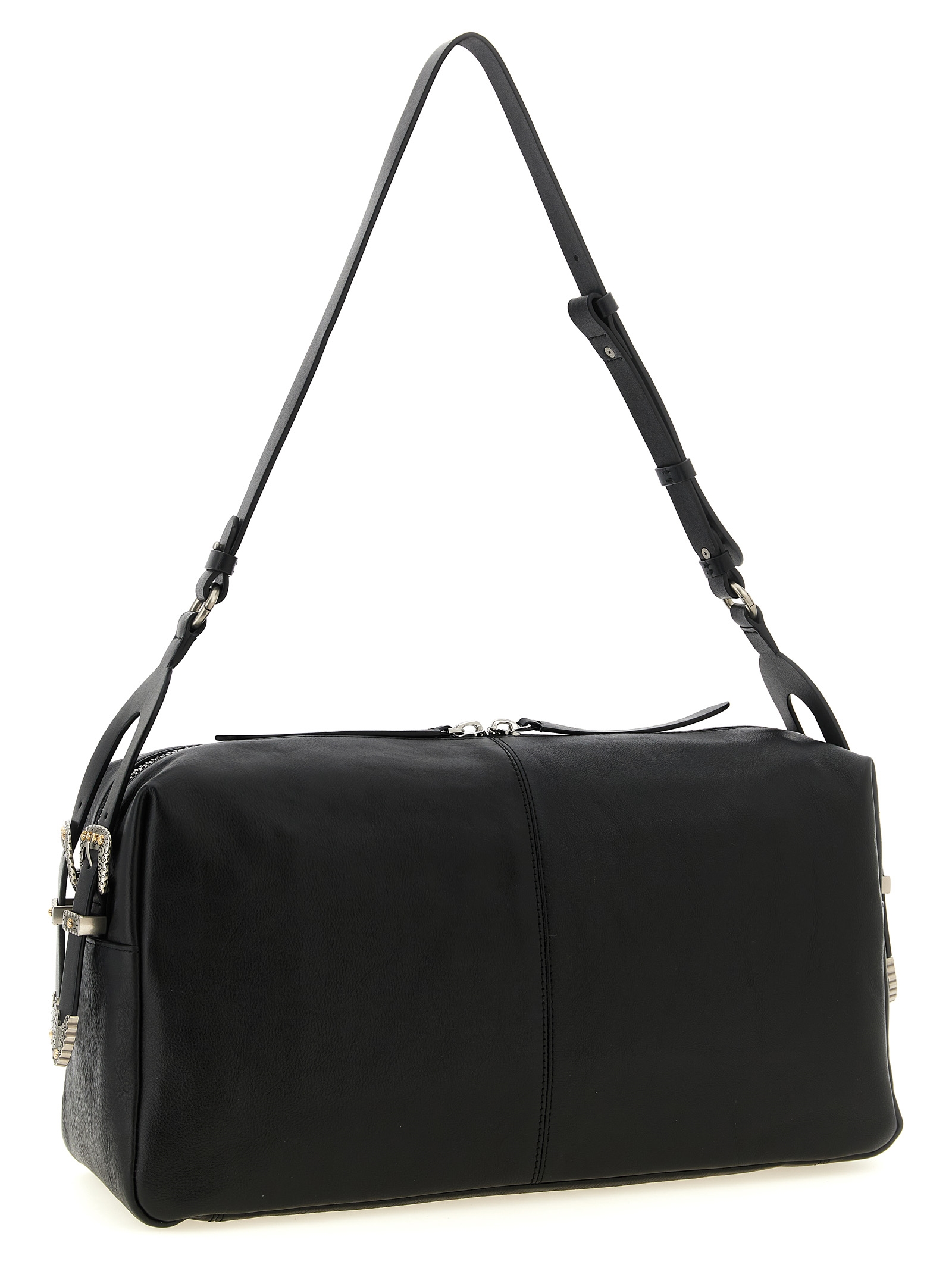 'Keeper' large shoulder bag in new biker leather, slightly elongated rectangular silhouette, metal 'Love Birds Diamond Cut' logo on the front, adjustable handle with western and country style metal details, top zip closure, cotton drill lining.