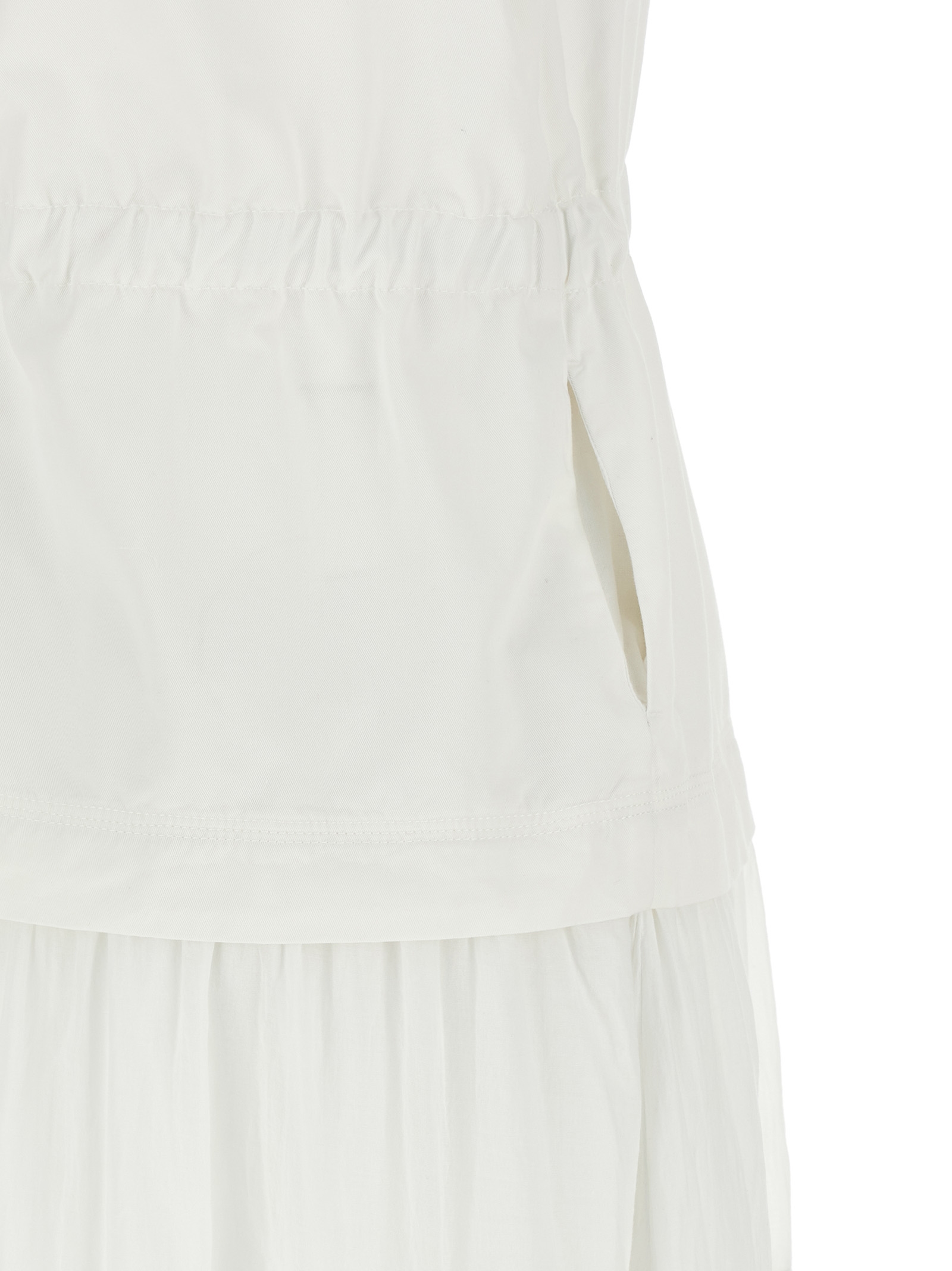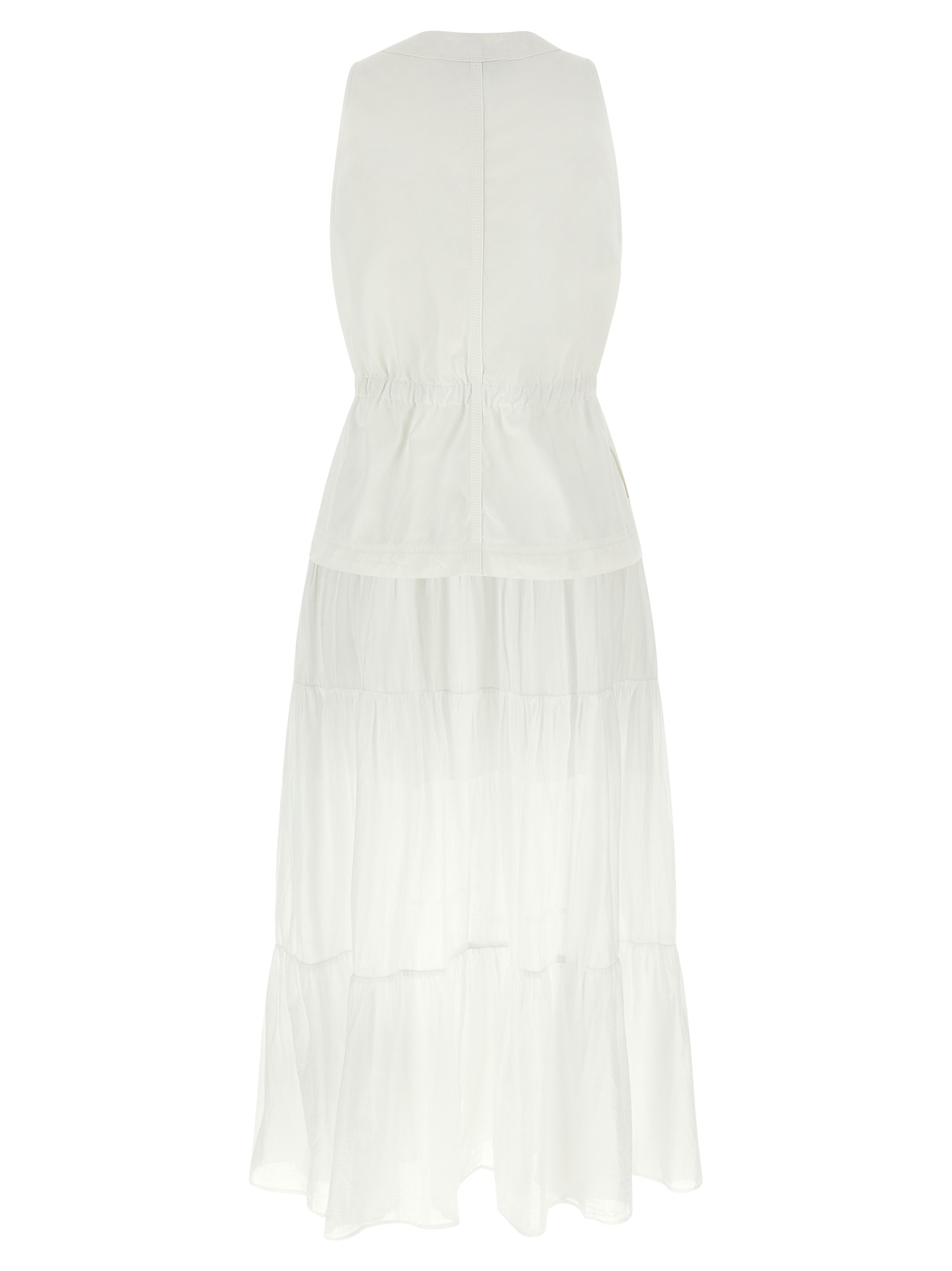 'Casarsa' long dress consisting of garment-dyed cotton gabardine top, deep V-neck with tone-on-tone crossed ribbons on the front, sleeveless, elastic waistband and wide skirt in cotton voile with curled panels and flounce on the skirt bottom.