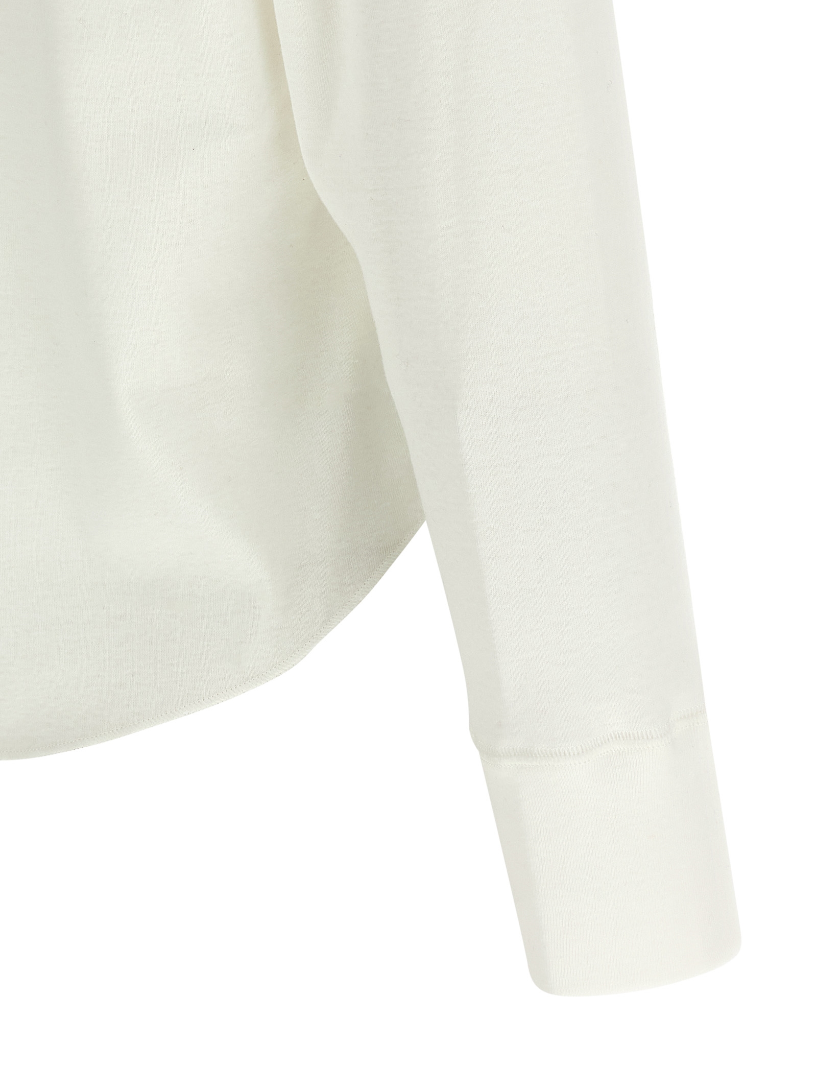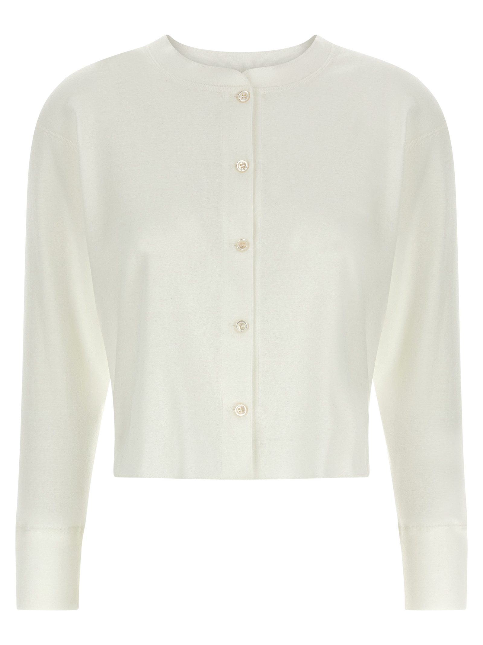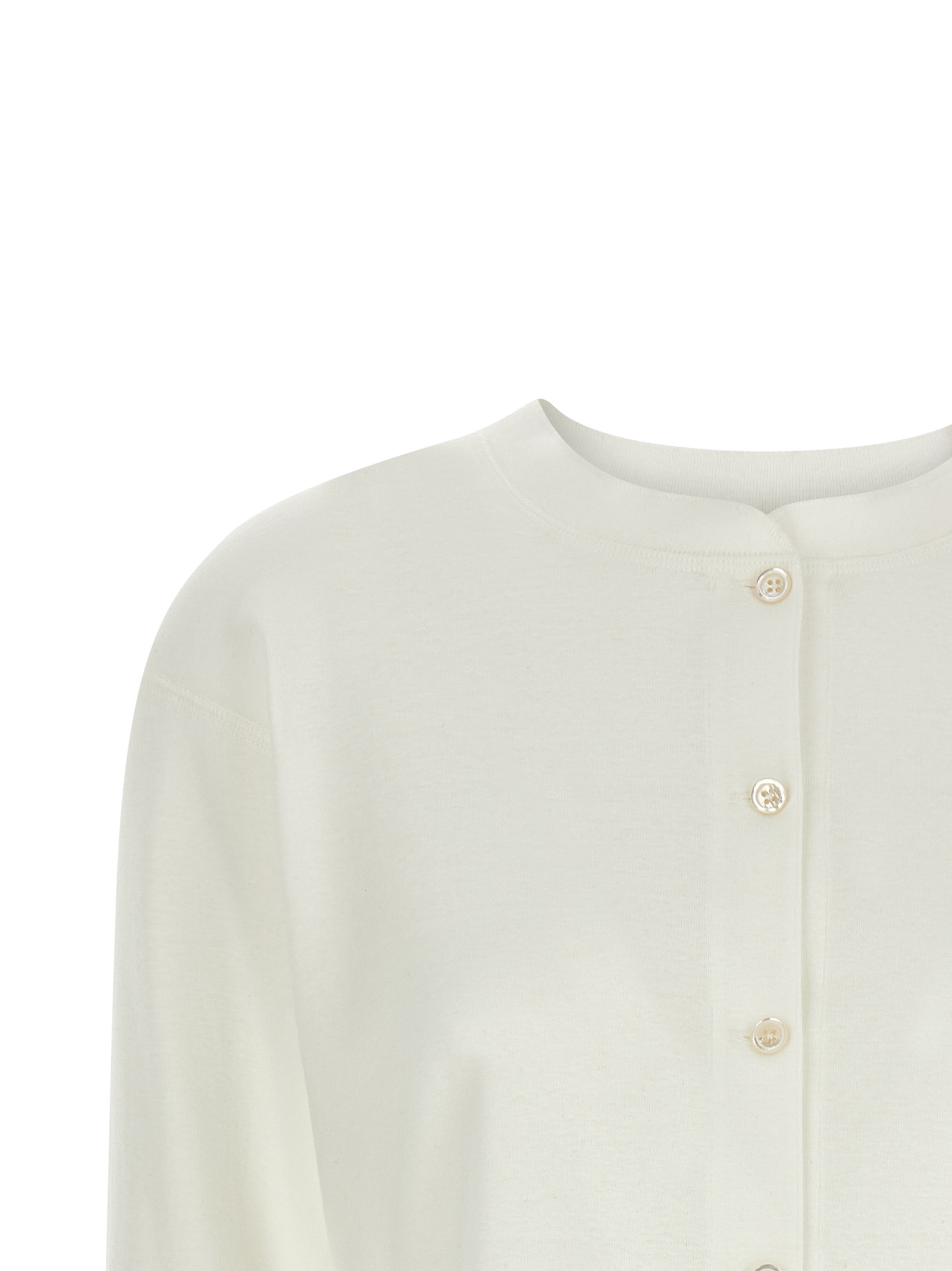 Укороченный топ «Гано» из японского хлопкового трикотажа с вышивкой крестиком в тон, круглым вырезом, застежкой на перламутровые пуговицы спереди, длинными рукавами с манжетами, закругленным и асимметричным низом.Характеристики товара