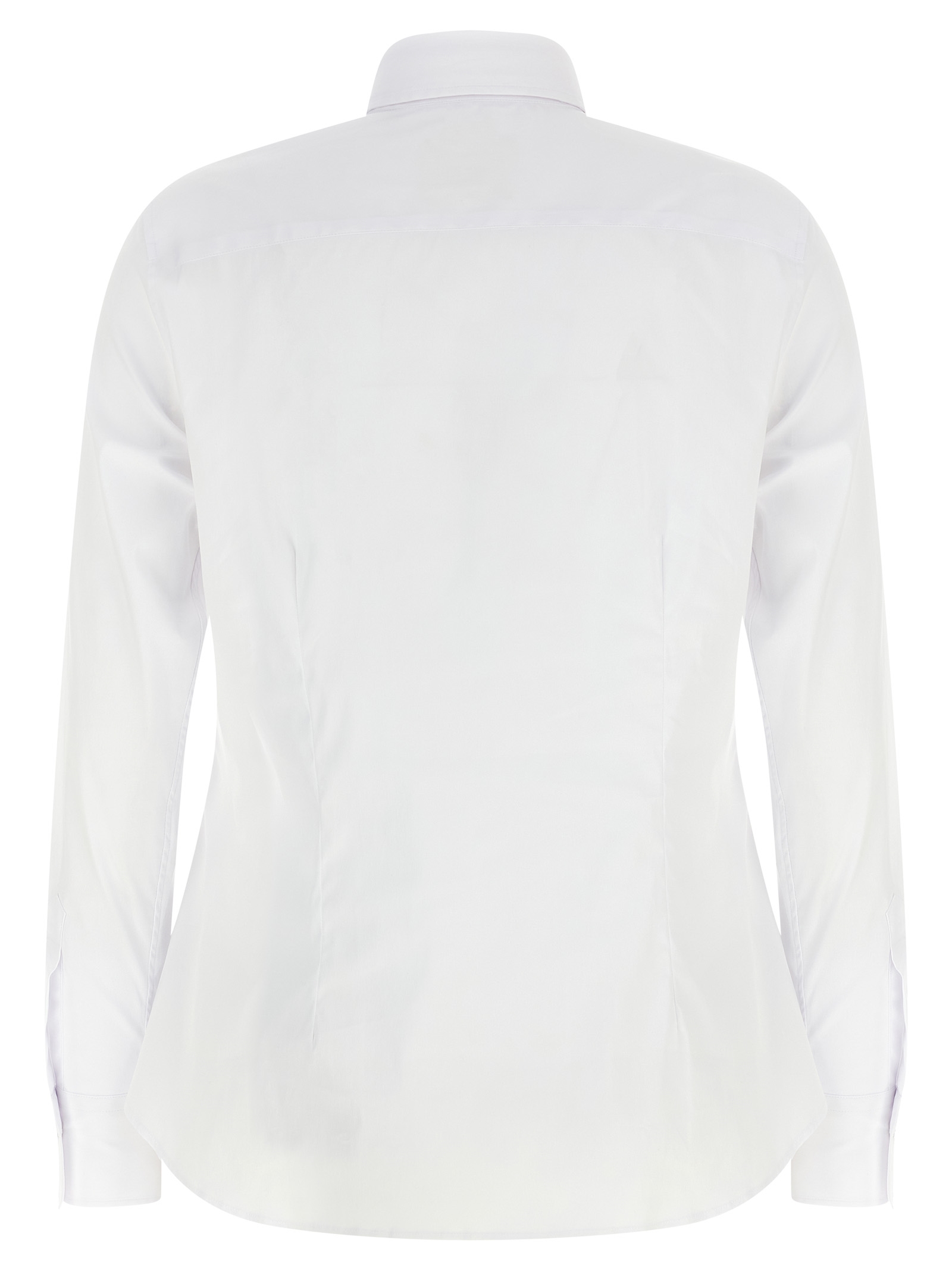 Classic 'Sara' cotton blend shirt with pointed collar, slightly flared with front and back pleats, front button closure, long sleeves with cuffs and buttons.