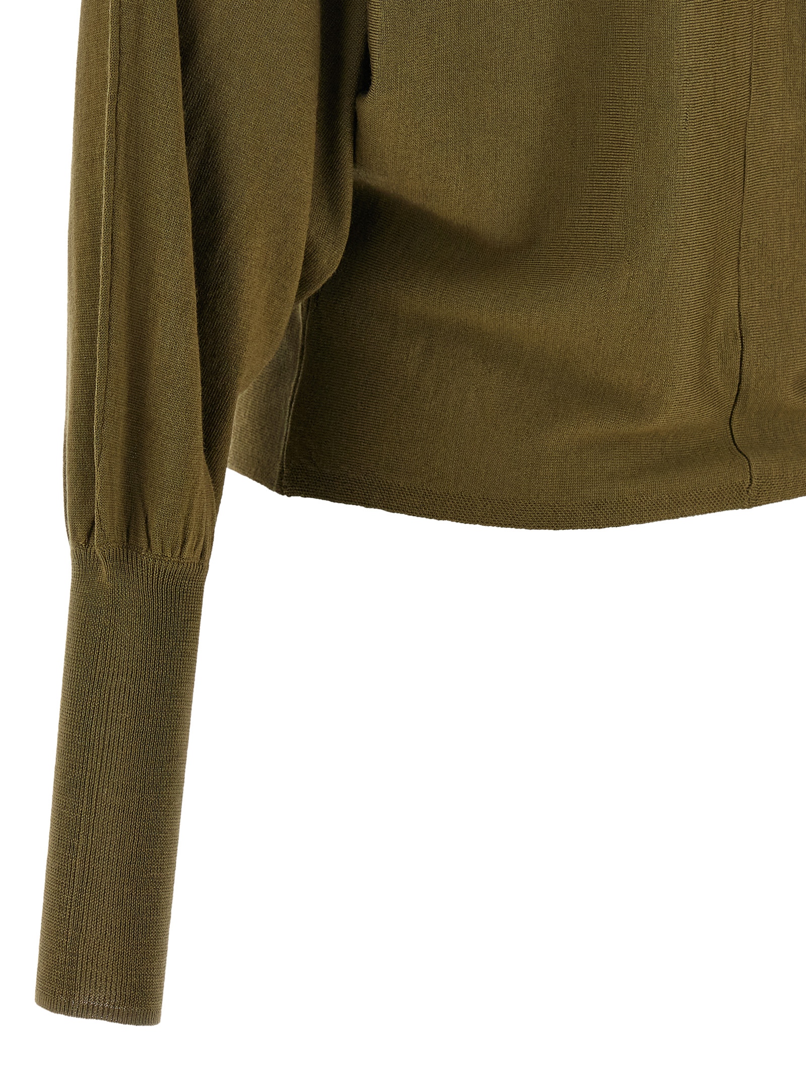 Wool, crewneck sweater with long wide bat sleeves with cuffs.
