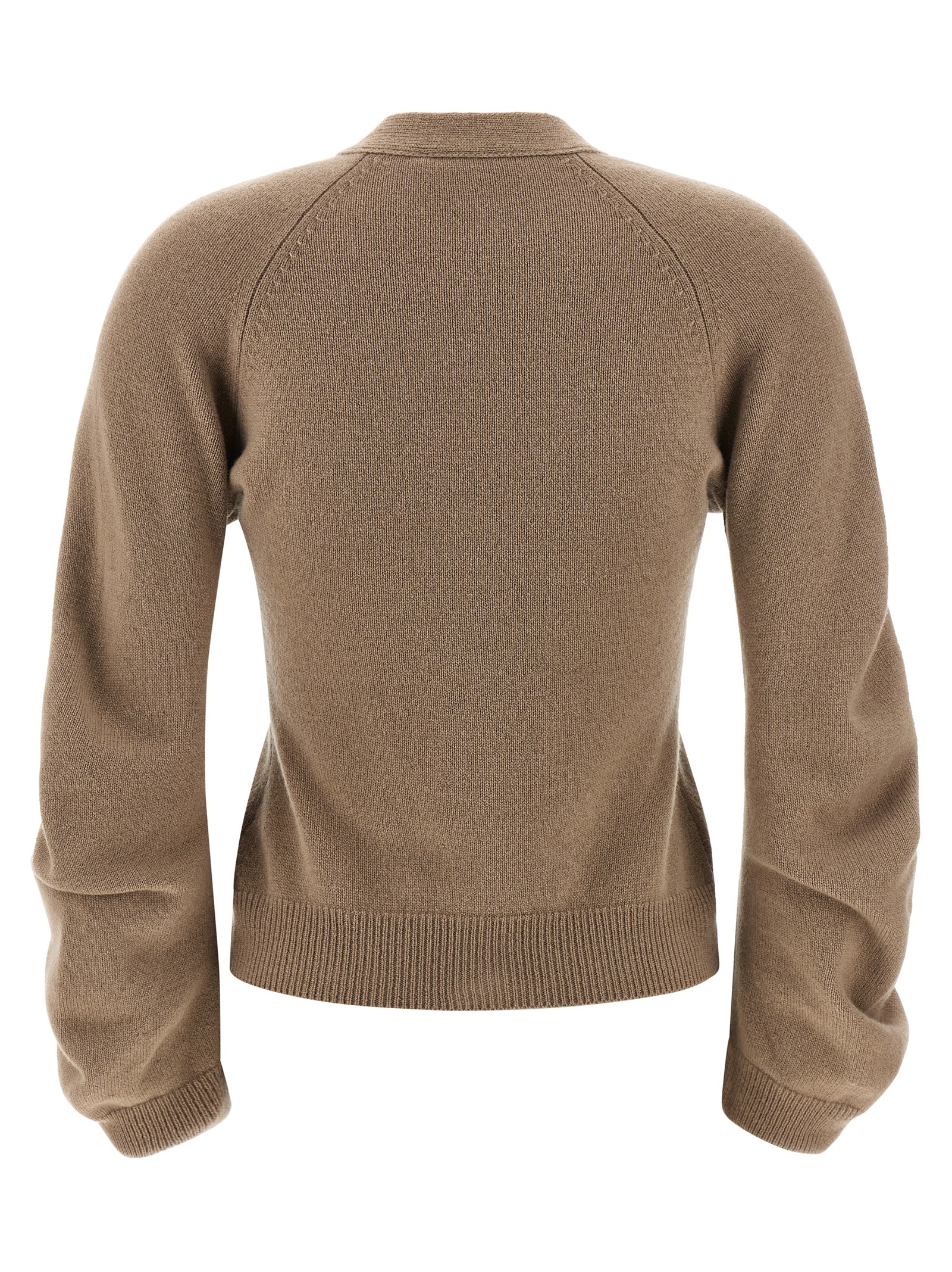 Virgin wool cardigan with V-neck, front button closure, long cuffed sleeves and a curved silhouette.