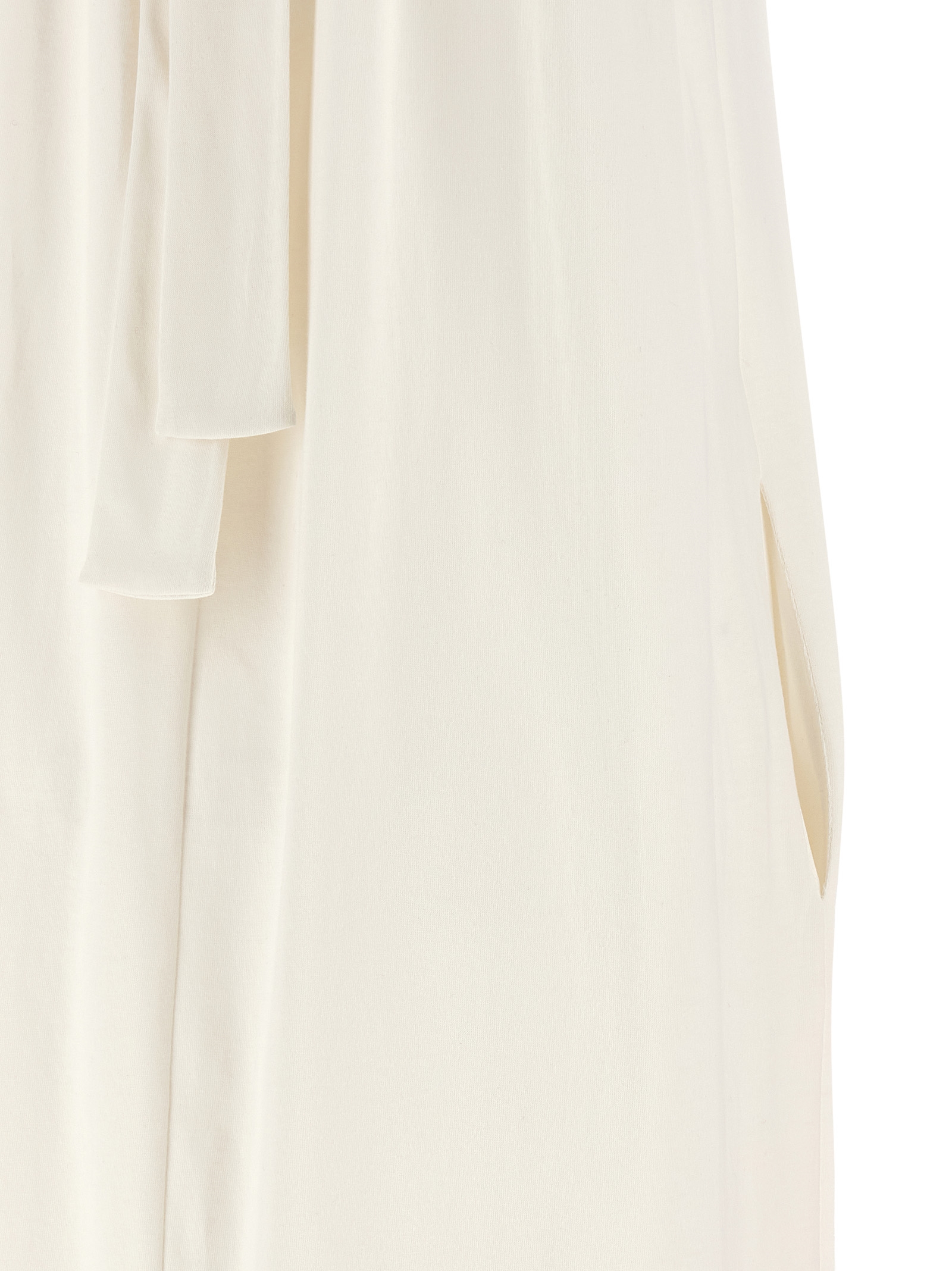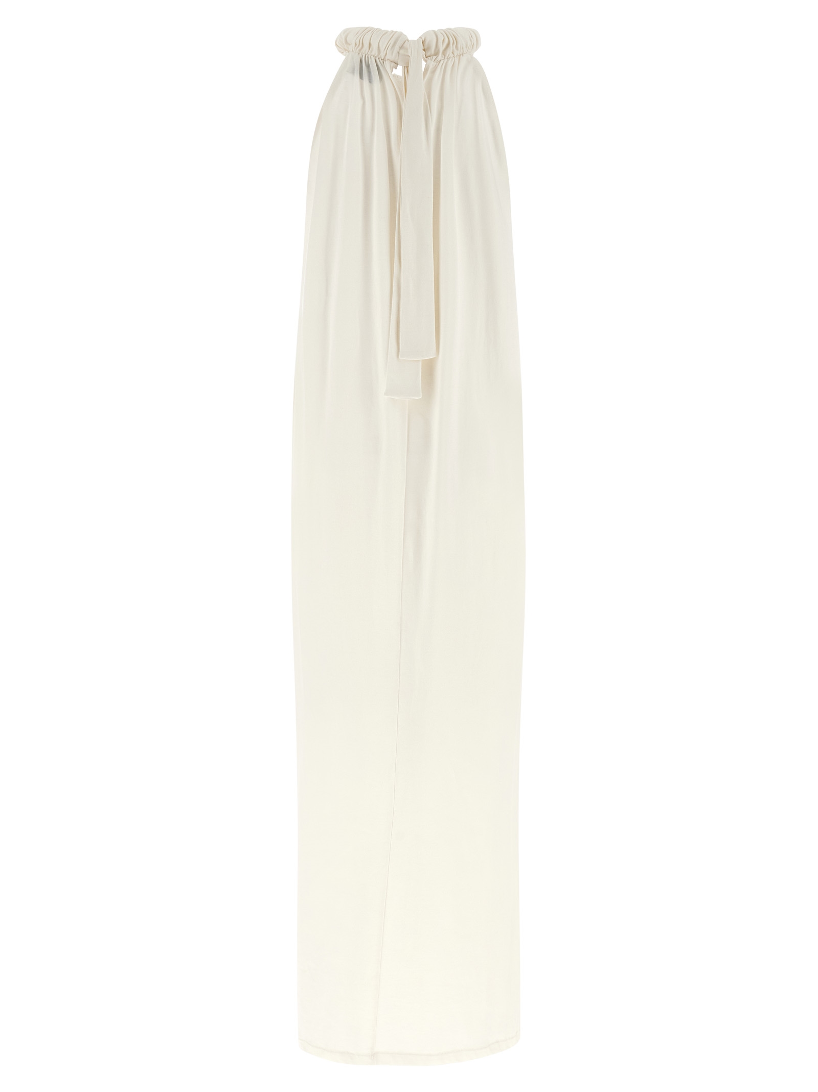 Длинное хлопковое трикотажное платье в пол с американским вырезом горловины, украшенное завитками и трикотажной тесьмой, завязанной узлом сзади, V-образным вырезом сзади, без рукавов.