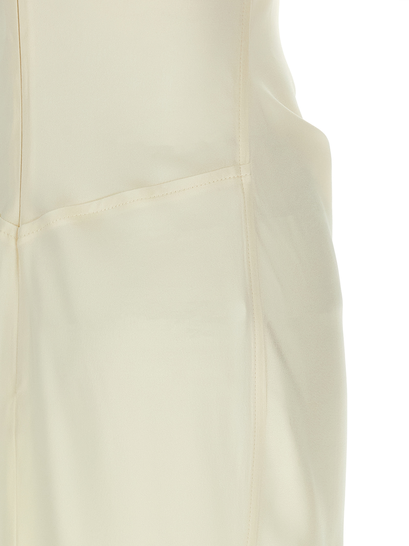 Long satin dress Isabella tight at the waist with front draping detail and back V-stitching, mermaid silhouette skirt, front and back V-neck, short sleeves with cut-out, back zip closure.