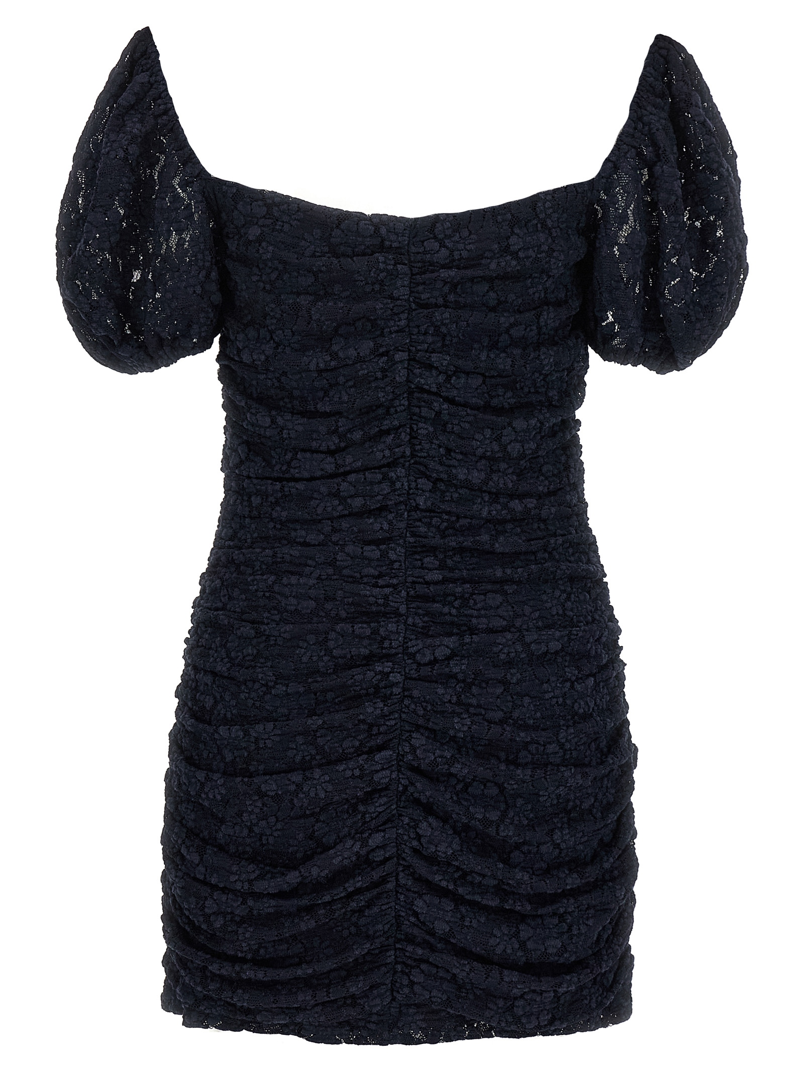Lace mini dress, front and back neckline, short puff sleeves with elastic, side zip closure, front and back and side curls.