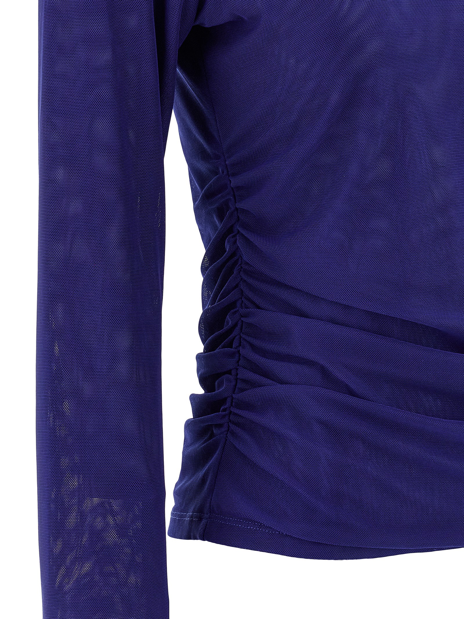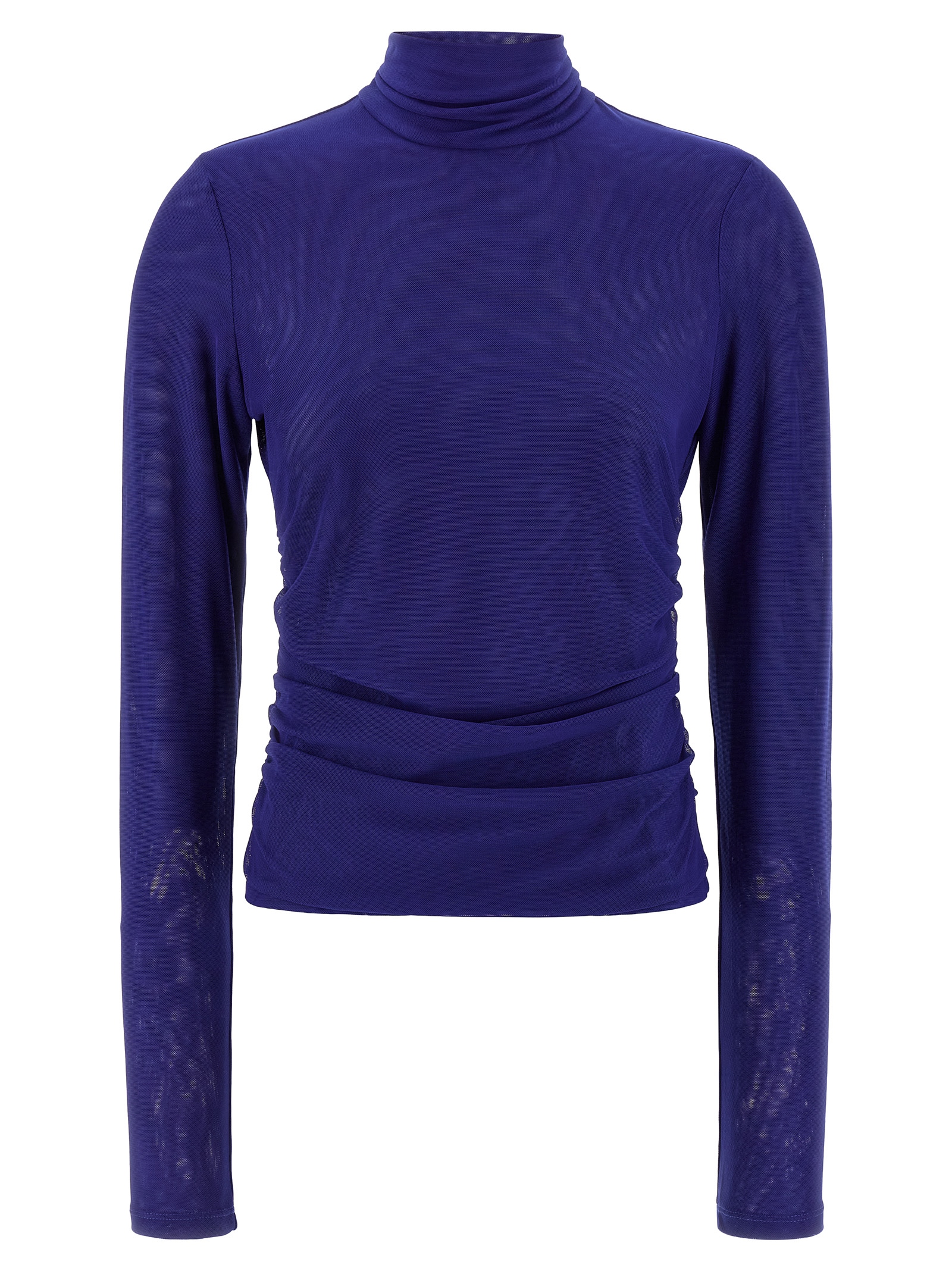 'Mesh Rouched' double layer semi-transparent mesh sweater, high neck, side curls, long sleeves.