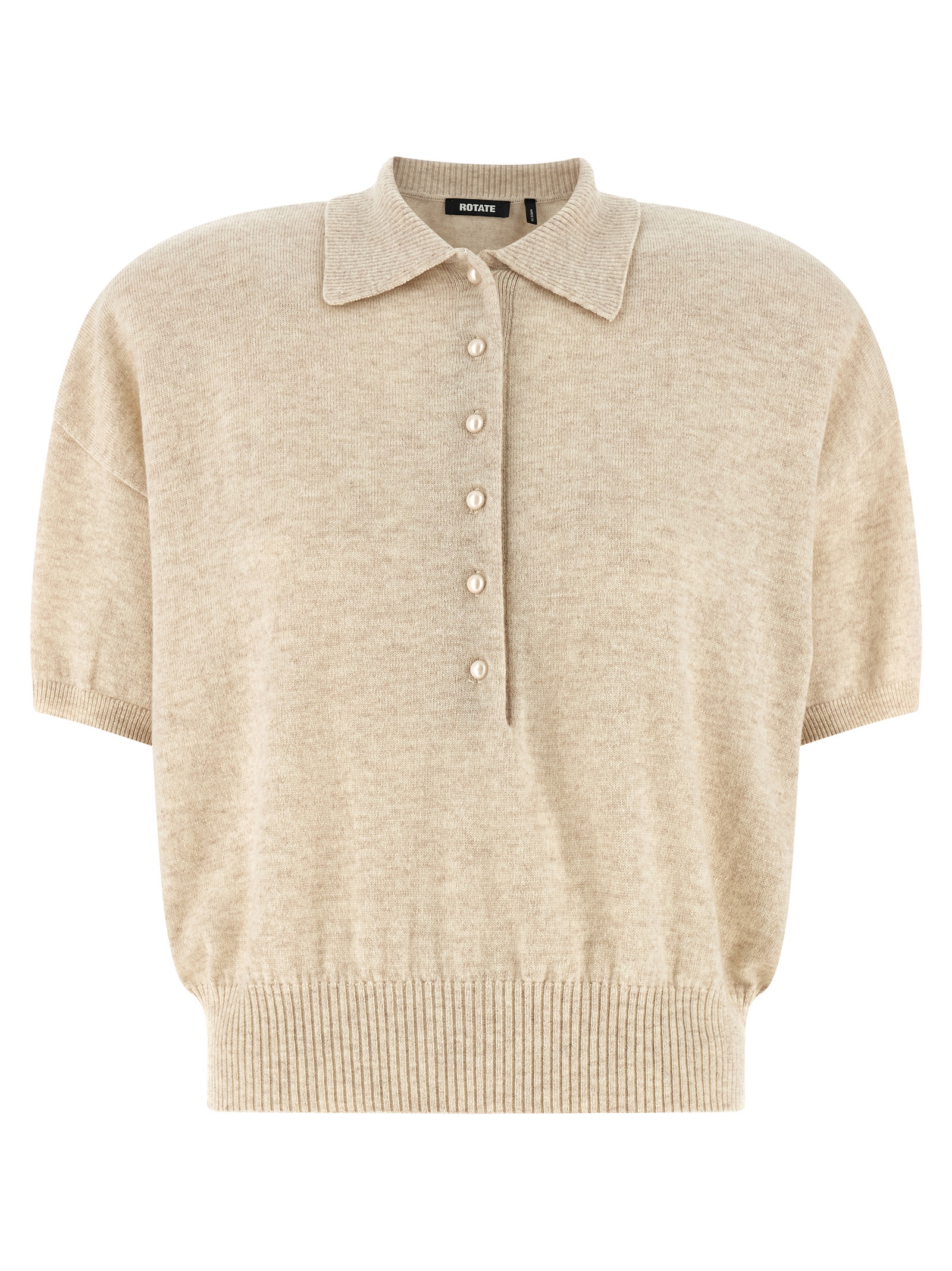 Crop knit wool and cashmere polo shirt, pearl collar and buttons, short sleeves with cuffs and dropped shoulder, removable padded shoulder, and headband on the hem.