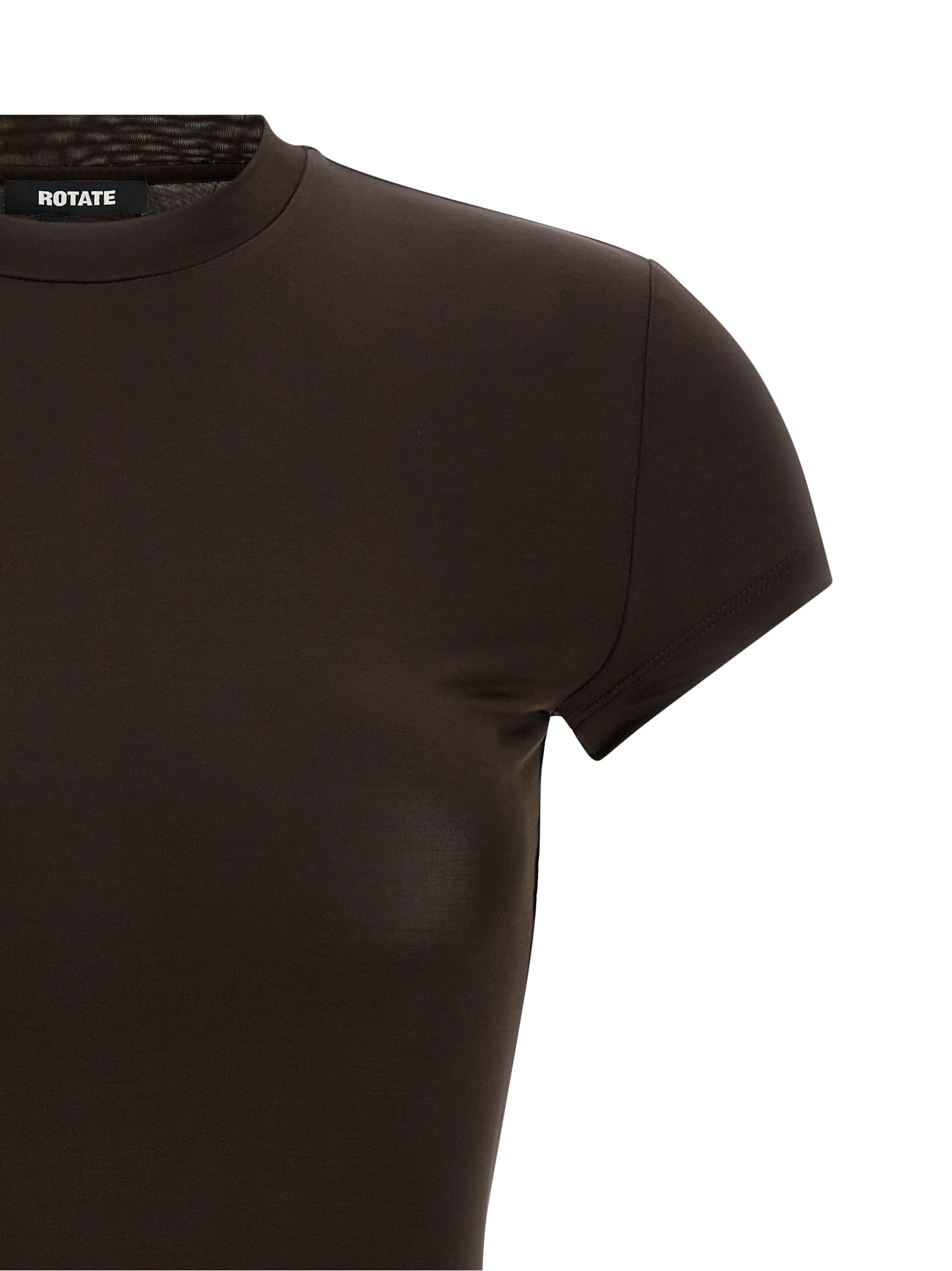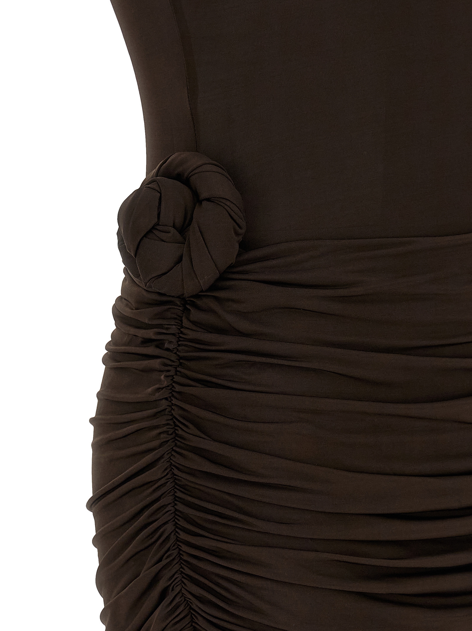 Mini dress in stretch viscose jersey, t-shirt model with curled and draped insert for the skirt, tone-on-tone floral detail on the side, crew neck, short sleeves.