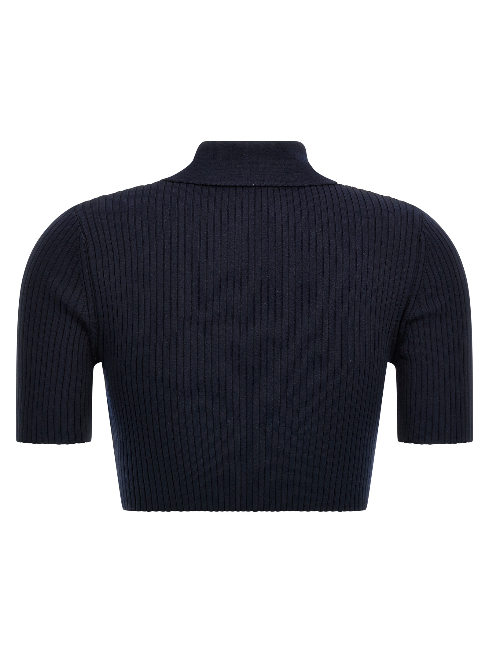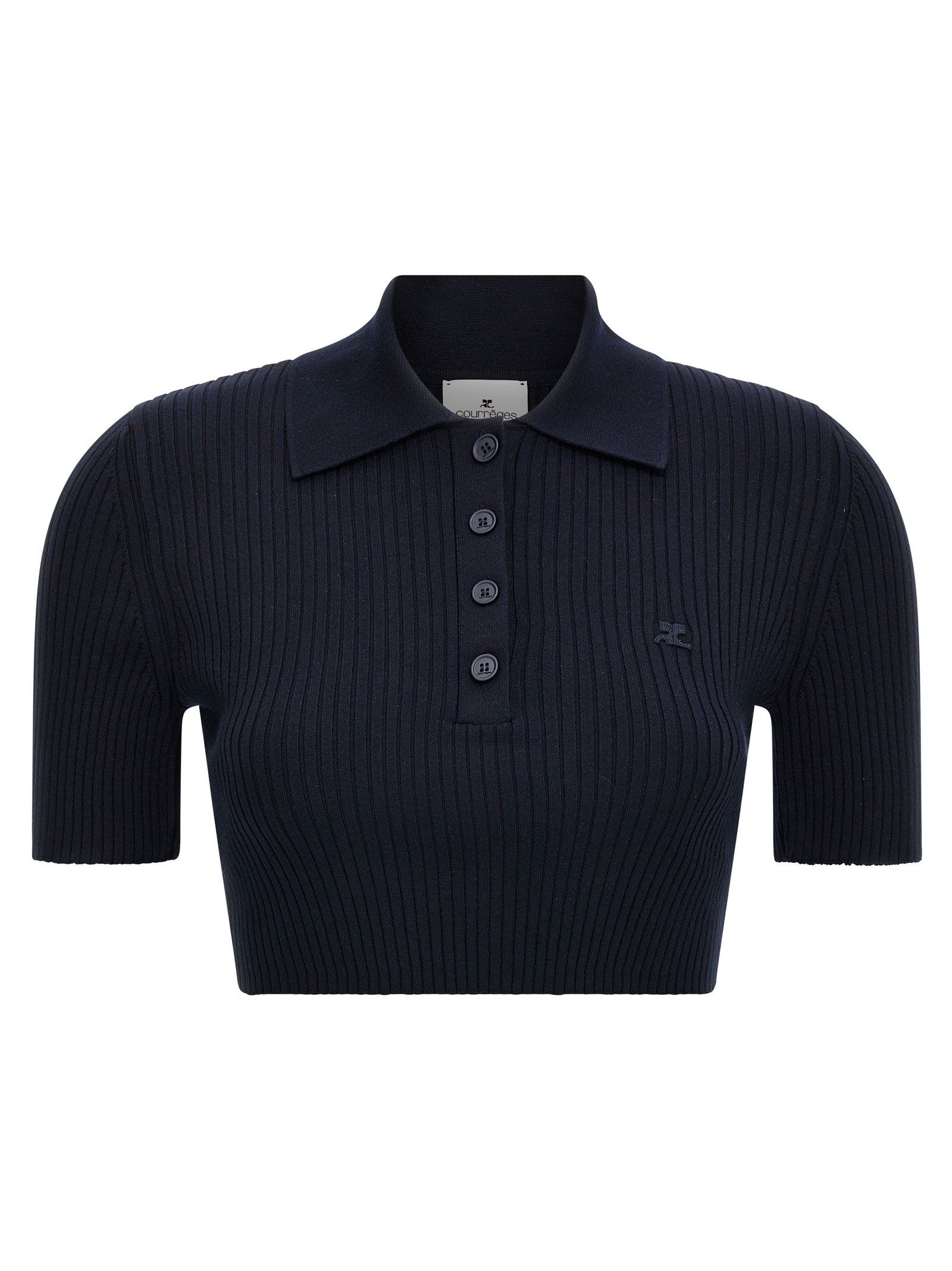 Stretch ribbed viscose blend polo shirt with crop style, tone-on-tone front logo patch, collar and buttons, short sleeves, raw cut hem.