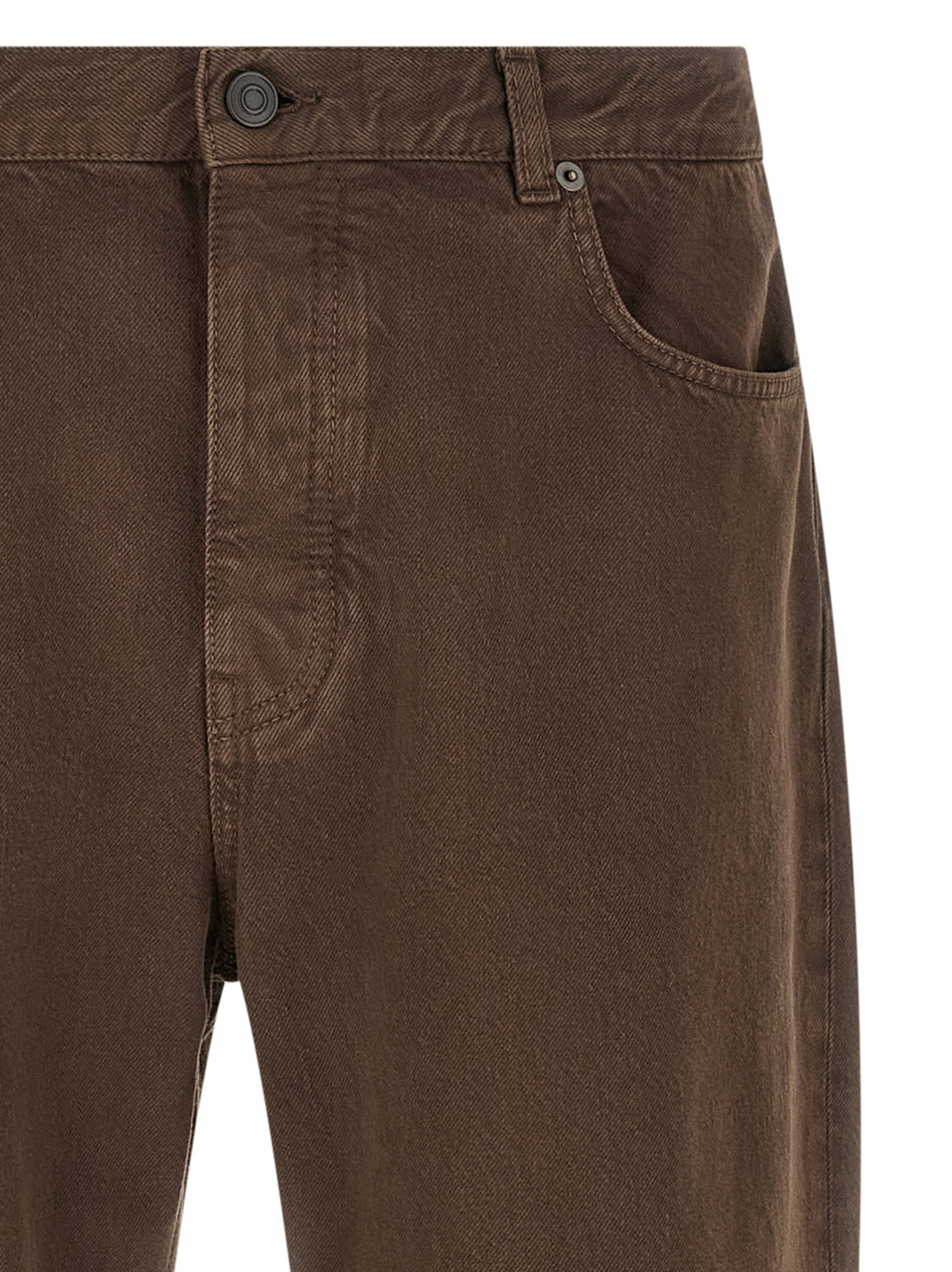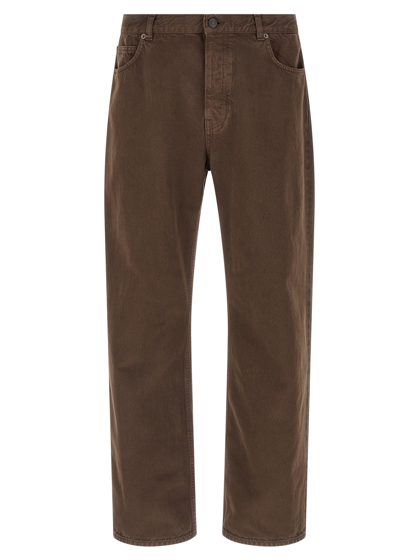 Dyed cotton denim jeans, 5-pocket model with medium waist and straight leg, front zip and button closure. Fabric dyed with the traditional method and subjected to stonewashing, any shades of color are to be considered a characteristic that develops character over time.