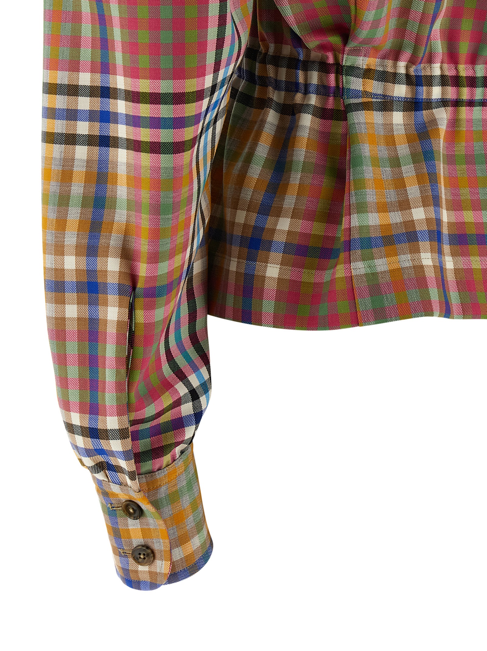 'Vase Ensemble' lightweight Heather Check wool blazer jacket, high neck with button closure and front teardrop cut-out detail, single-breasted style with two-button closure, elastic waistband, long wide sleeves with cuffs.