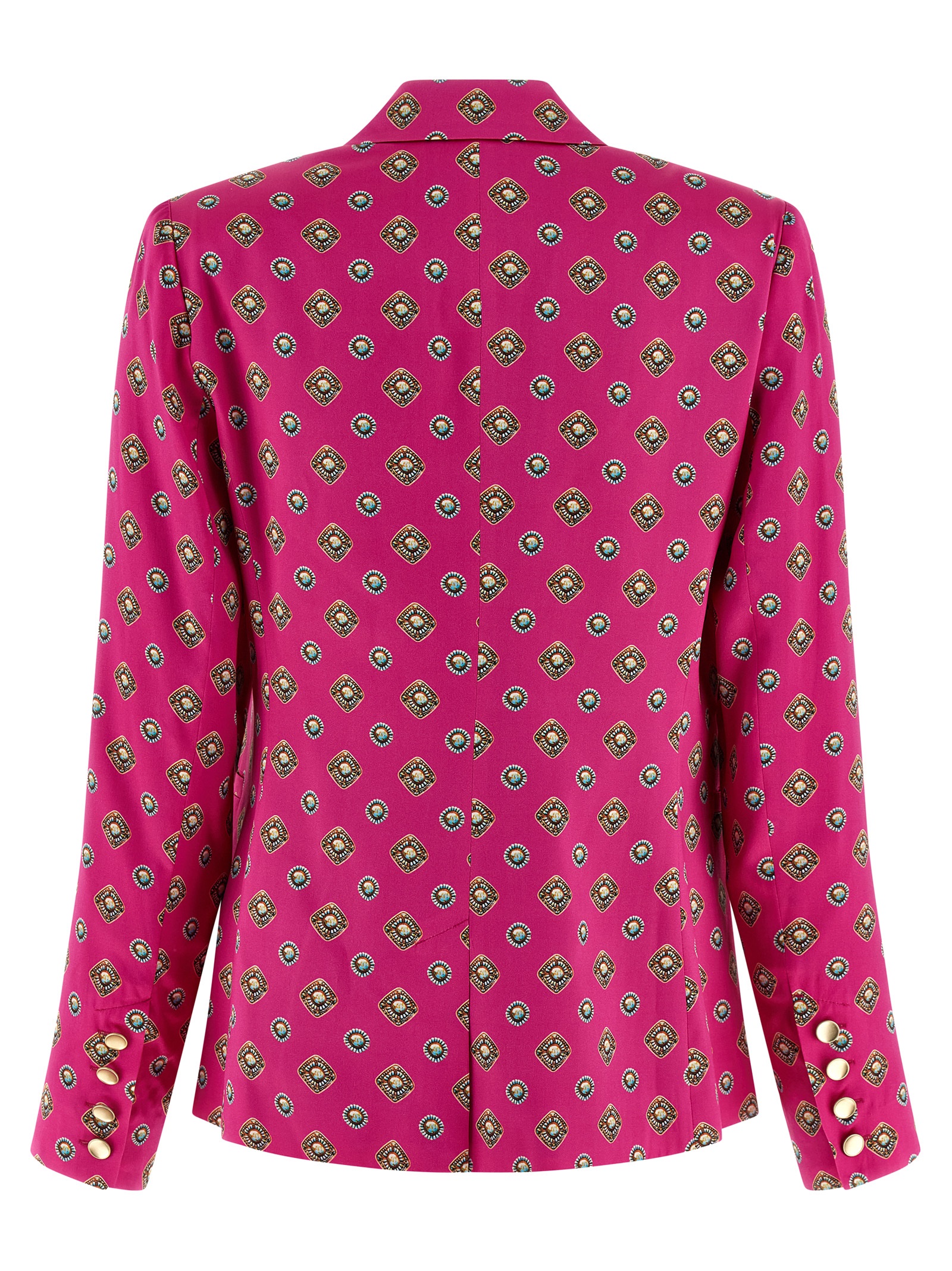 'Colin' silk blazer charmeuse with south-western inspiration, lining, double-breasted style with front metal button closure, mirror lapels, patch pockets, padded shoulder, long sleeves, back vent.
