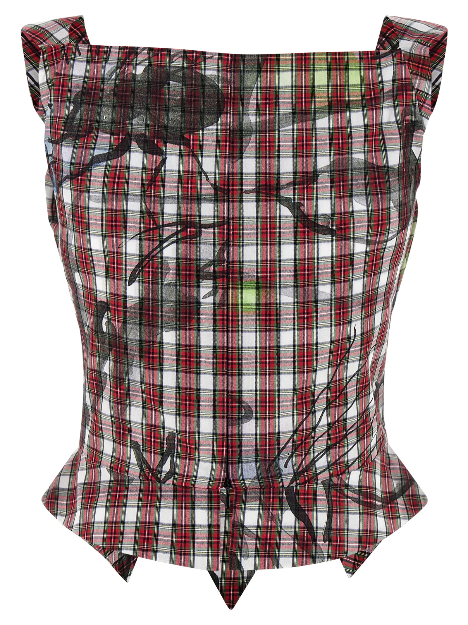 Хлопковый топ в клетку Sunday с принтом, имитирующим рисунки Доминика Майатта, корсетный крой, широкий круглый вырез с драпировкой, вышивка логотипа Orb спереди, широкие бретели, застежка-молния сзади и асимметричный подол.Характеристики товара