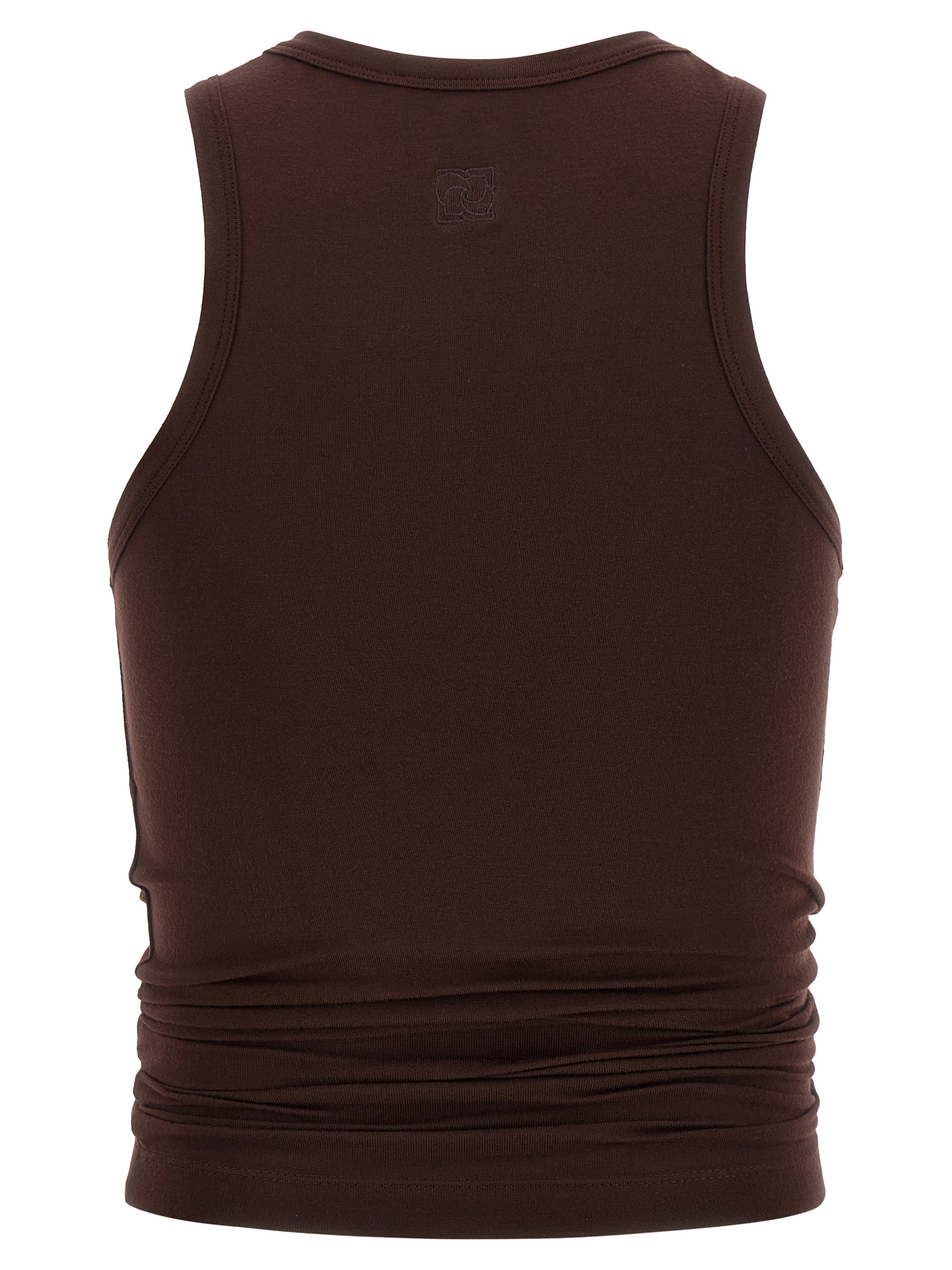 Топ из эластичного хлопка модели «05», скульптурная драпировка, созданная переплетенными боковыми панелями, с декоративным узлом спереди, круглый вырез, асимметричный подол.