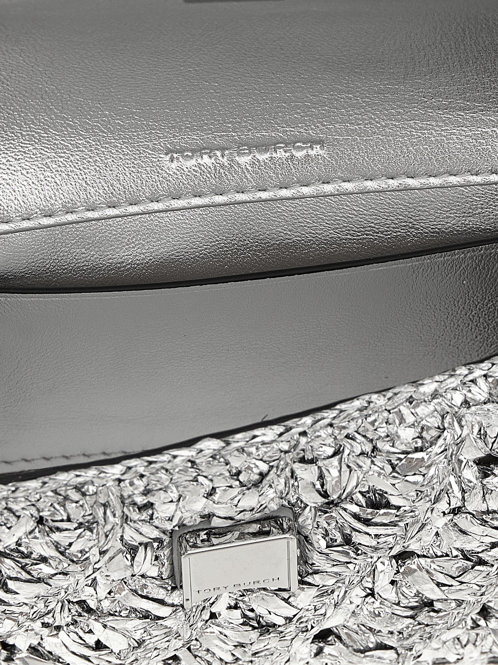 'Kira' mini shoulder bag in hand-crocheted metallic nylon with leather details, magnetic flap closure with front metal logo appliqué, sliding chain shoulder strap.