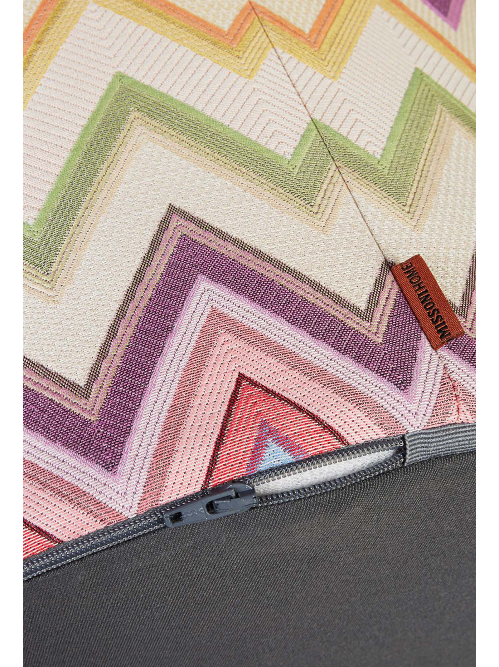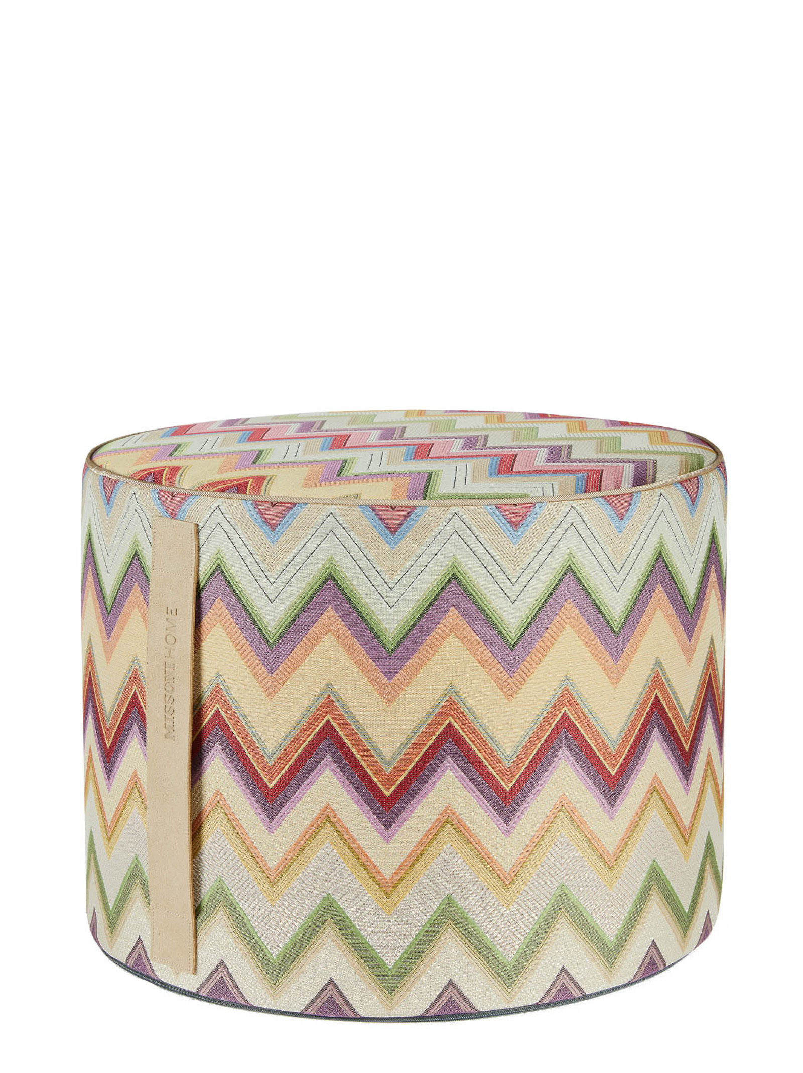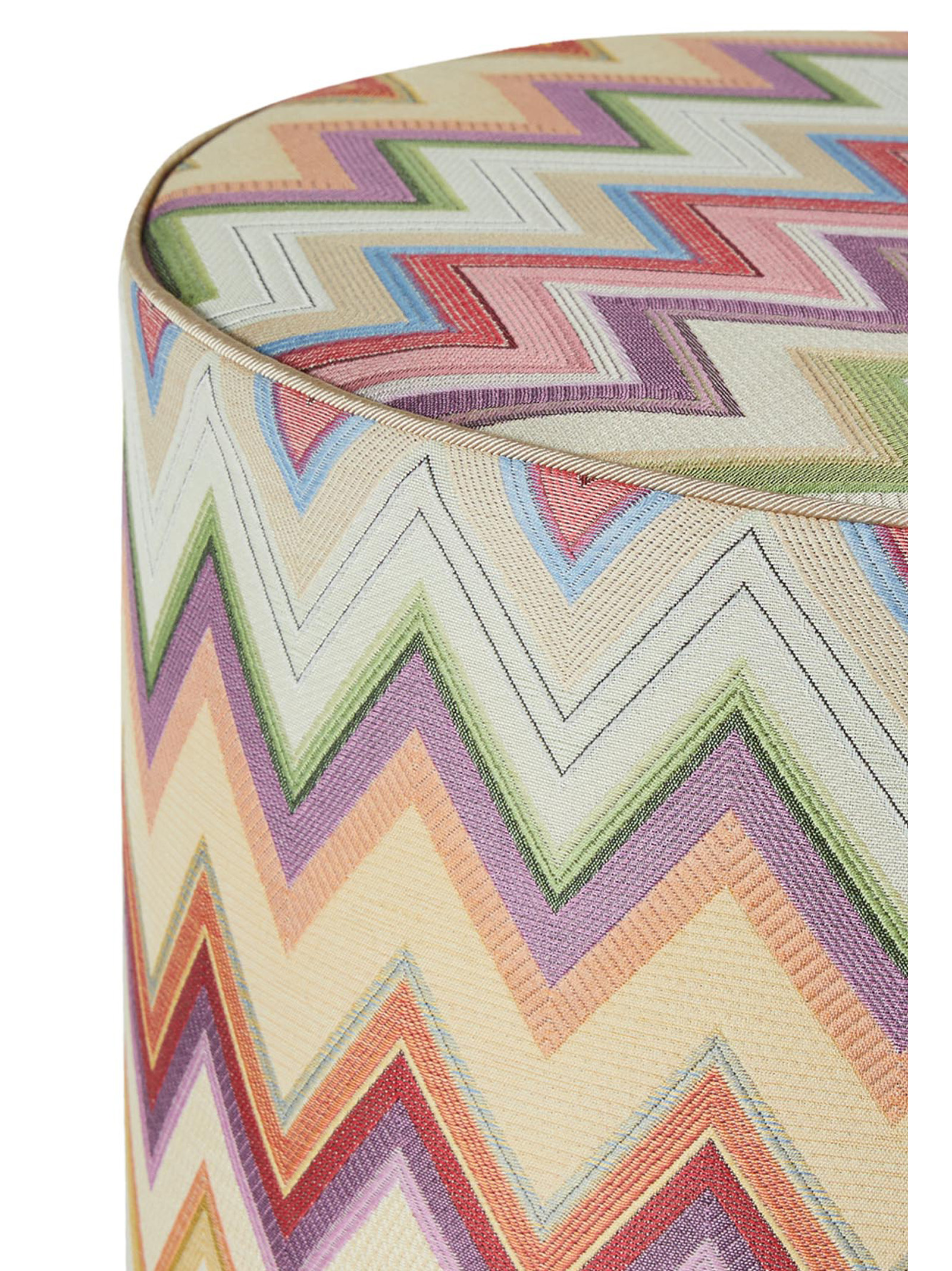 It stands out for a surface that is rather textural to the touch, enriched by the iconic maxi-chevron by which MissoniHome interprets the Agadir cylinder in a palette of delicate, almost subdued tones The cover in a cotton-blend jacquard fabric, with a zig-zag pattern in pastel shades and a suede handle is removable.