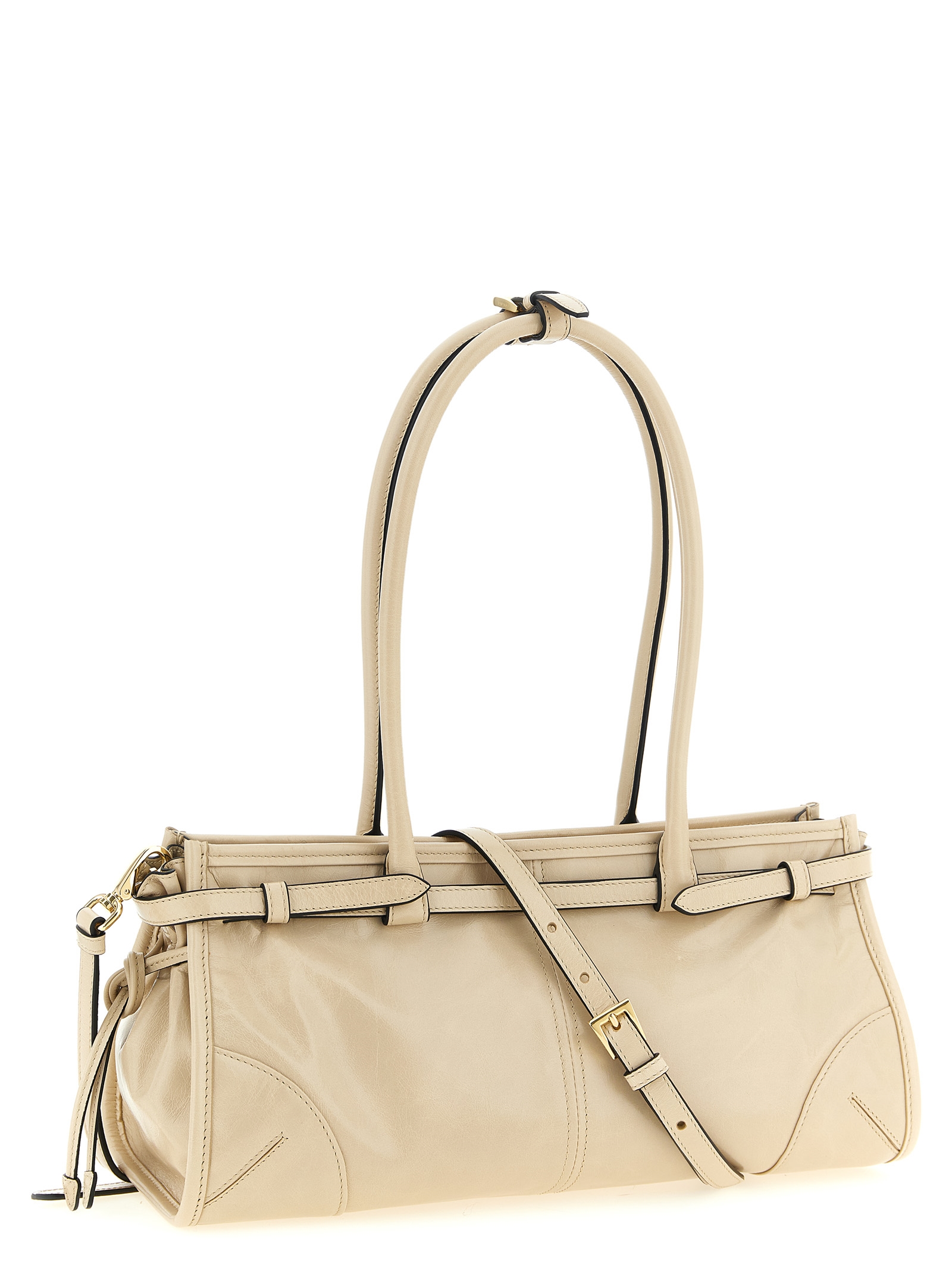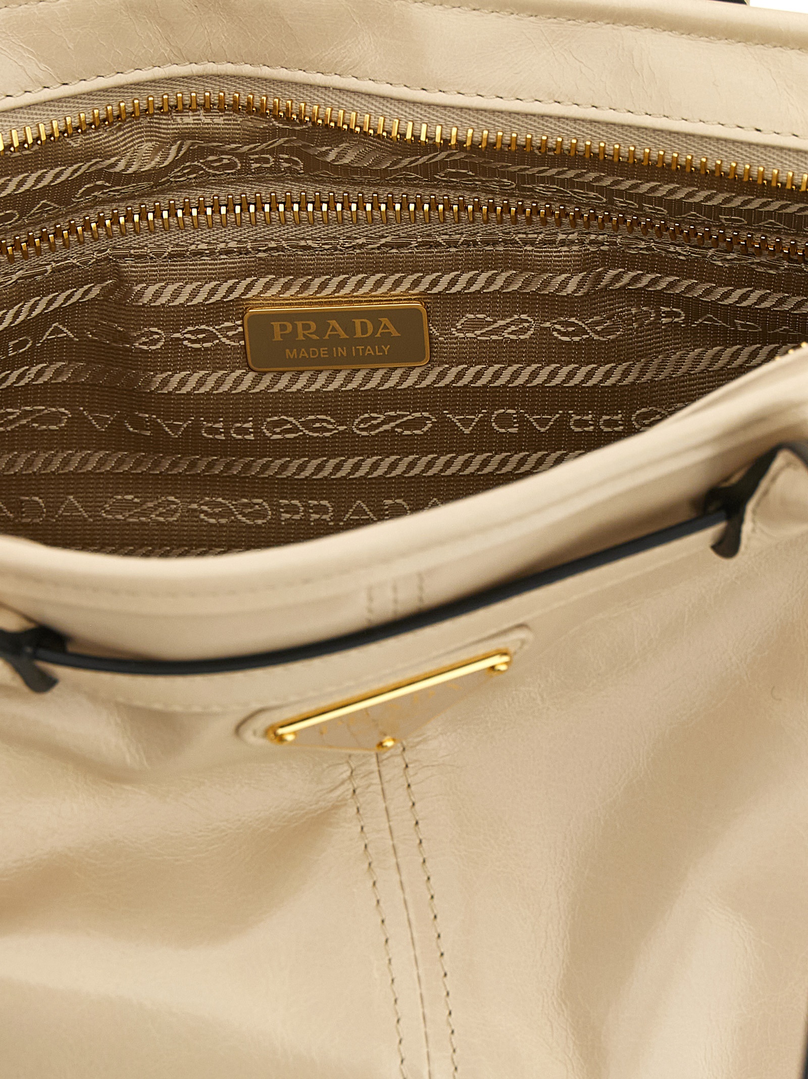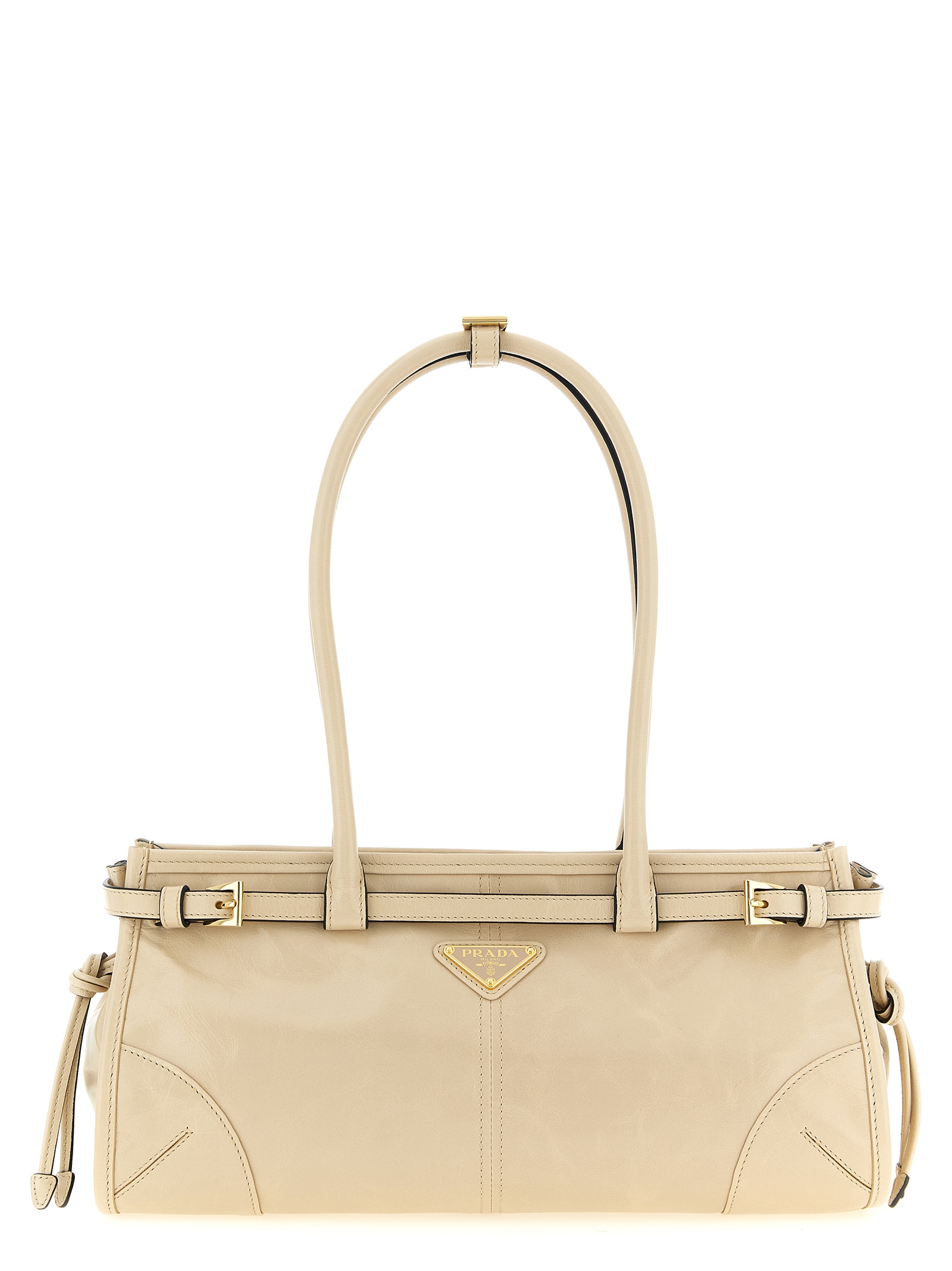 'Prada Bonnie' leather handbag with polished finish, rectangular silhouette, front enameled metal triangle logo, adjustable strap detail, side drawstrings, double fixed tubular handle, top zip closure, nappa and nylon lining, adjustable and removable shoulder strap.