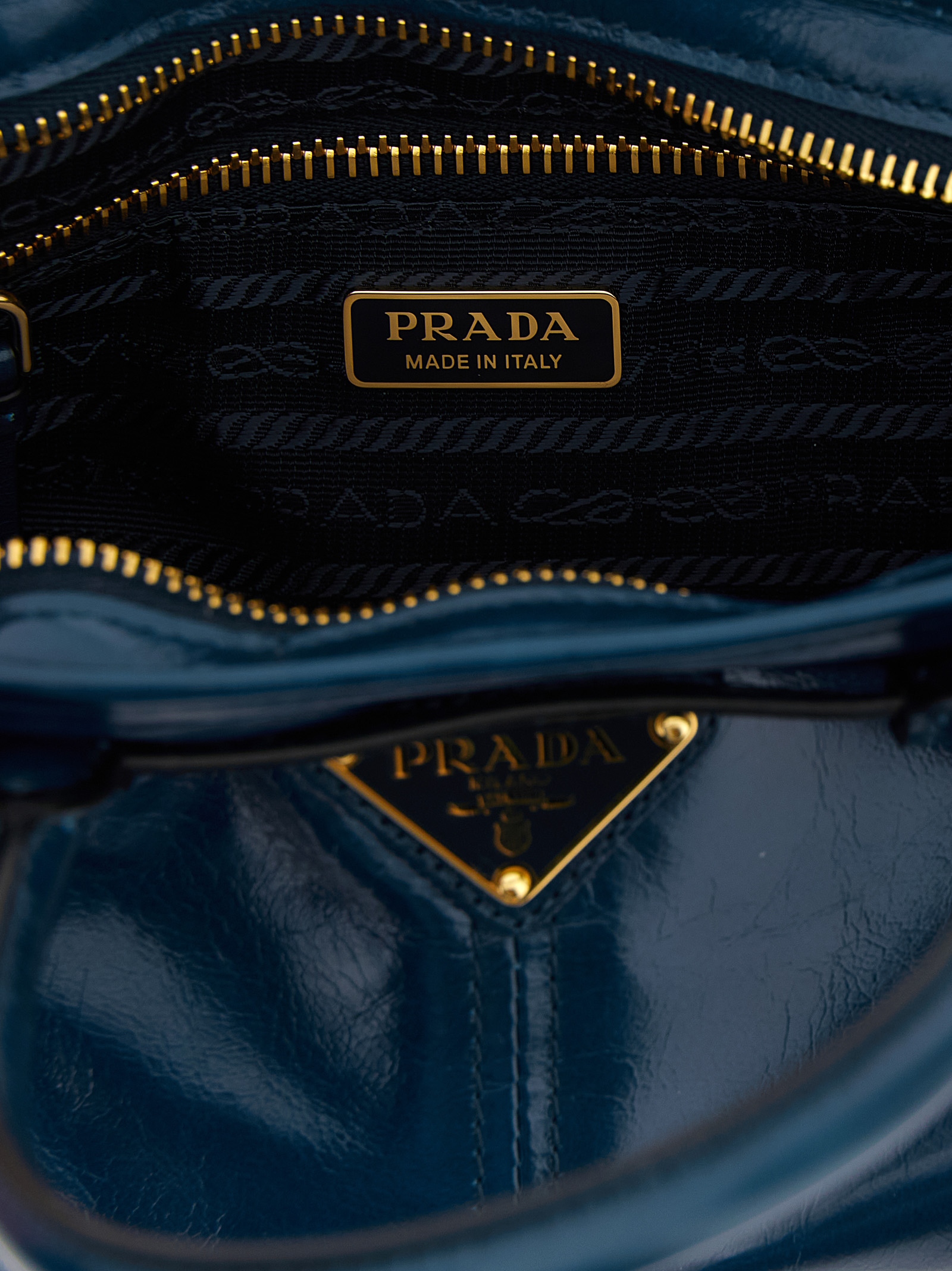 'Bonnie' mini leather handbag with brilliant finish, fixed leather handles, zip closure, adjustable and removable shoulder strap, strap with gold metal finish, enameled triangle front logo.