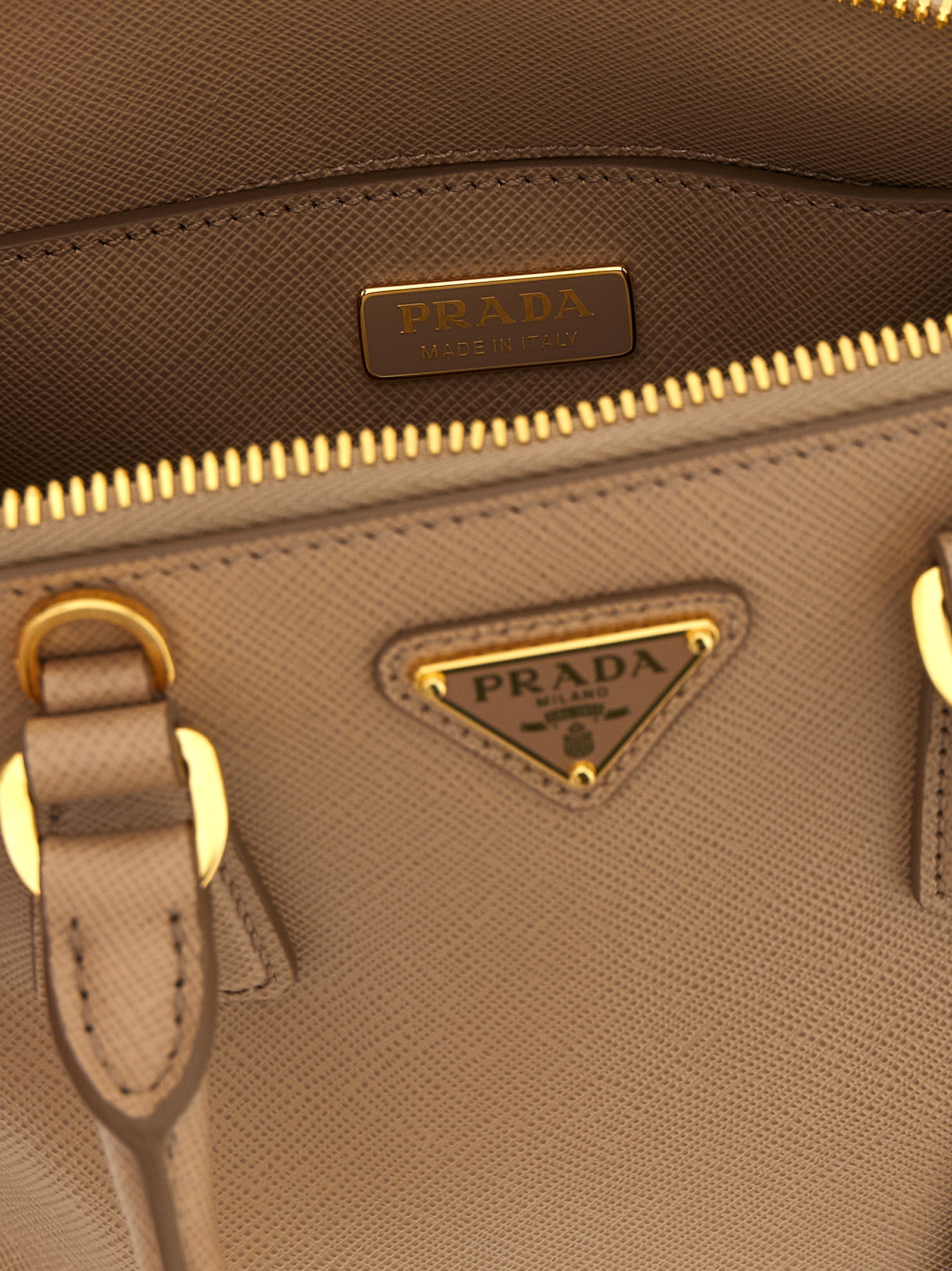 Lux saffiano leather handbag with fixed leather handles, adjustable and removable leather shoulder strap, zip closure, front logo.