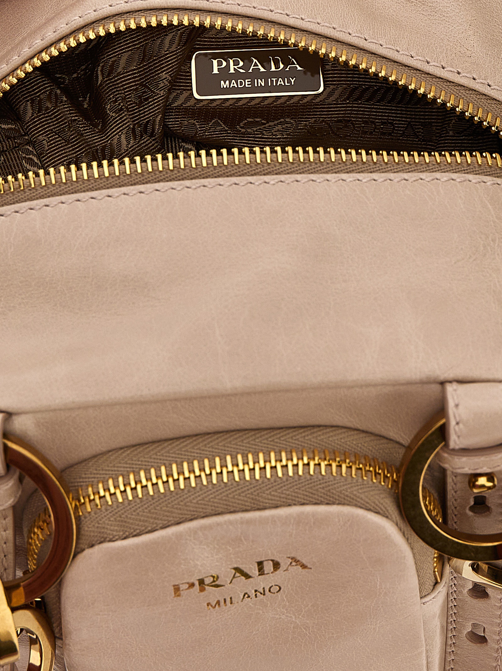 'Dangle' mini leather top case, cubic shape, vintage-effect leather, antique metal trim, front zip pocket, handles, zip closure.