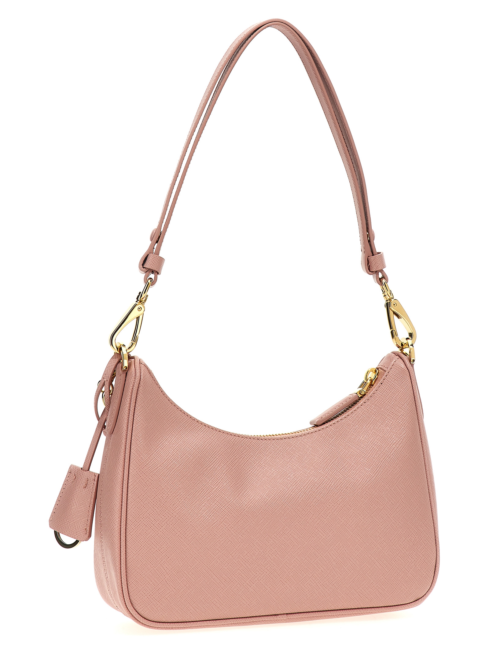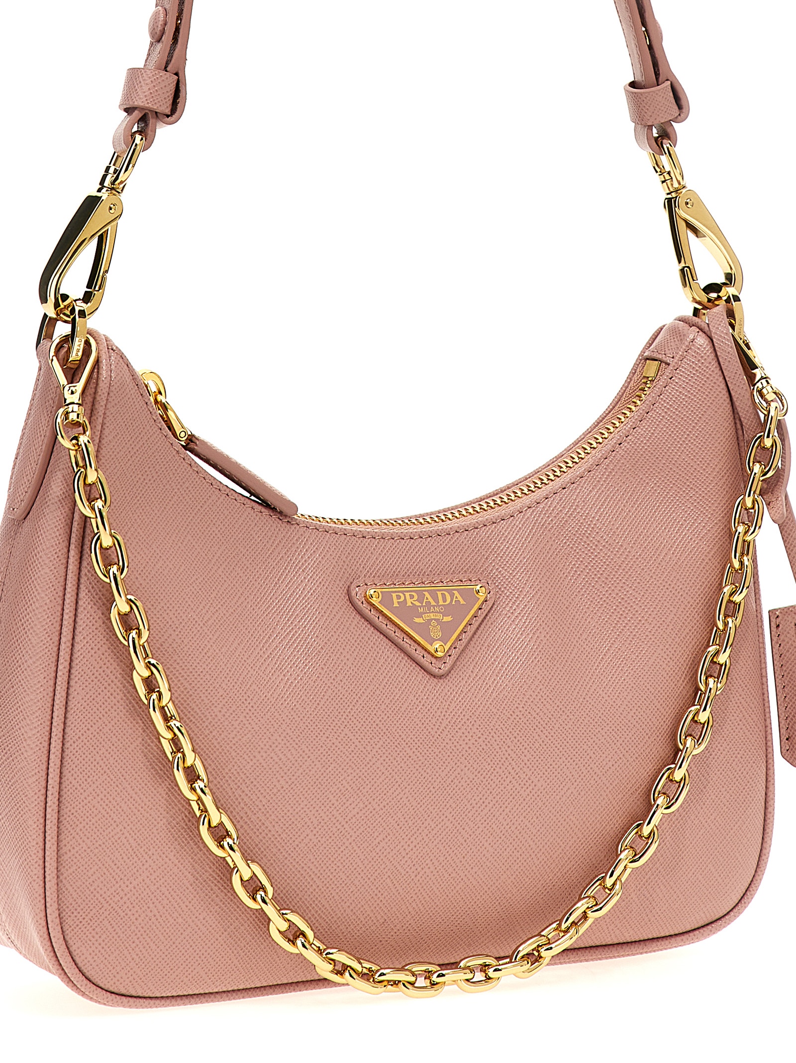 'Re-Edition' mini shoulder bag in Saffiano leather with zip closure, removable leather handle, removable chain handle, front enameled metal triangle logo, and removable leather and metal key ring.