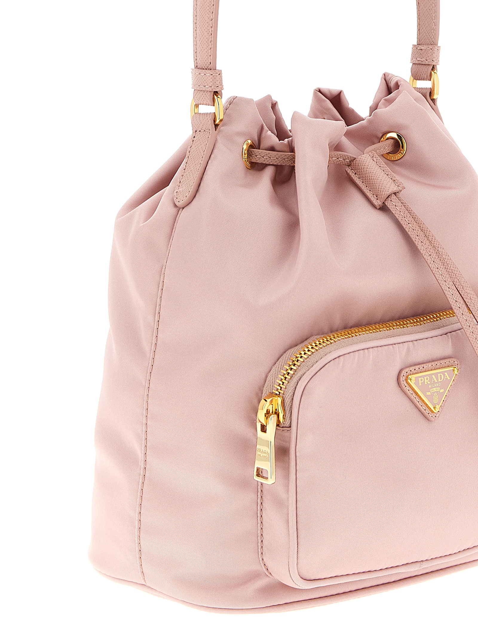 'Prada Duet' Re-Nylon and Saffiano leather tone-on-tone bucket bag, zip pocket and front enameled metal triangle logo, fixed handle, drawstring closure, signed Re-Nylon lining, adjustable and removable shoulder strap. SUSTAINABLE: This product is made with Re-Nylon, a regenerated yarn made from recycled and purified plastic collected in oceans, fishery nets and textile fibers.